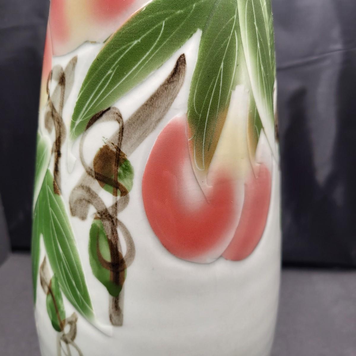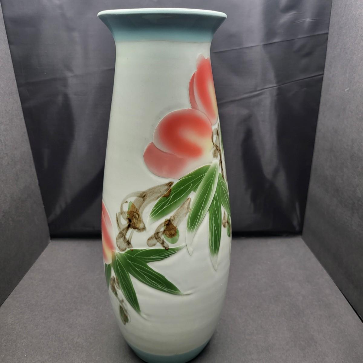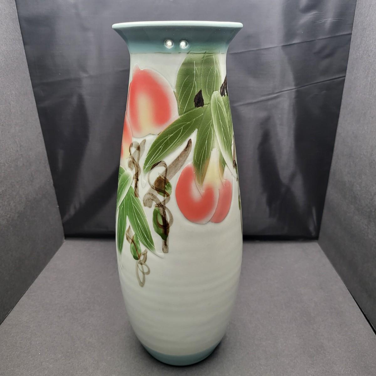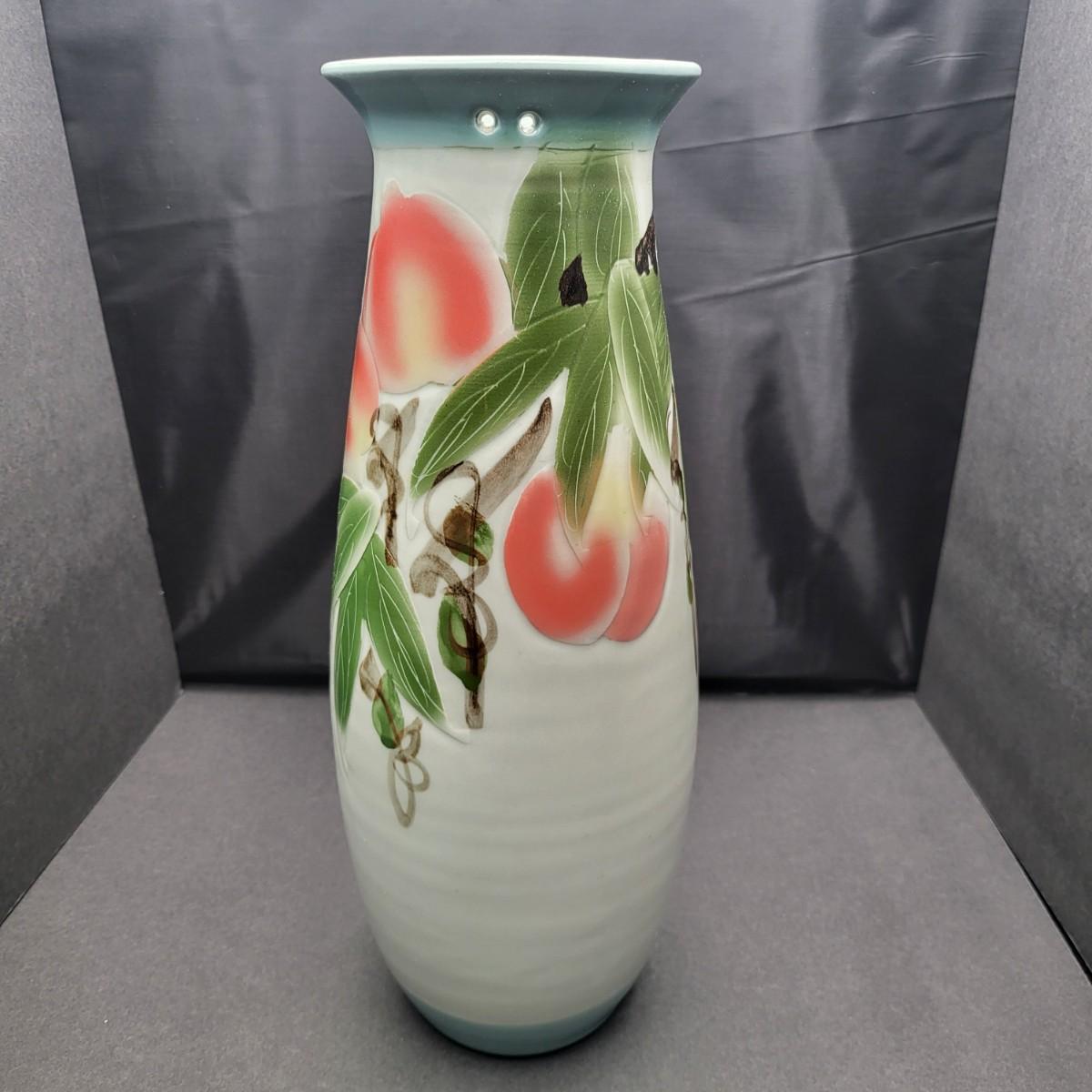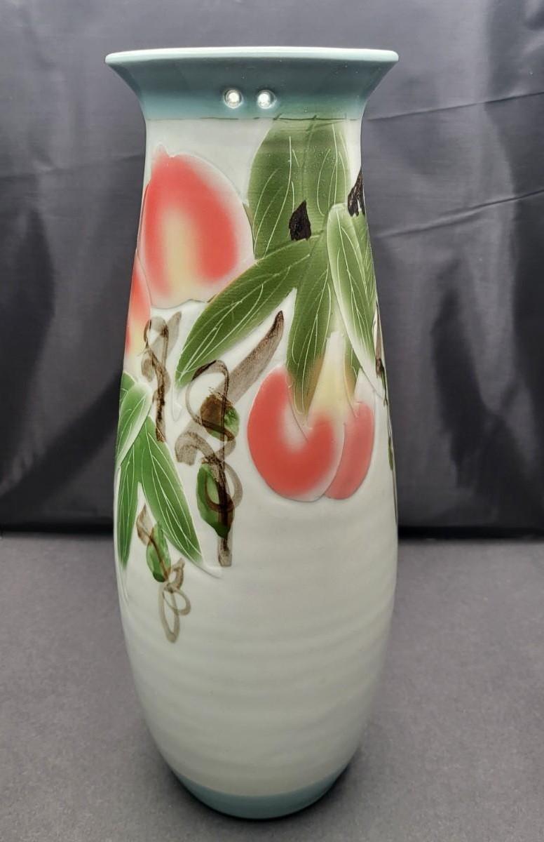 Hand spun, hand painted peaches & leaves, glazed vase, 15" tall. Has Asian marking on side (unknown what it says). Item is not available for shipping.