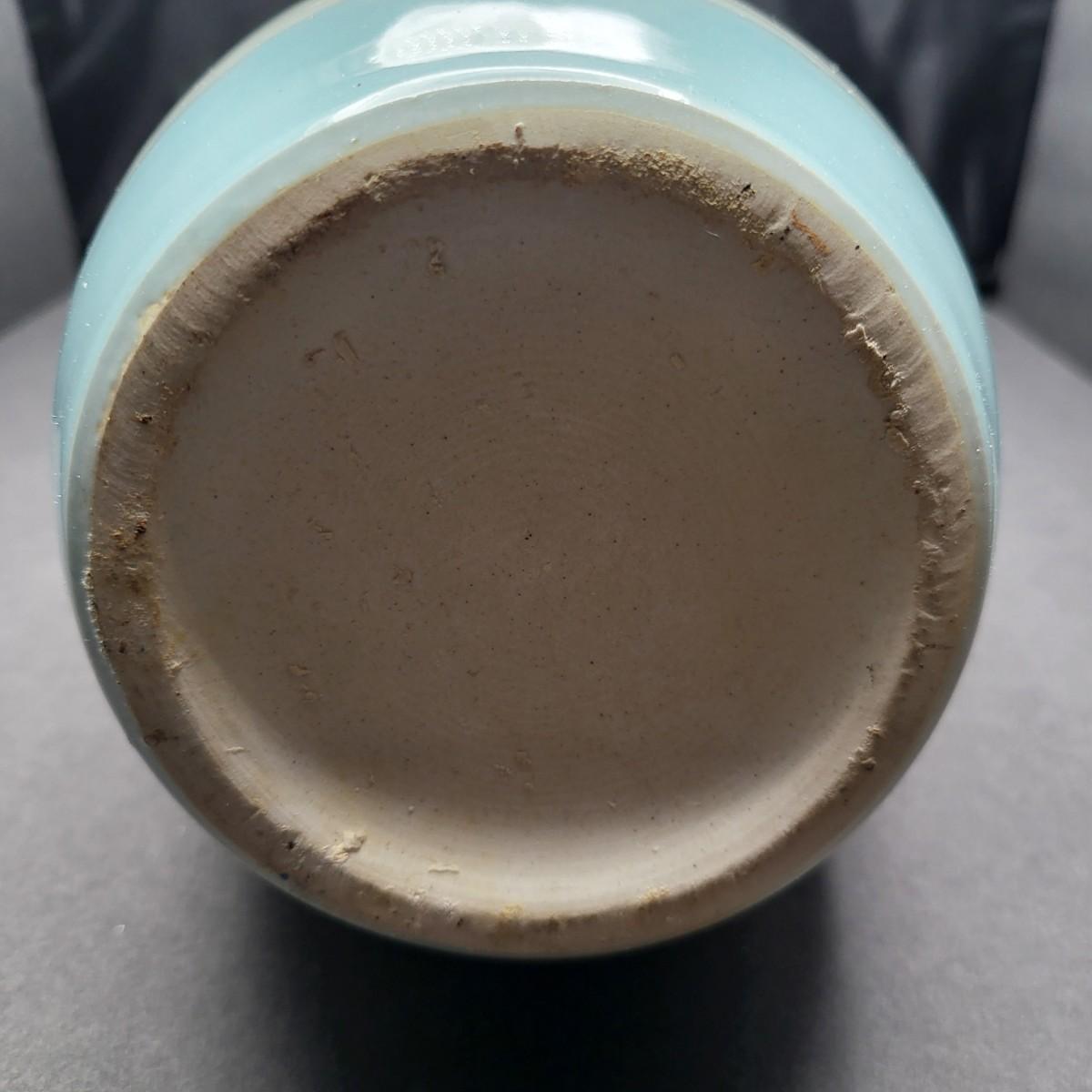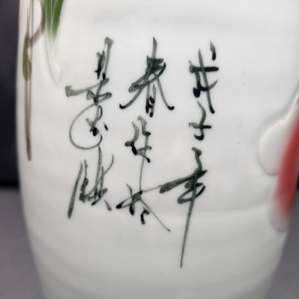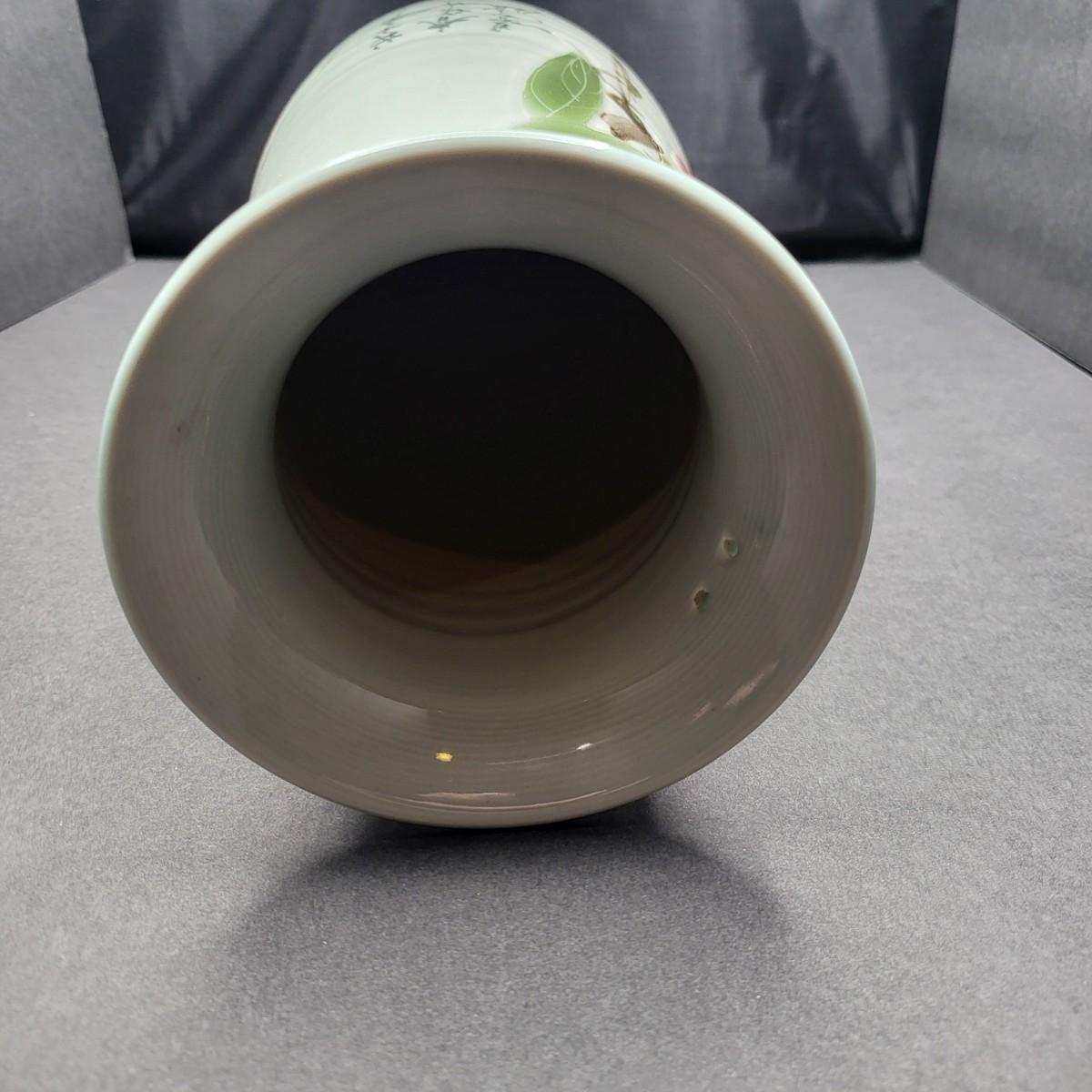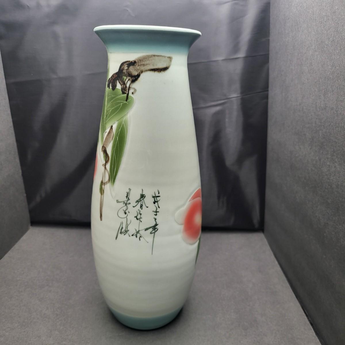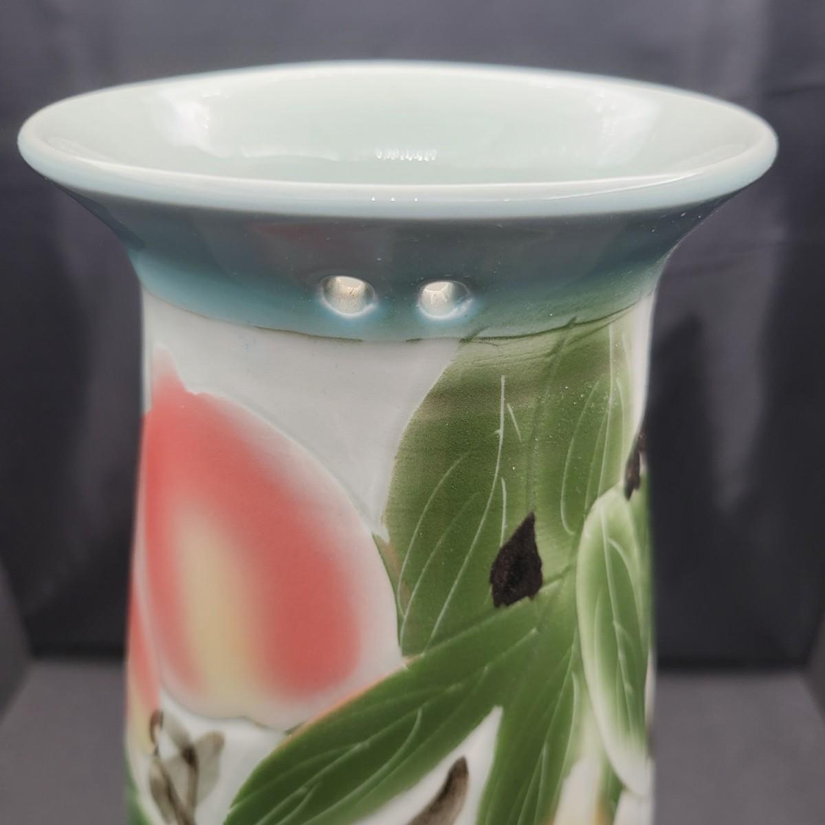 Hand spun, hand painted peaches & leaves, glazed vase, 15" tall. Has Asian marking on side (unknown what it says). Item is not available for shipping.