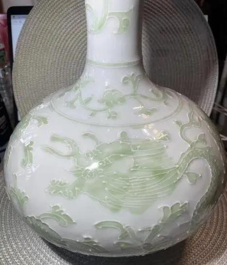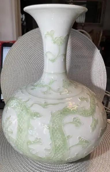 Vintage Chinese Qianlong Blue Under Glazed Mark Celadon Green & White 12" Dragon Lotus Vase in VG Preowned Condition.