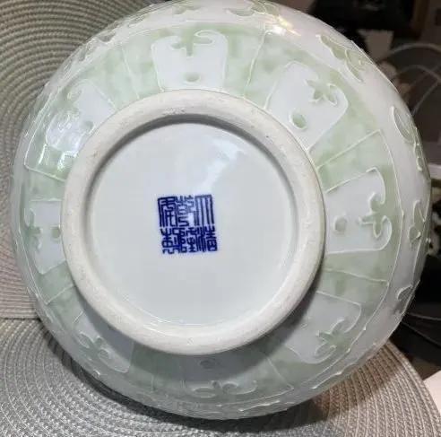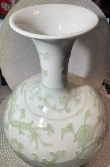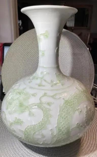 Vintage Chinese Qianlong Blue Under Glazed Mark Celadon Green & White 12" Dragon Lotus Vase in VG Preowned Condition. $15 Domestic Shipping.