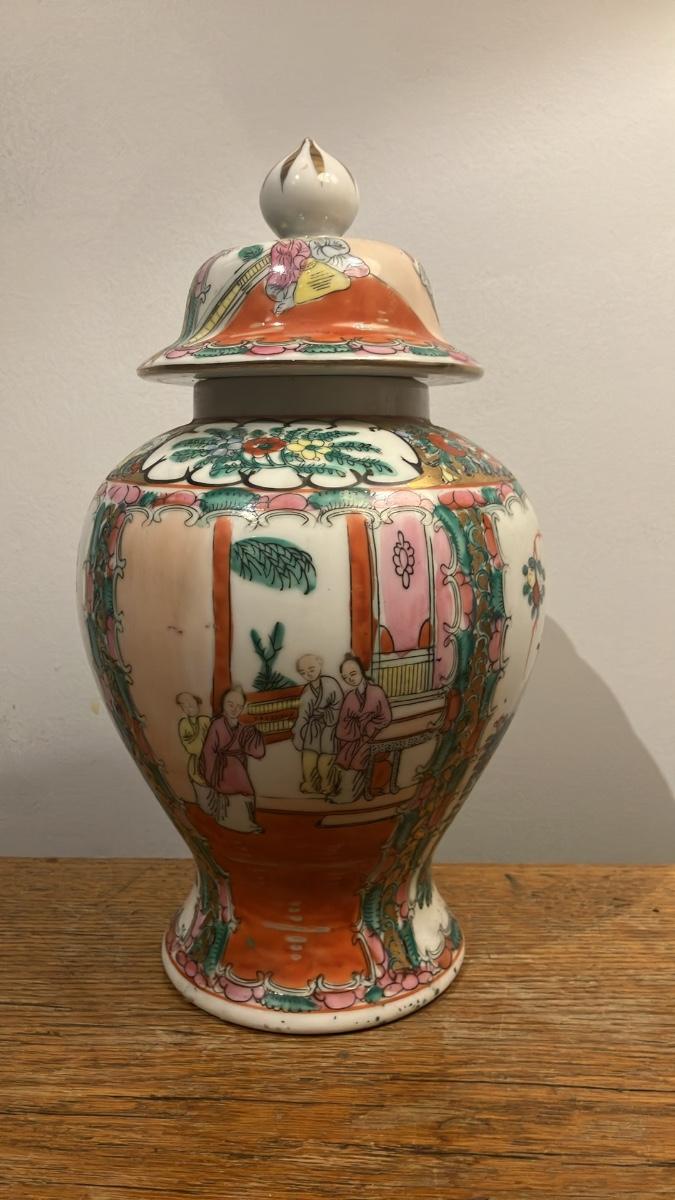Beautiful vintage Chinese export porcelain ginger jar (or vase) in the classic Rose Medallion pattern with famille rose enamels. Features vibrant hand-painted panels of courtly figures, birds, butterflies, flowers, and fruits symbolizing longevity and abundance. Overglaze colors in pink, green, gold, and more – a stunning Chinoiserie piece!