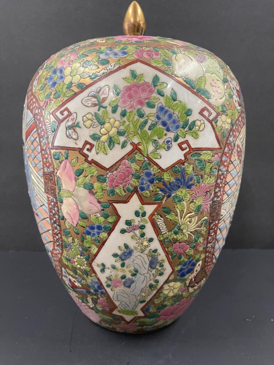 Vintage Chinese rose medallion ginger jar. Very good condition with minimal signs of use consistent with age. 12 1/2" to the top of the finial x 7".