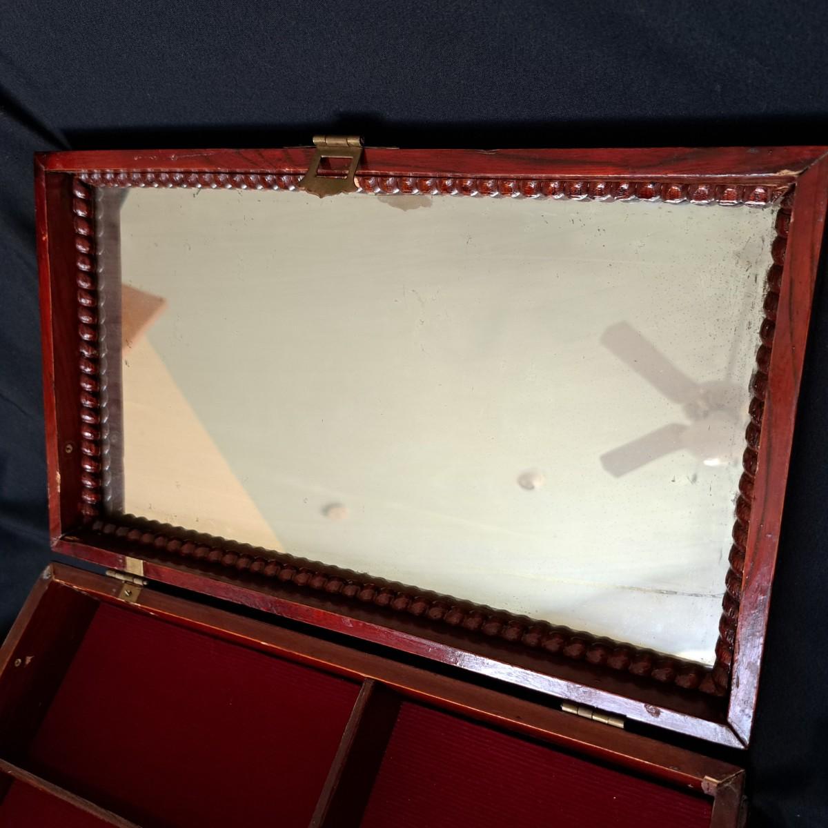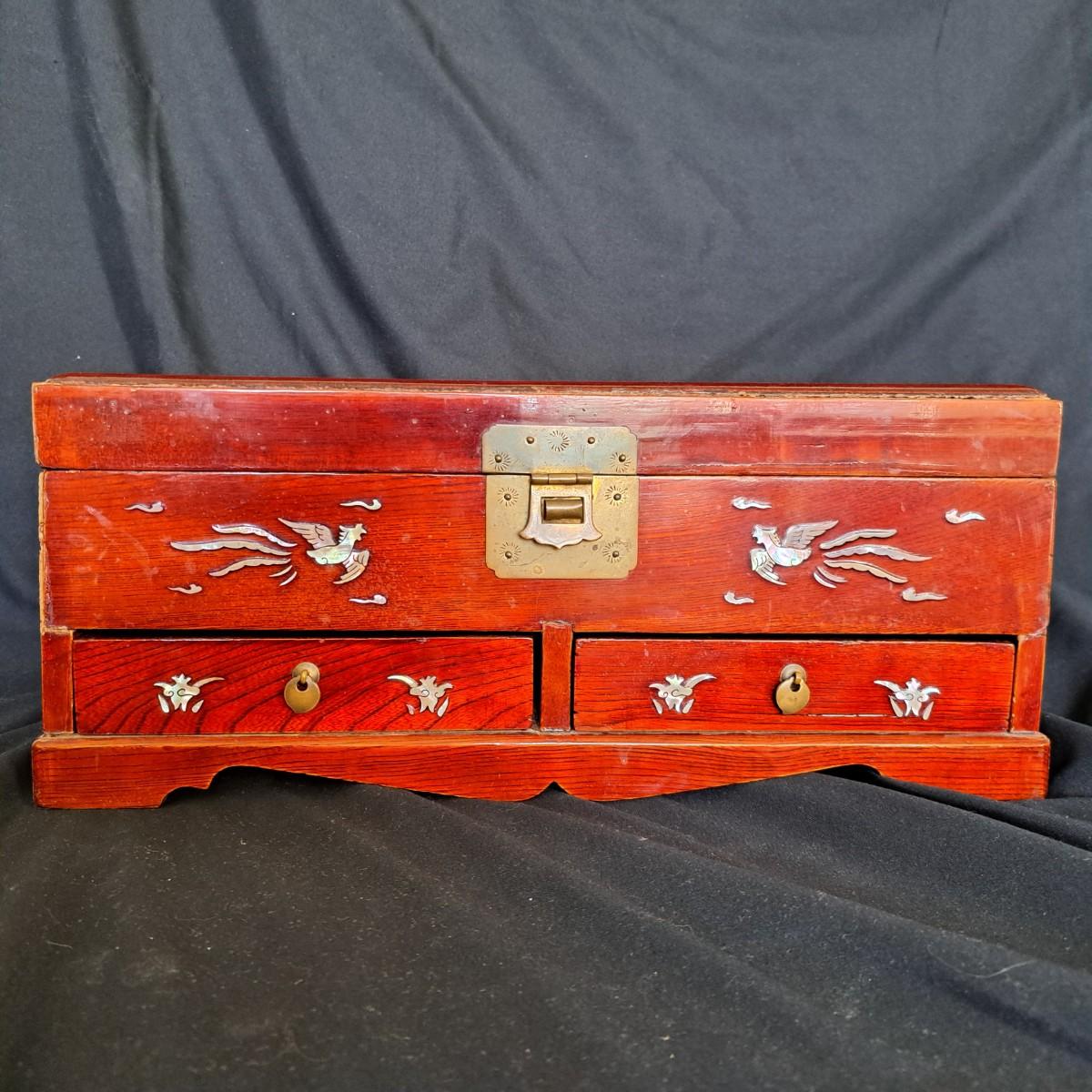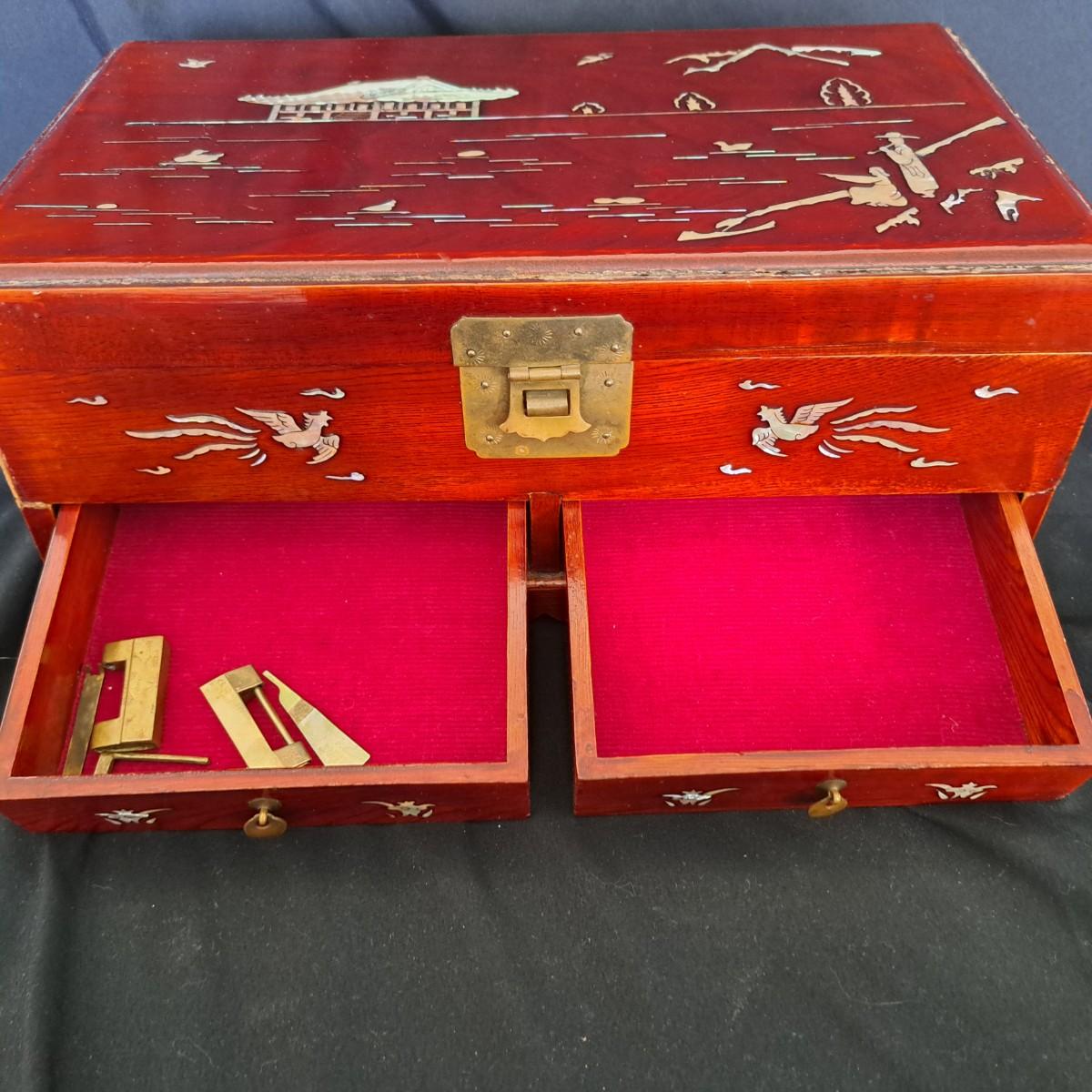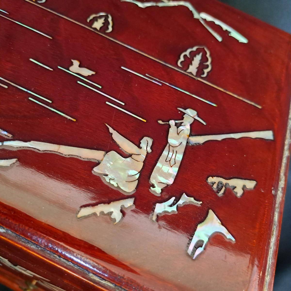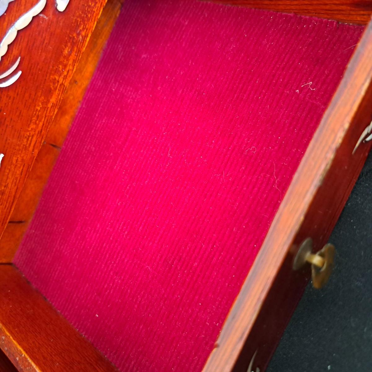 Highly shellacked Chinese rosewood chest measures 14" x 8.5" x 6"H with an interior mirror (*some silvering present), a three-section velvet-lined top and two ribbed velvet-lined bottom drawers with brass pulls. The mother-of-pearl inlay depicts a serene seaside scene with a couple on shore looking at geese floating on water. There are two fighting cocks on opposite sides of front closure plate and butterflies at sides. Brass hardware - front closure plate can take a lock - not included. Piece appears to be in quite good condition for its age; however, the key at bottom to play music turns, but no music plays (?). Appears to be an area inside box in corner where someone may have tried to repair the wire music box as shown. Included in a drawer are some extra brass hinges. There is what appears to be a maker's mark at bottom - illegible. Shipping available.