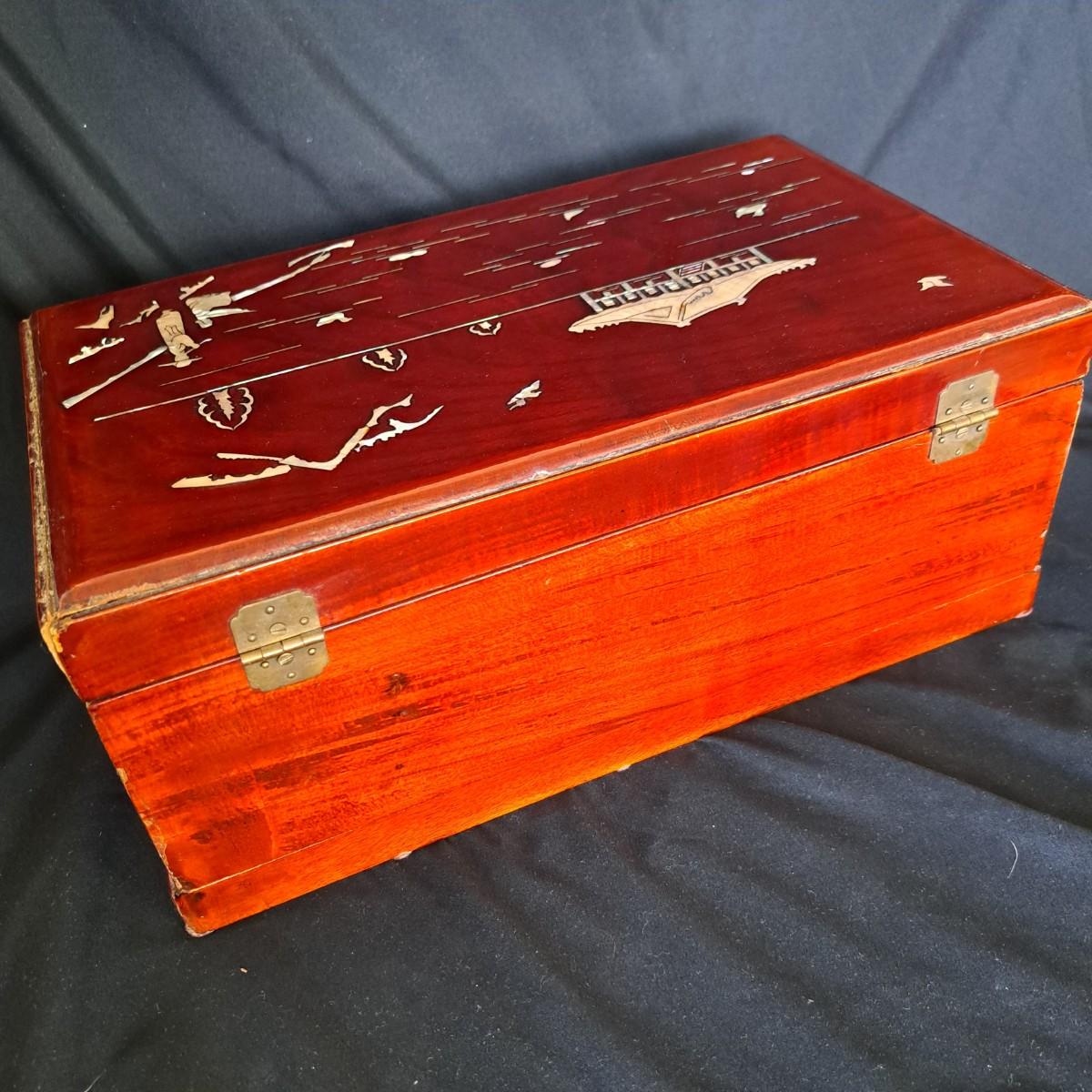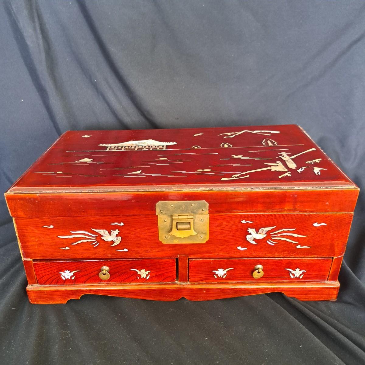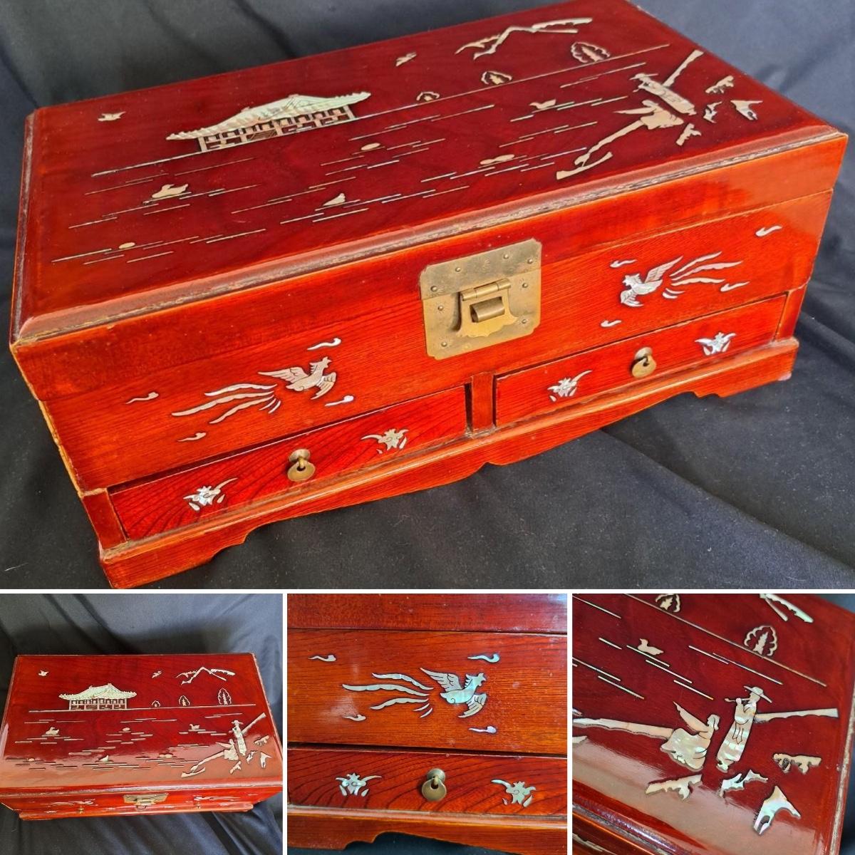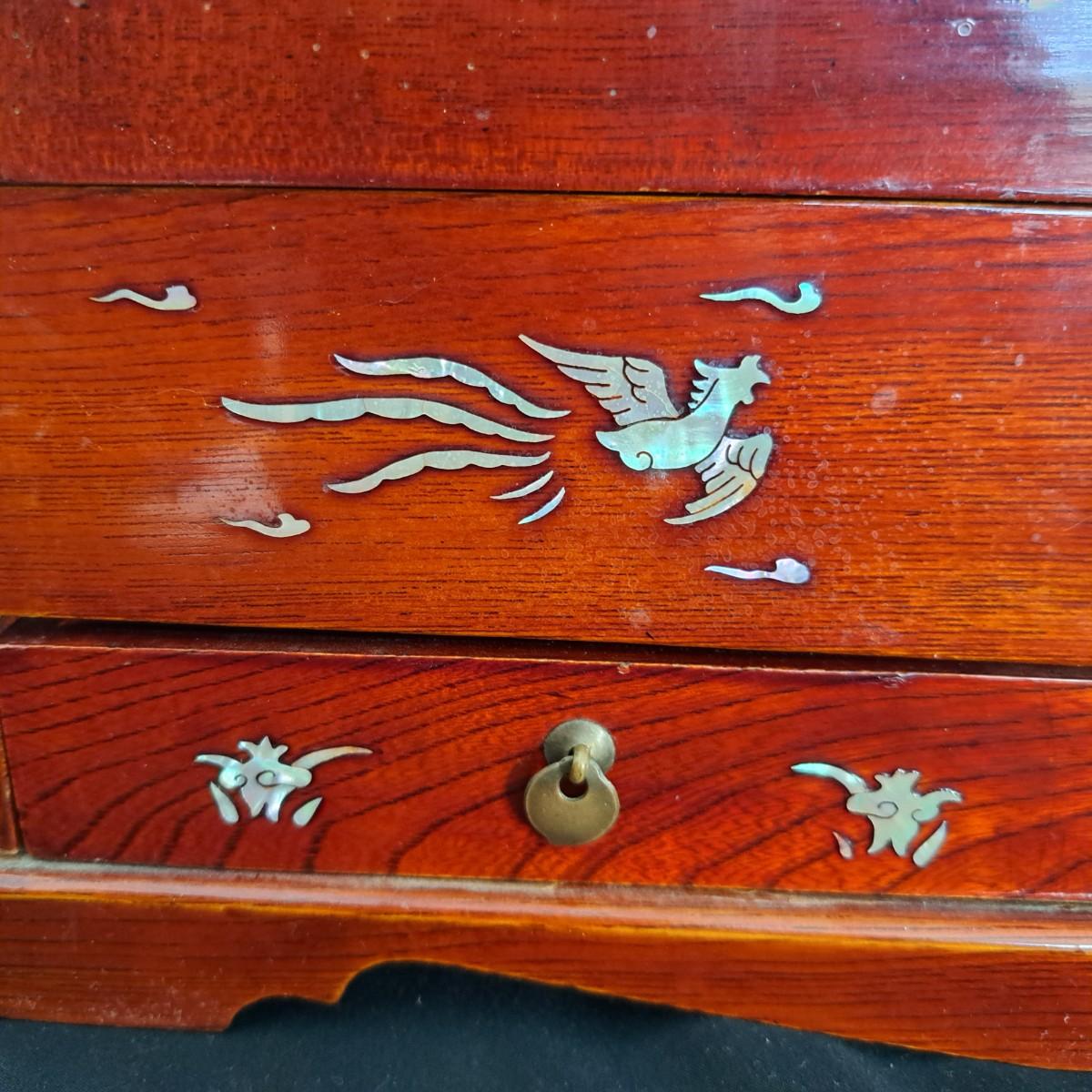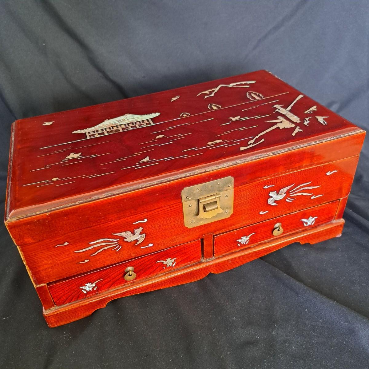 Highly shellacked Chinese rosewood chest measures 14" x 8.5" x 6"H with an interior mirror (*some silvering present), a three-section velvet-lined top and two ribbed velvet-lined bottom drawers with brass pulls. The mother-of-pearl inlay depicts a serene seaside scene with a couple on shore looking at geese floating on water. There are two fighting cocks on opposite sides of front closure plate and butterflies at sides. Brass hardware - front closure plate can take a lock - not included. Piece appears to be in quite good condition for its age; however, the key at bottom to play music turns, but no music plays (?). Appears to be an area inside box in corner where someone may have tried to repair the wire music box as shown. Included in a drawer are some extra brass hinges. There is what appears to be a maker's mark at bottom - illegible. Shipping available.