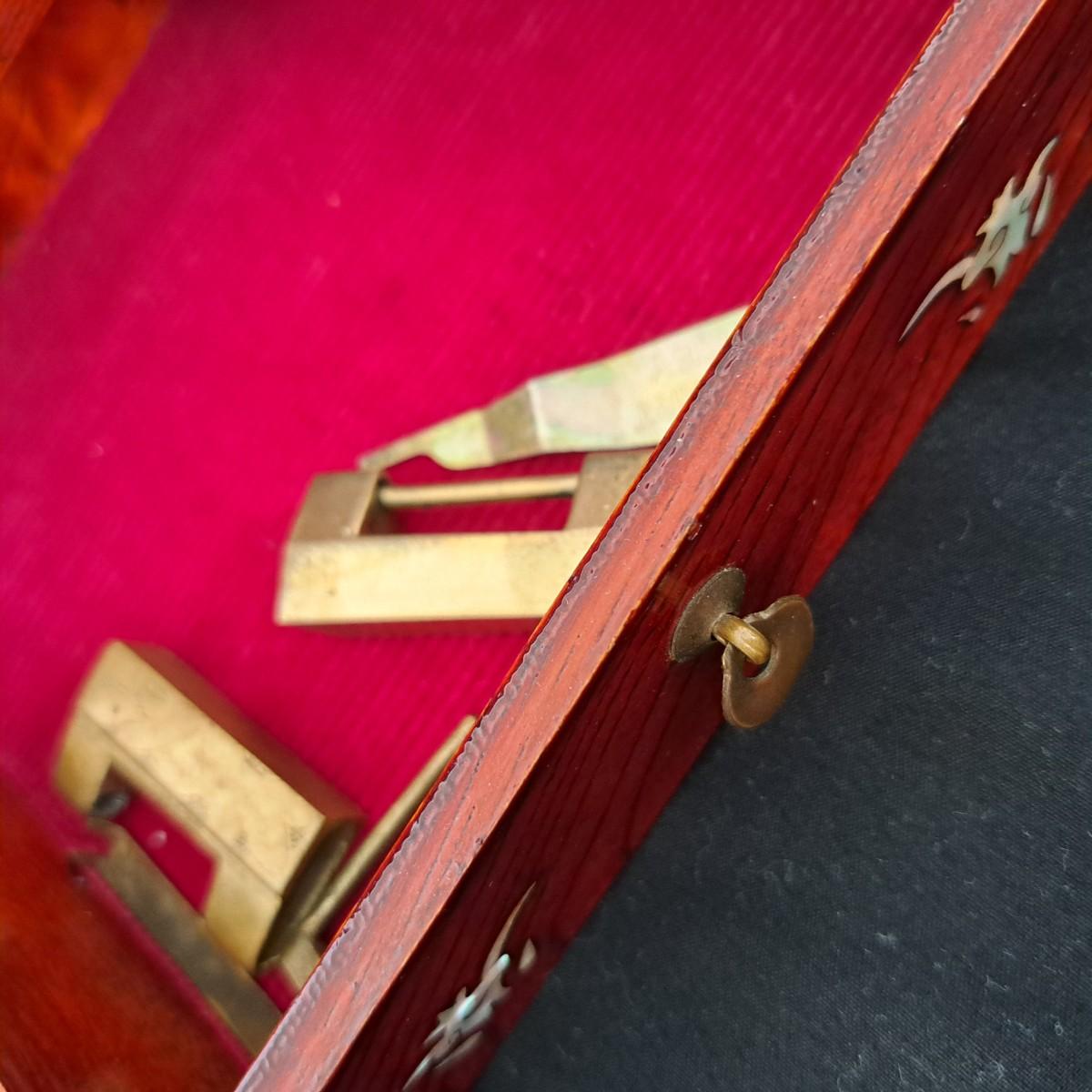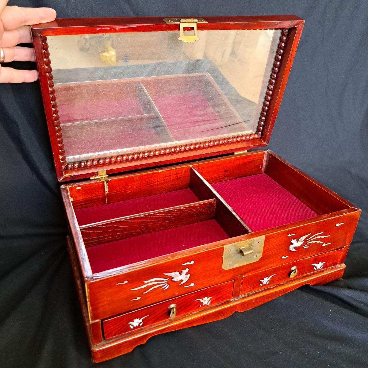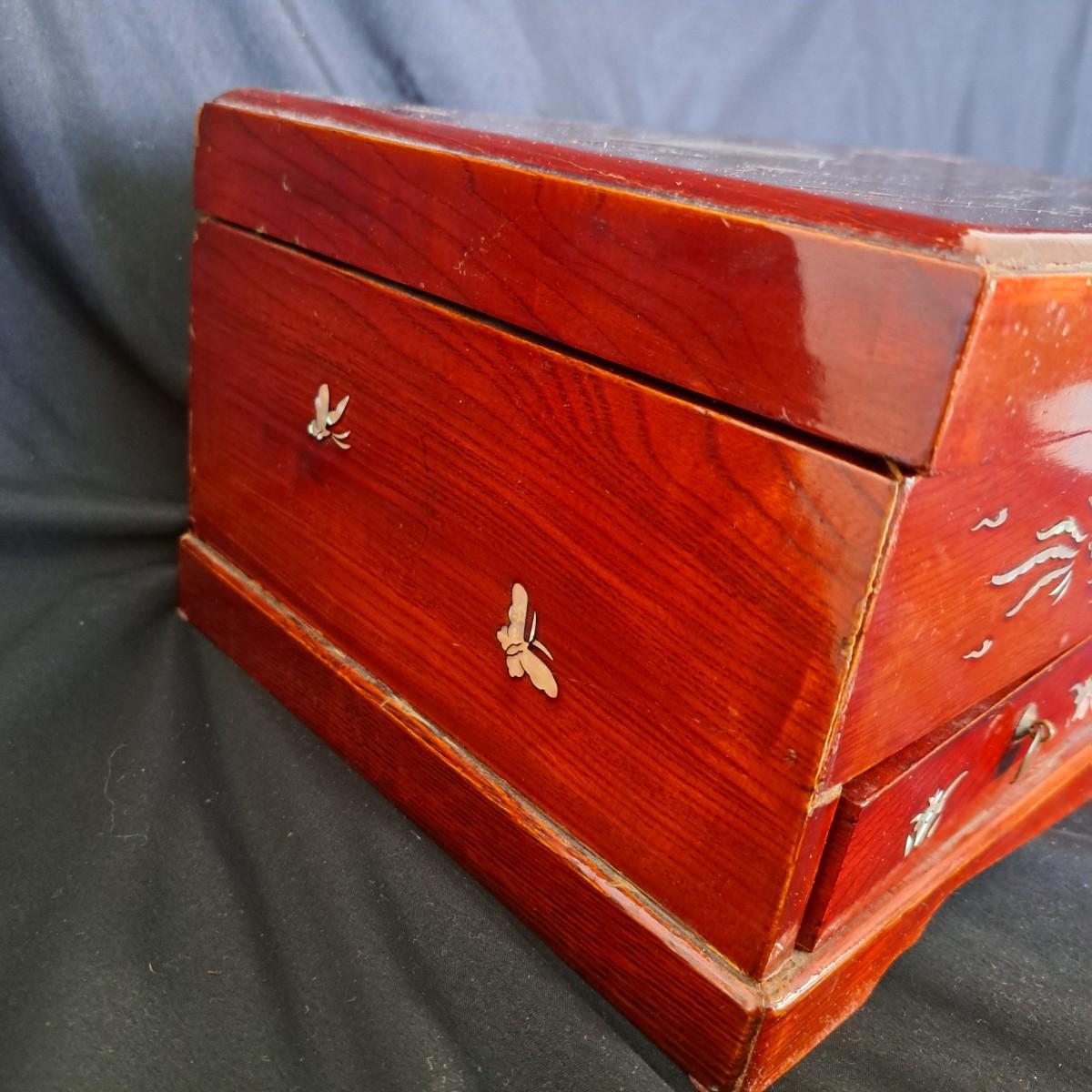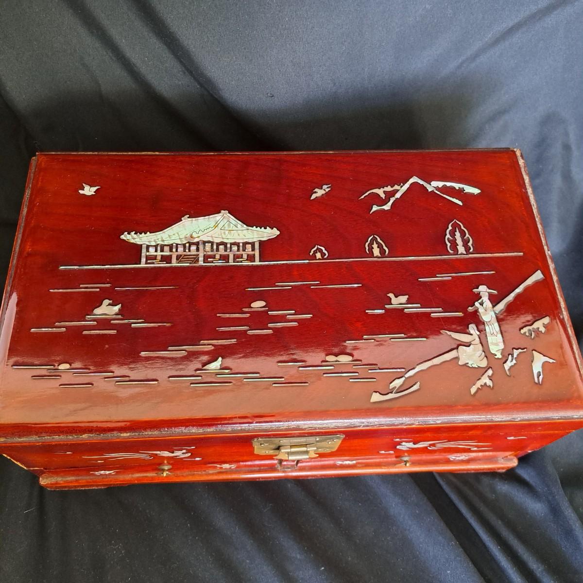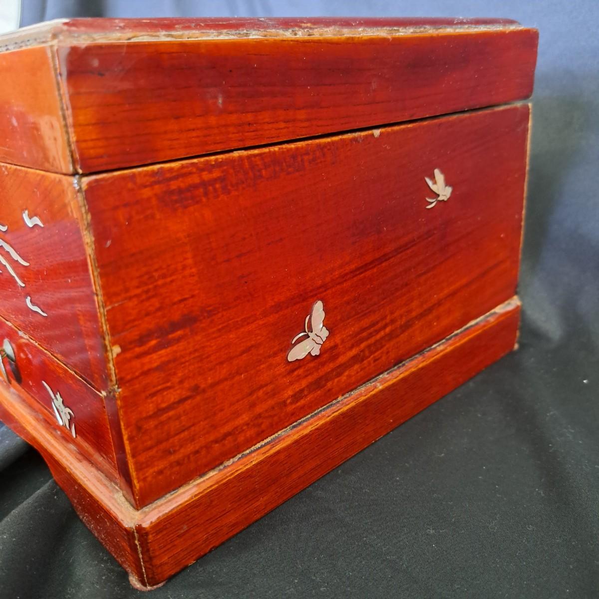 Highly shellacked Chinese rosewood chest measures 14" x 8.5" x 6"H with an interior mirror (*some silvering present), a three-section velvet-lined top and two ribbed velvet-lined bottom drawers with brass pulls. The mother-of-pearl inlay depicts a serene seaside scene with a couple on shore looking at geese floating on water. There are two fighting cocks on opposite sides of front closure plate and butterflies at sides. Brass hardware - front closure plate can take a lock - not included. Piece appears to be in quite good condition for its age; however, the key at bottom to play music turns, but no music plays (?). Appears to be an area inside box in corner where someone may have tried to repair the wire music box as shown. Included in a drawer are some extra brass hinges. There is what appears to be a maker's mark at bottom - illegible. Shipping available.