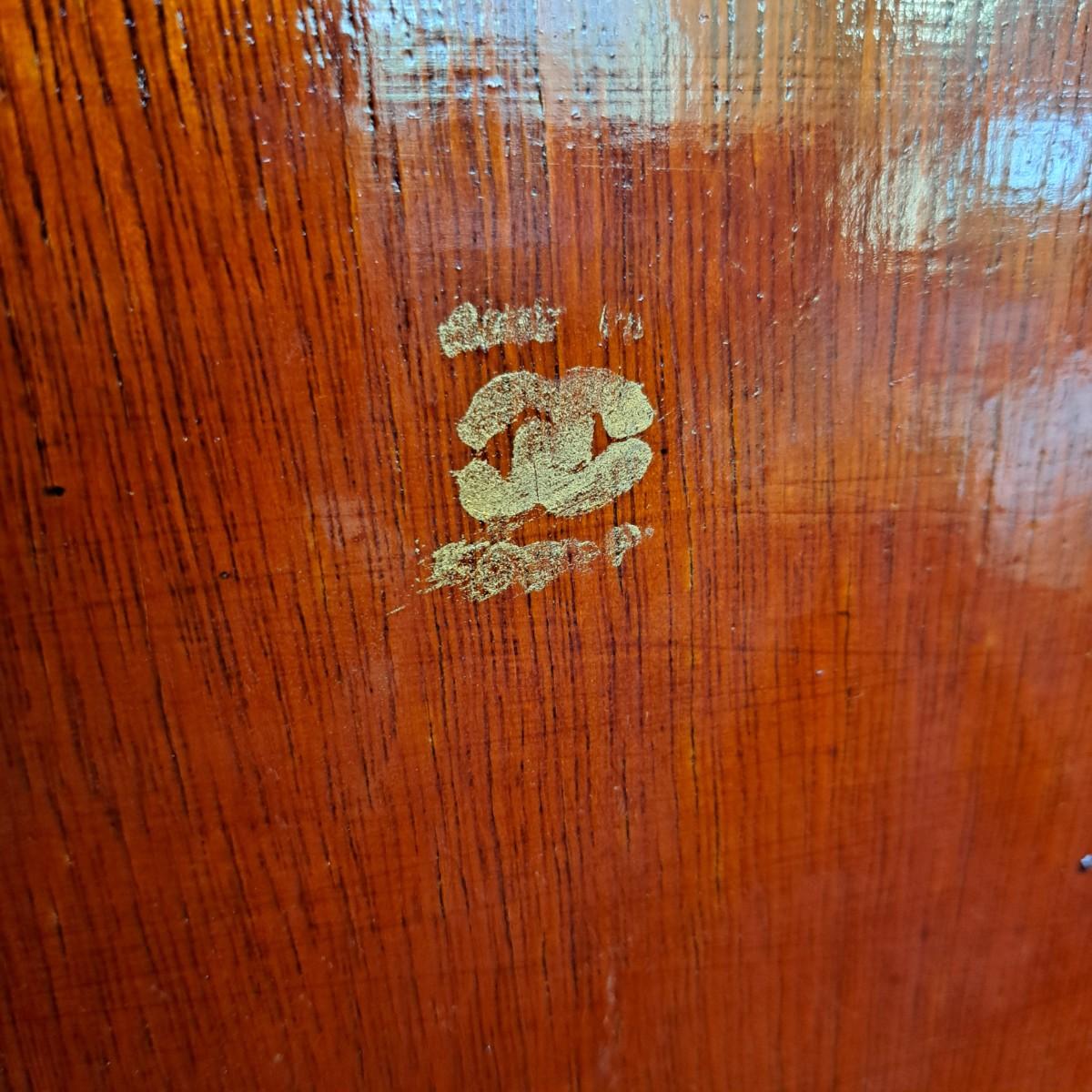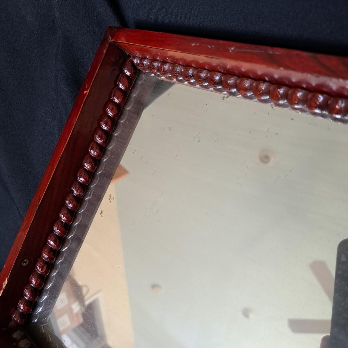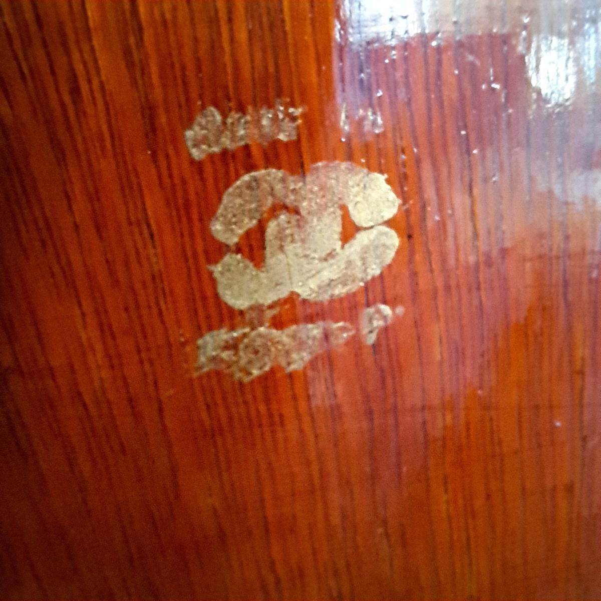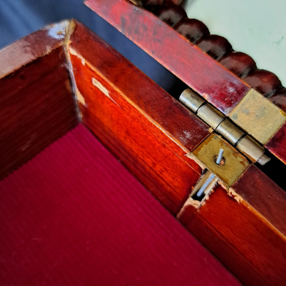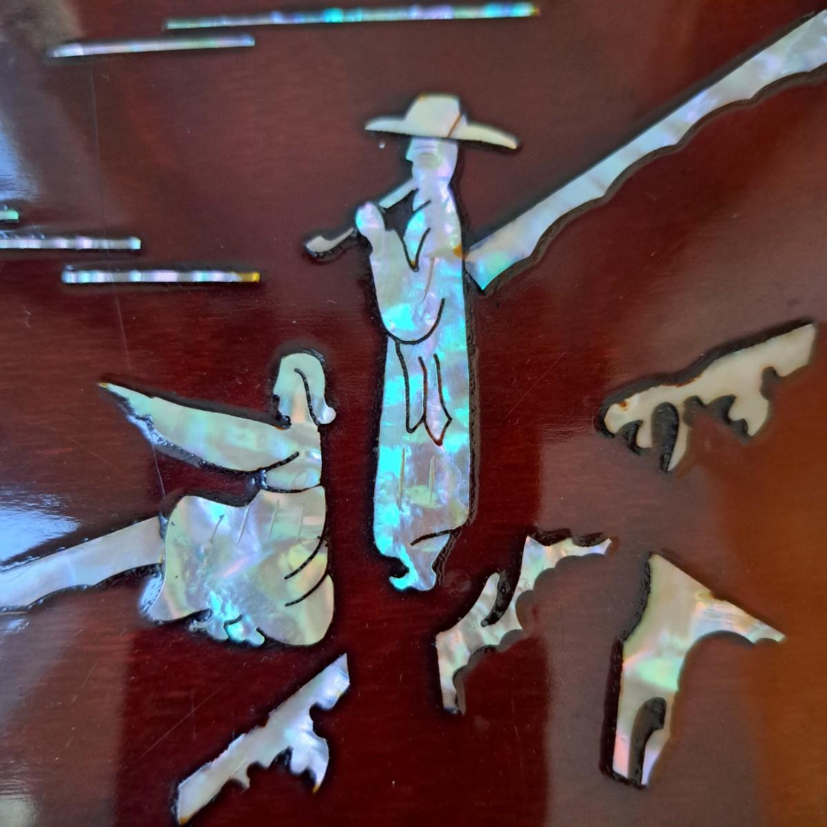Highly shellacked Chinese rosewood chest measures 14" x 8.5" x 6"H with an interior mirror (*some silvering present), a three-section velvet-lined top and two ribbed velvet-lined bottom drawers with brass pulls. The mother-of-pearl inlay depicts a serene seaside scene with a couple on shore looking at geese floating on water. There are two fighting cocks on opposite sides of front closure plate and butterflies at sides. Brass hardware - front closure plate can take a lock - not included. Piece appears to be in quite good condition for its age; however, the key at bottom to play music turns, but no music plays (?). Appears to be an area inside box in corner where someone may have tried to repair the wire music box as shown. Included in a drawer are some extra brass hinges. There is what appears to be a maker's mark at bottom - illegible. Shipping available.