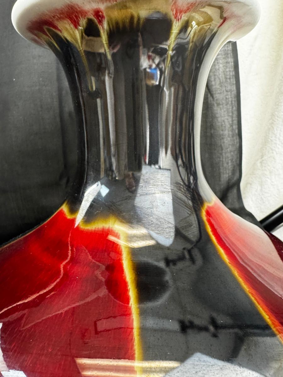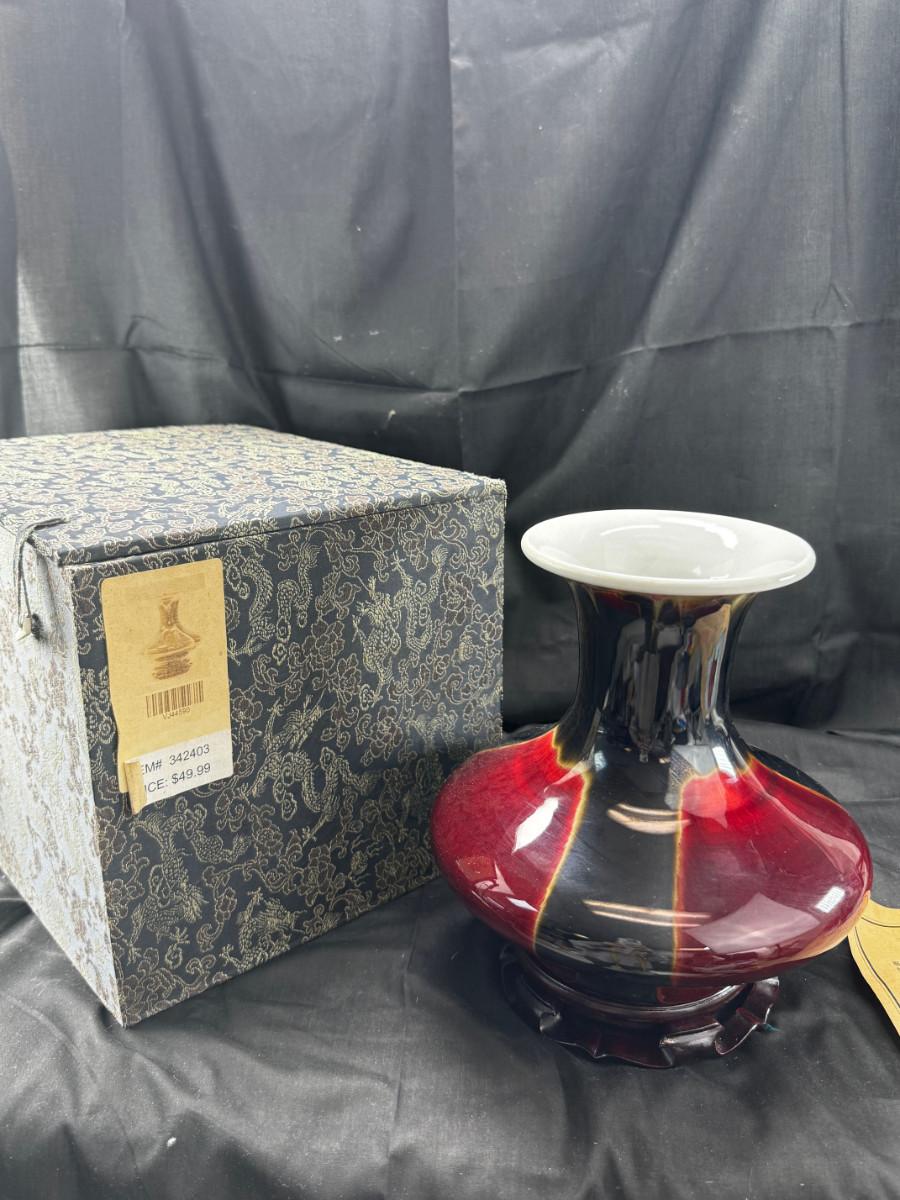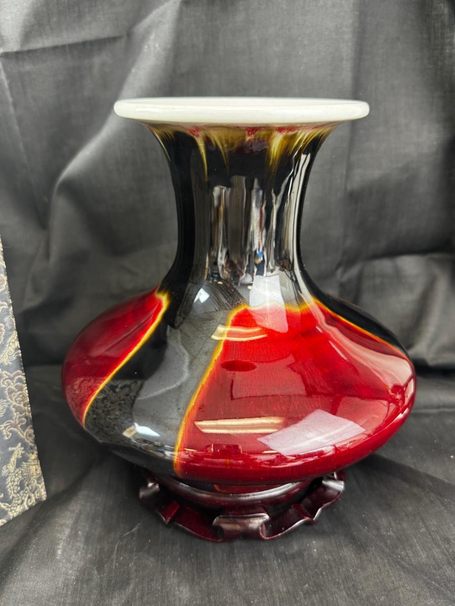 A beautiful, high quality Chinese porcelain 'Sang de Boeuf' and Black Flambe Vase in outstanding condition. With original box and paperwork. Chinese sang de boeuf" (oxblood) red, black, and yellow transmutation glaze, all under a fine and controlled crackle.. The vase has a squat, bulbous body and a flared neck with a white rim. It sits on a carved rosewood display stand. I have 2 of these in this auction on consignment from the estate of an Asian collector. This is the shorter one.