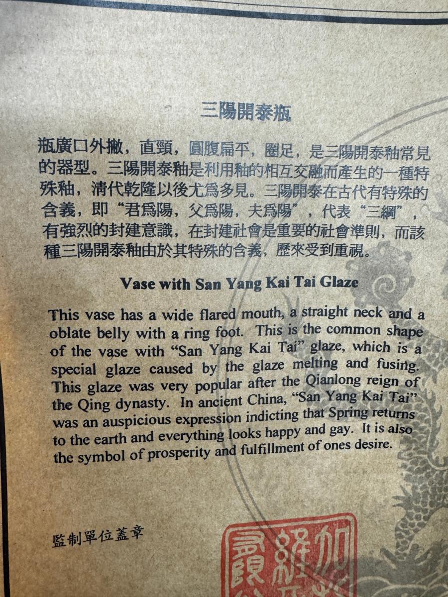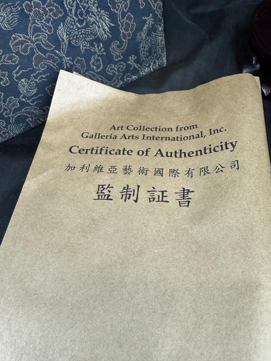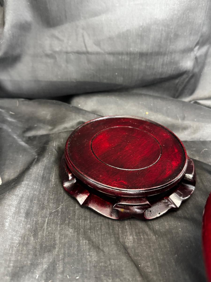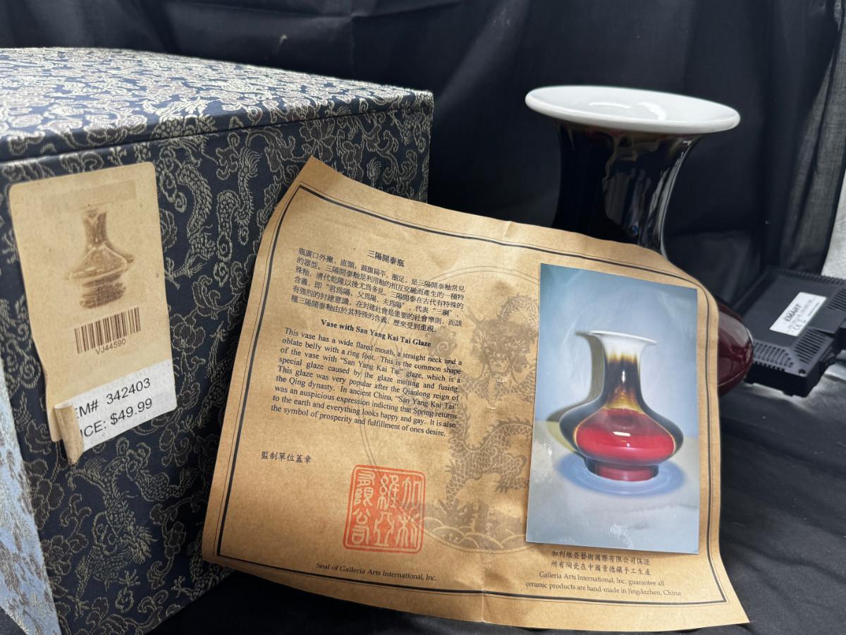 A beautiful, high quality Chinese porcelain 'Sang de Boeuf' and Black Flambe Vase in outstanding condition. With original box and paperwork. Chinese sang de boeuf" (oxblood) red, black, and yellow transmutation glaze, all under a fine and controlled crackle.. The vase has a squat, bulbous body and a flared neck with a white rim. It sits on a carved rosewood display stand. I have 2 of these in this auction on consignment from the estate of an Asian collector. This is the shorter one.