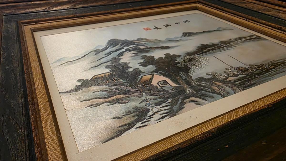 Vintage Chinese Shan Shui Landscape Painting on Silk – Hand-Painted Mountain & Lake Scene in Rustic Wood Frame
