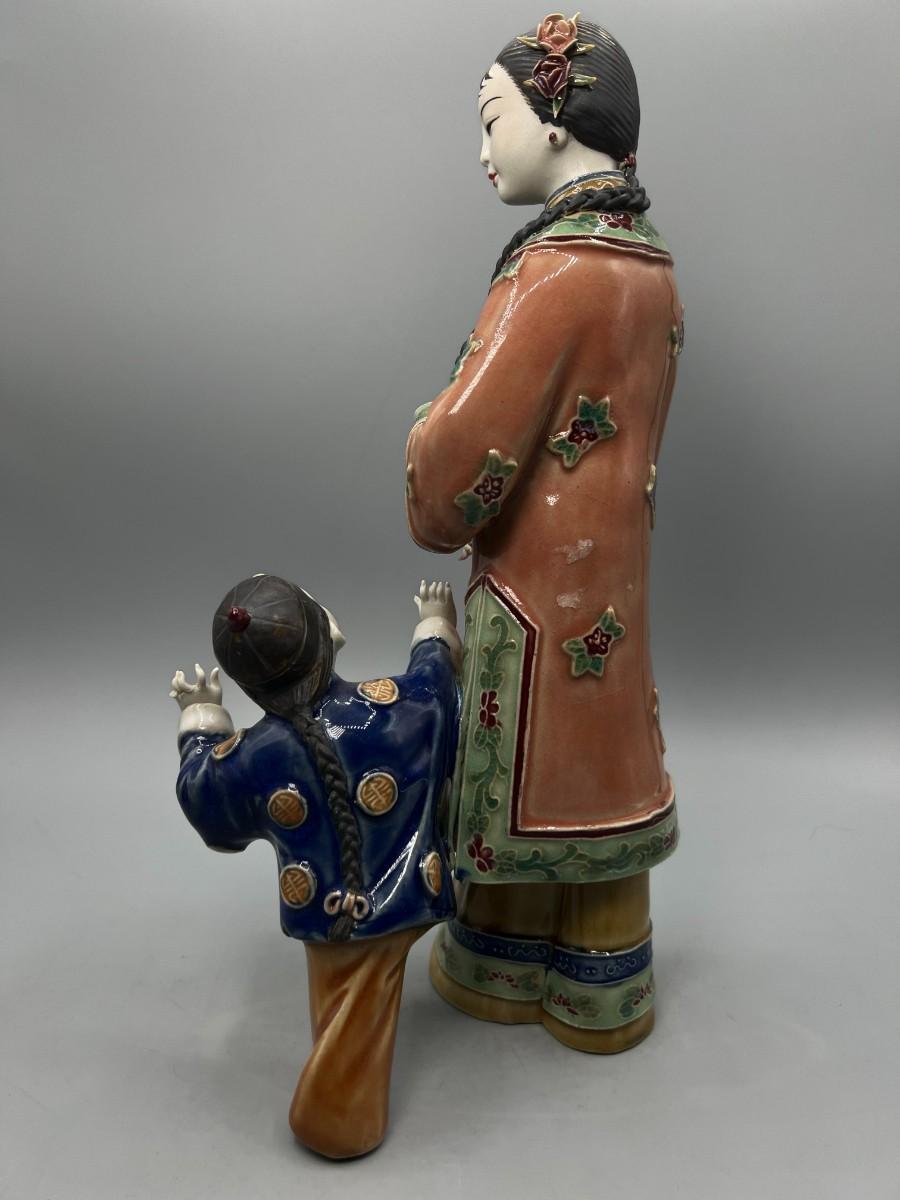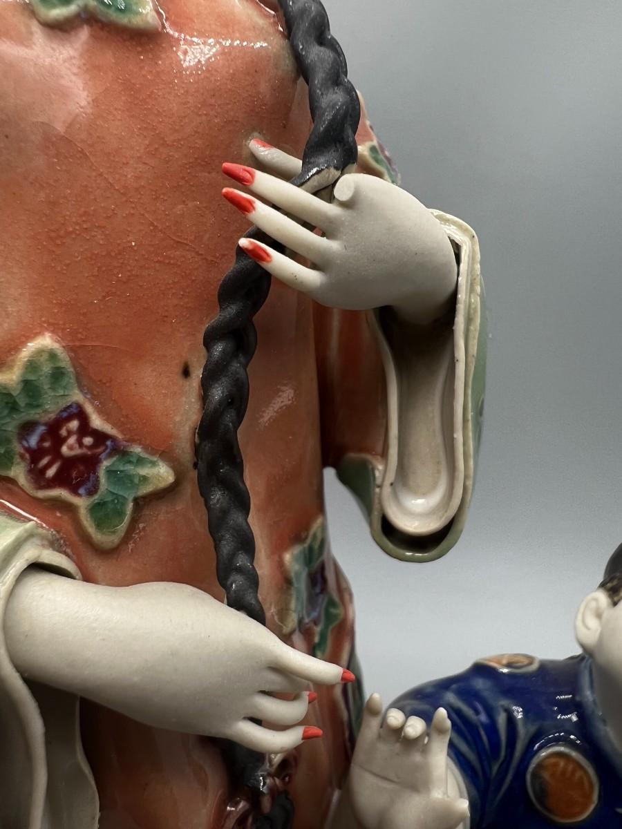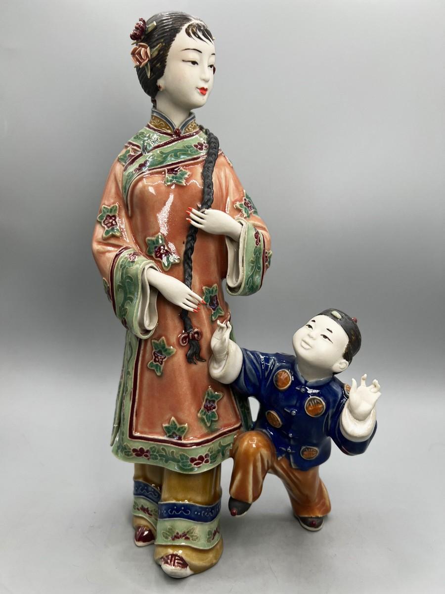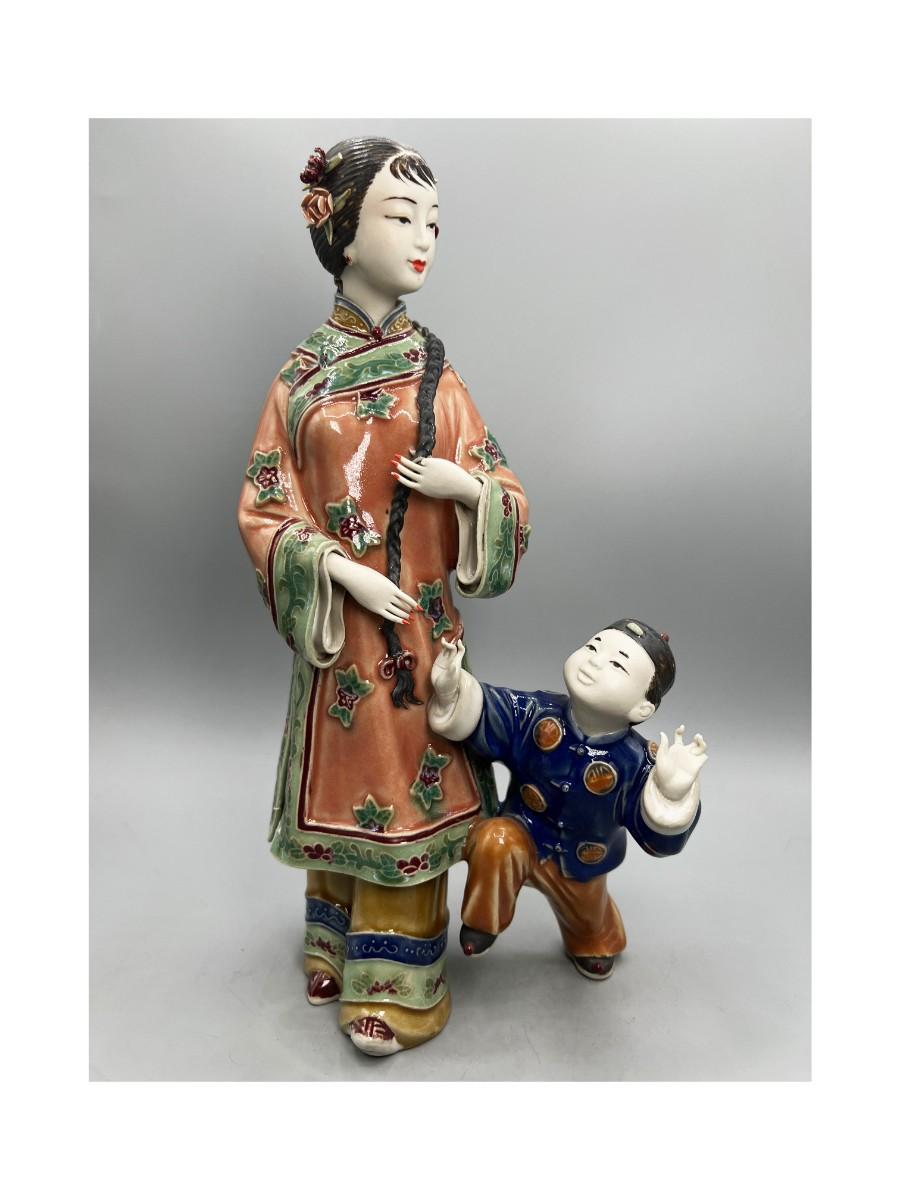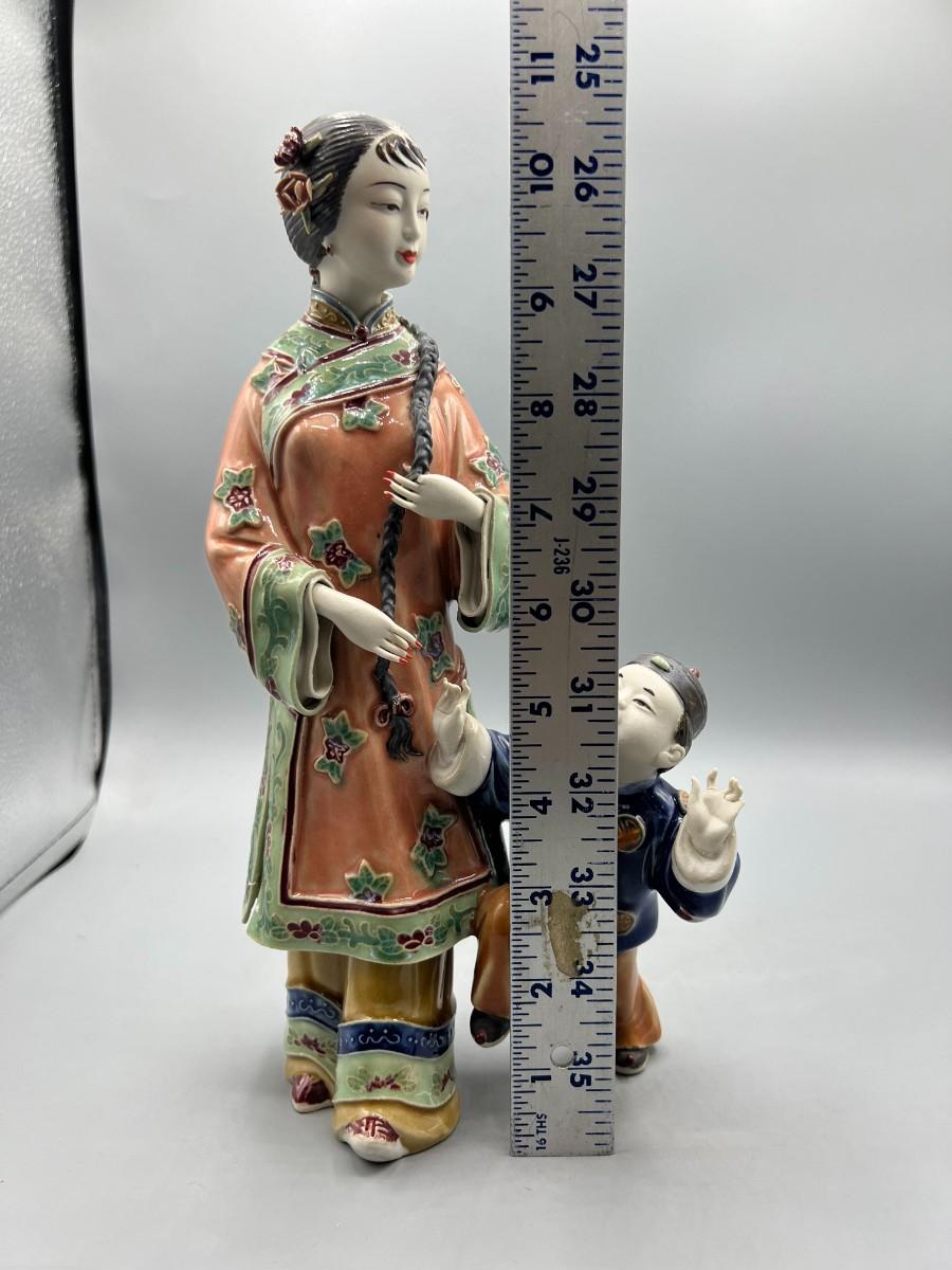 Vintage Chinese Shiwan Ware Style Ornate Mother & Child Porcelain Figurine Statue
