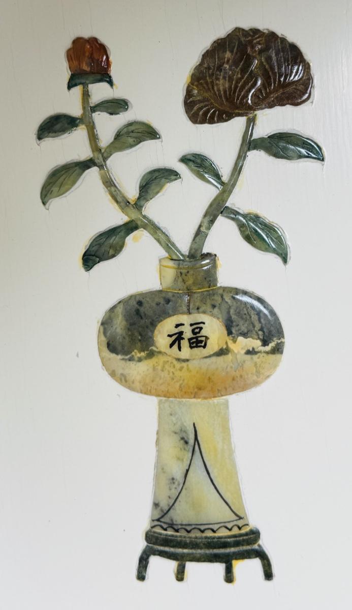 Set of 4 framed wall art pieces, each a 3-dimensional relief assembled from various colors and shapes of carved and polished stone. Tac is a flower and vase representing the 4 seasons: Spring - Double Happiness, Summer - Good Luck, Autumn - Happiness, and Winter - Long Life.Each is approx. 13 1/4" X 8 1/4" and are from Hong Kong. Frames have some areas of missing paint, images are all in very good condition.