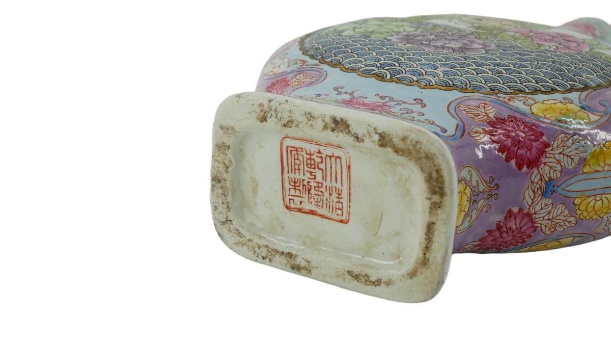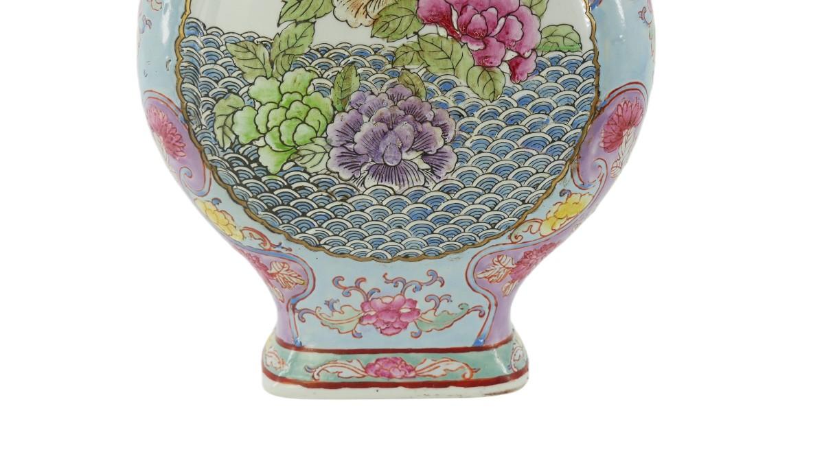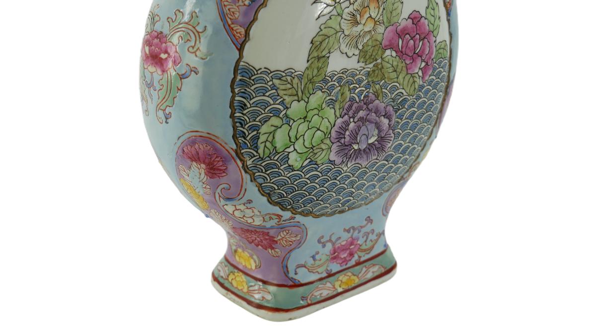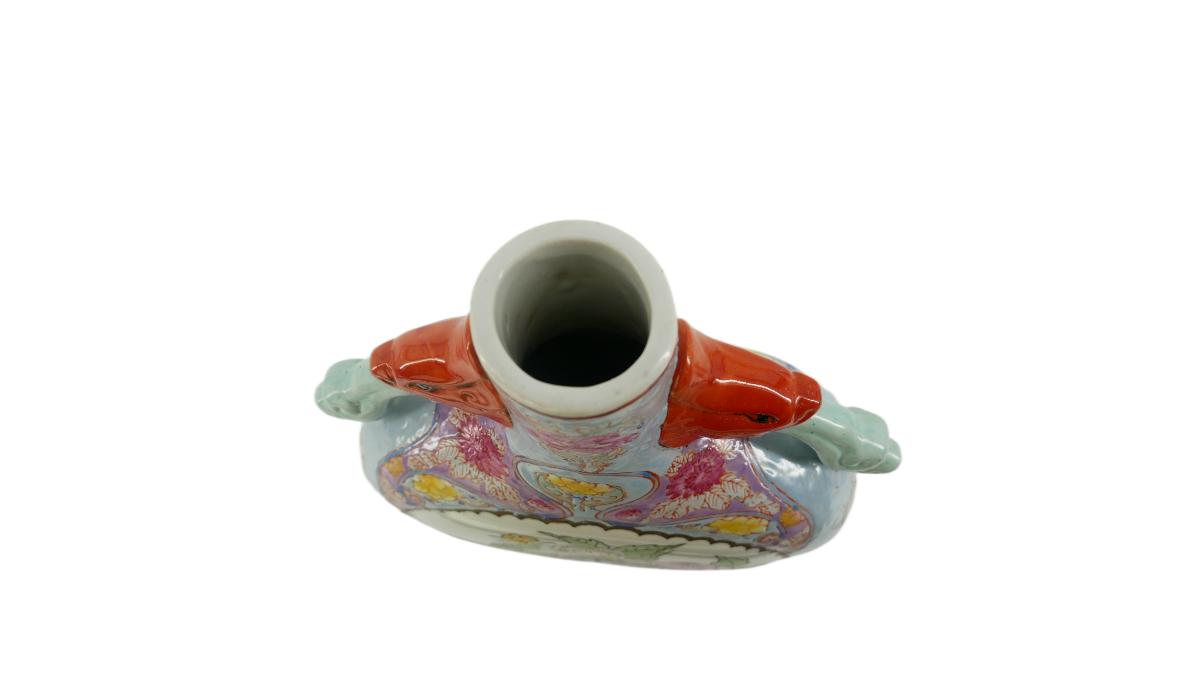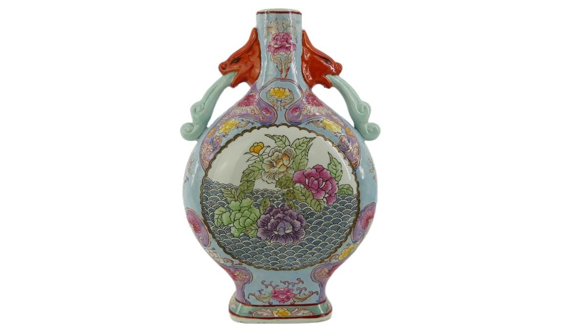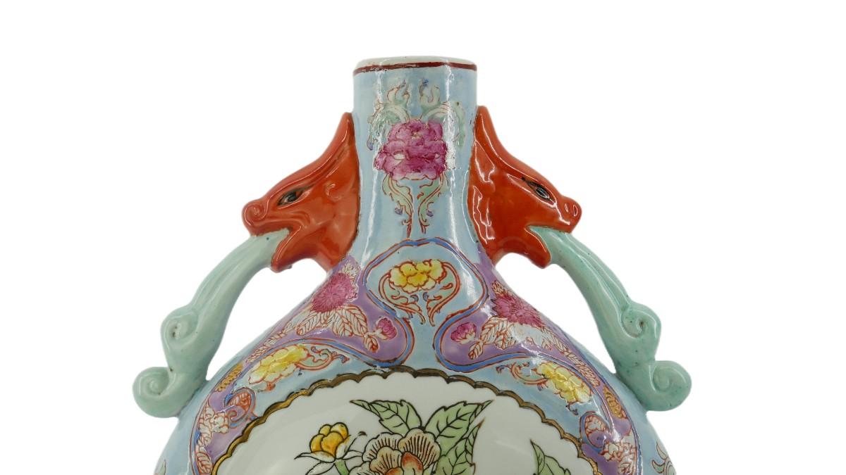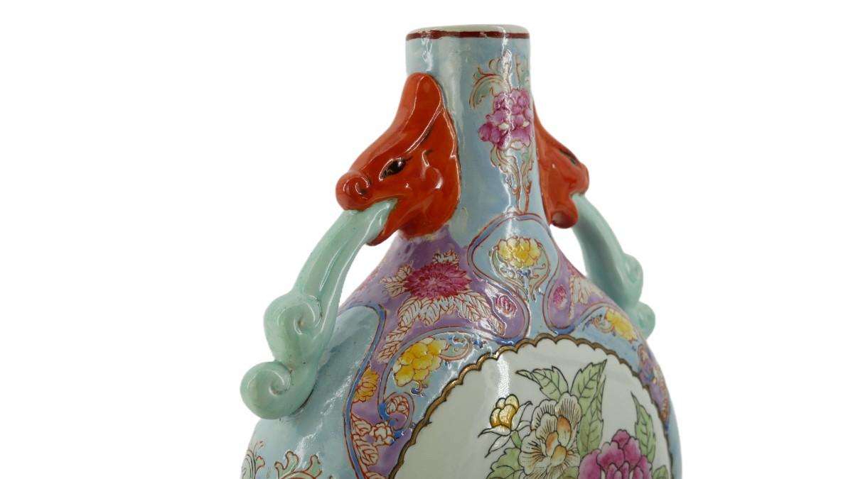 Vintage ceramic Chinese vase with decorative flowers and dragon faces. Thought to be from the Daqing region. Measures L 10 " x H 13" x W 3.5". Weighs 4 lbs. (C14)