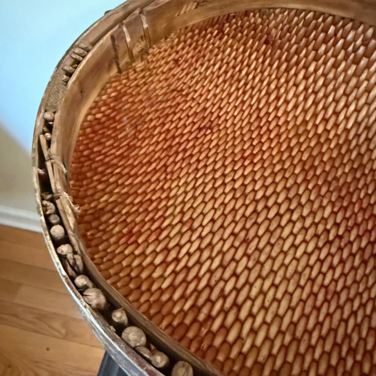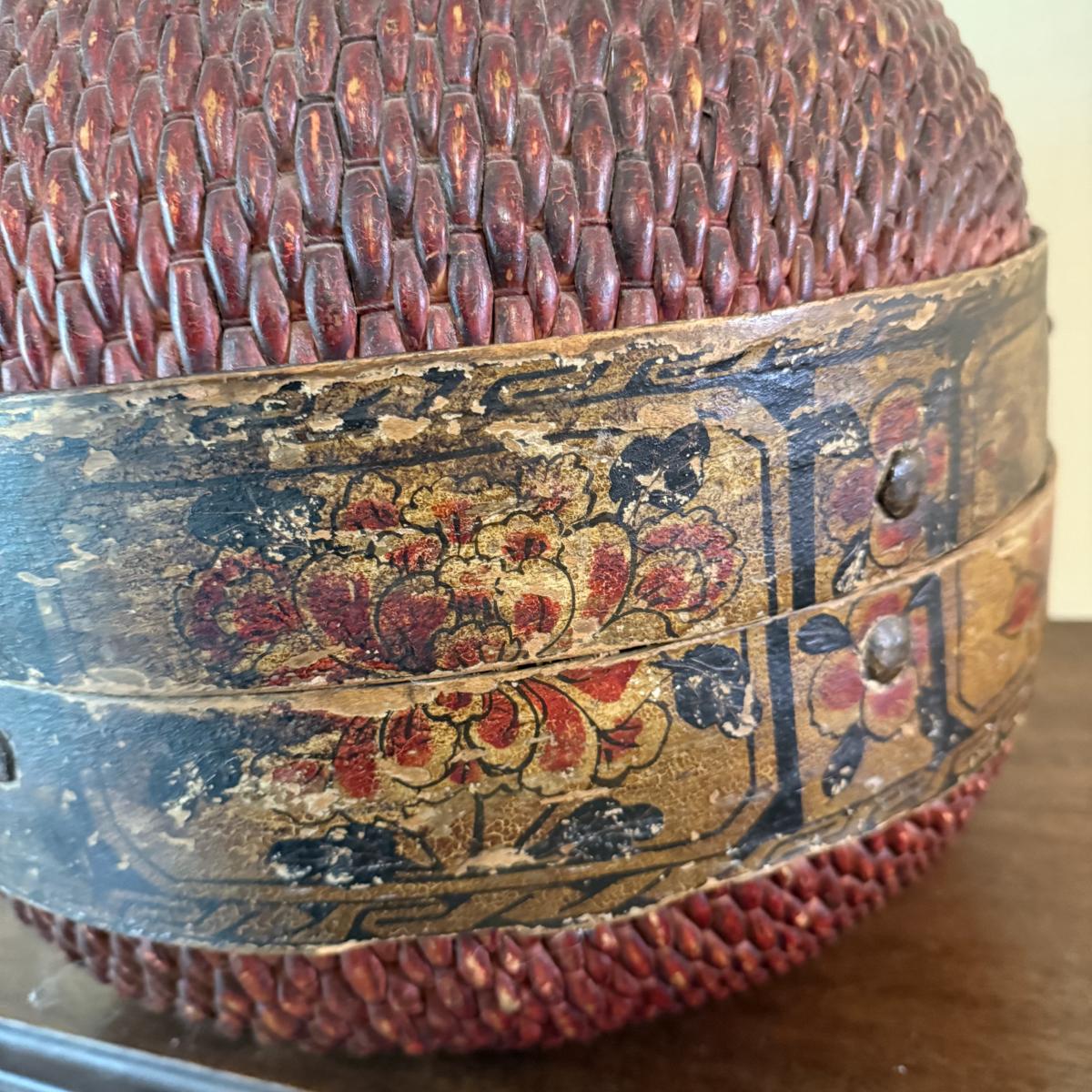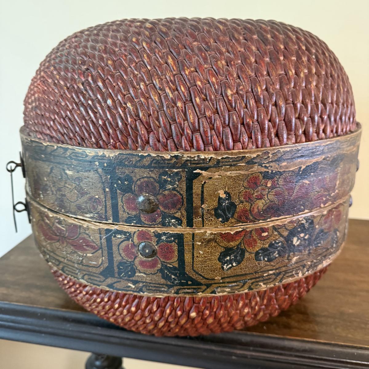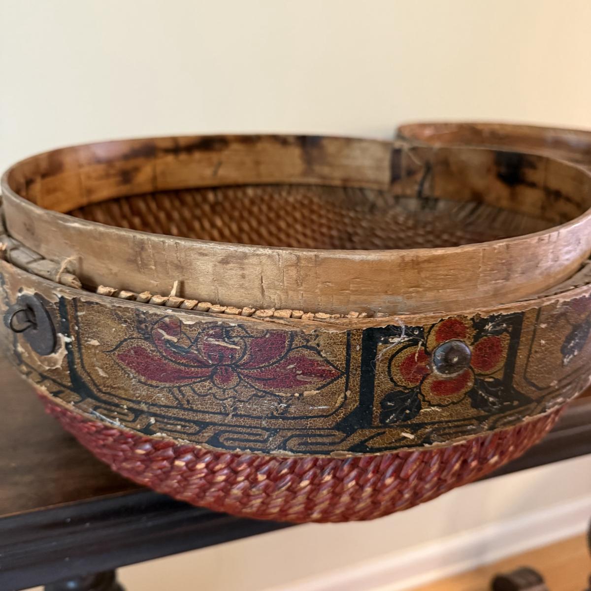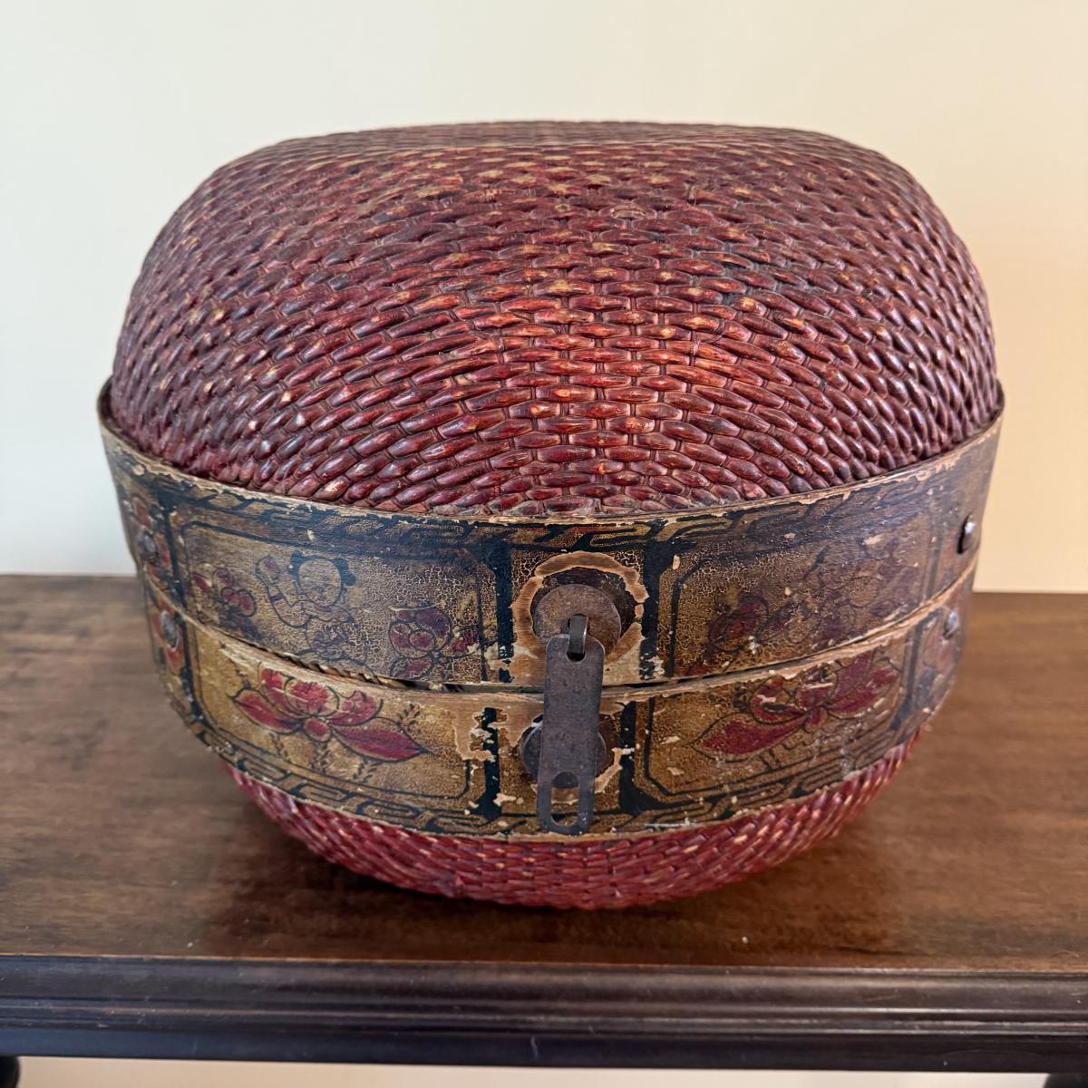 This lot appears to be a 19th century Chinese woven hat box. Measures 15"D x 12.5"H. It is held together by a circular hinge and has a clasp in the front as well. The edges appear to be bamboo and are painted with a lovely floral design. There is some natural wear to this item, see pictures for details. Shipping available.