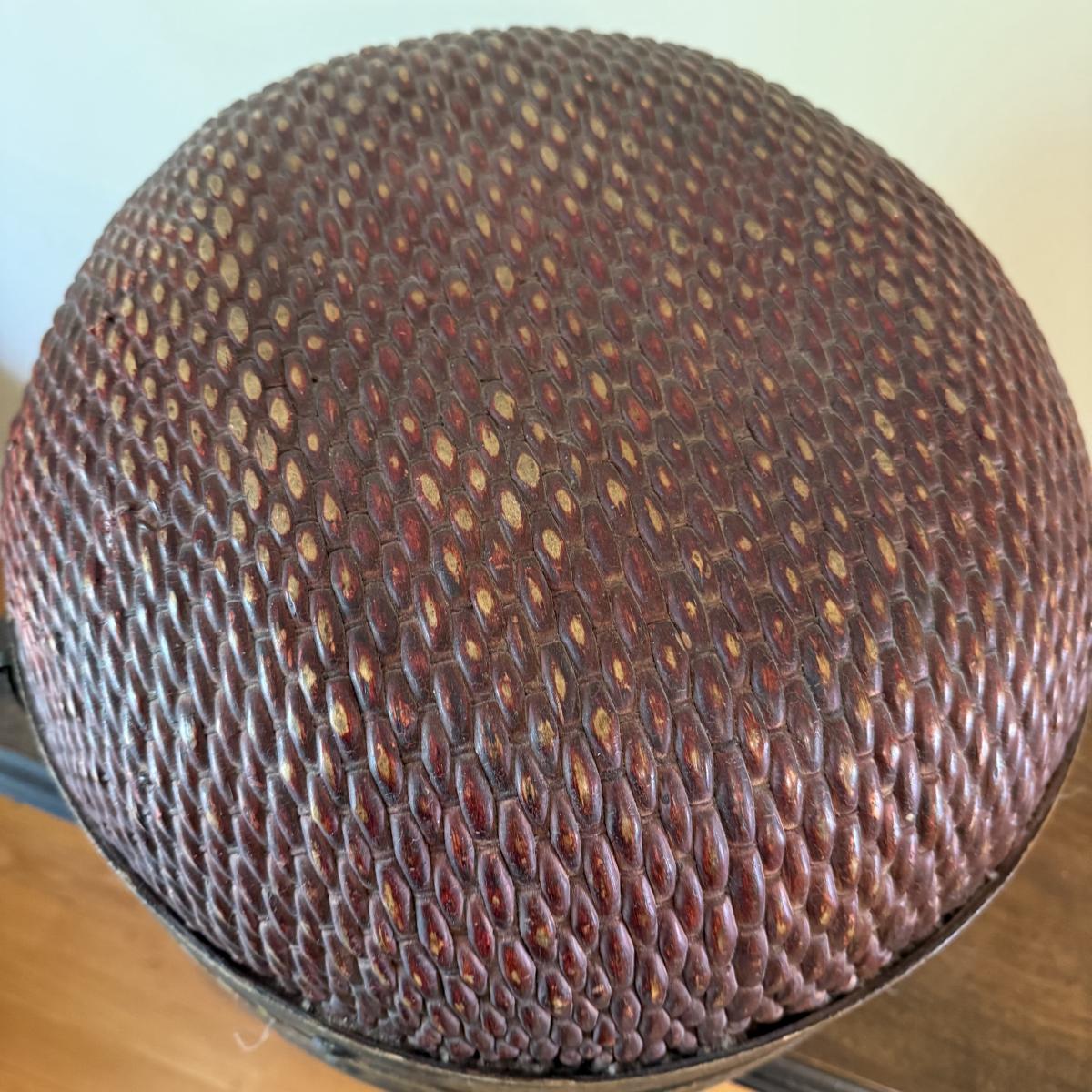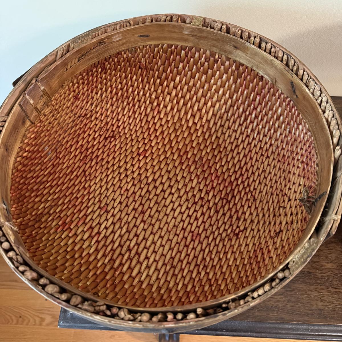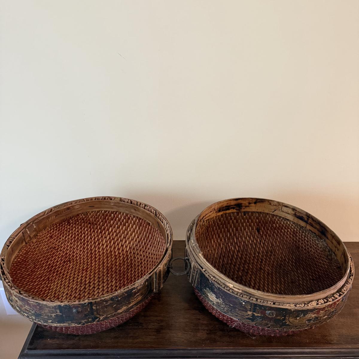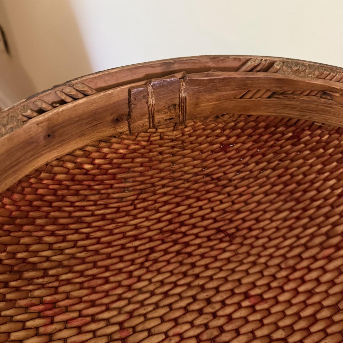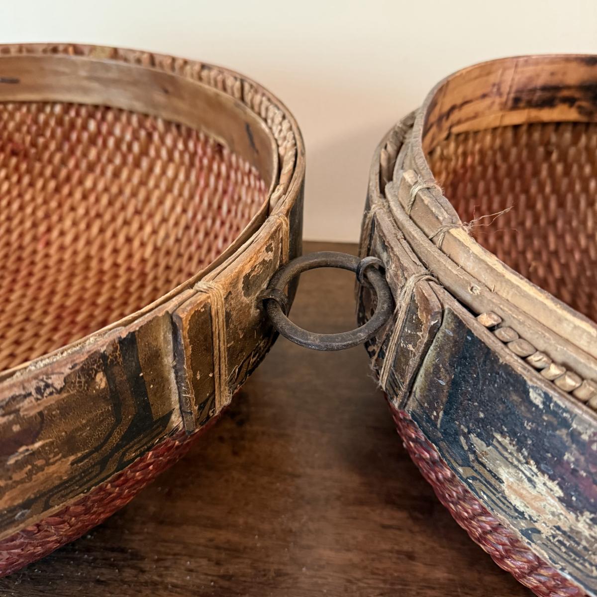 This lot appears to be a 19th century Chinese woven hat box. Measures 15"D x 12.5"H. It is held together by a circular hinge and has a clasp in the front as well. The edges appear to be bamboo and are painted with a lovely floral design. There is some natural wear to this item, see pictures for details. Shipping available.
