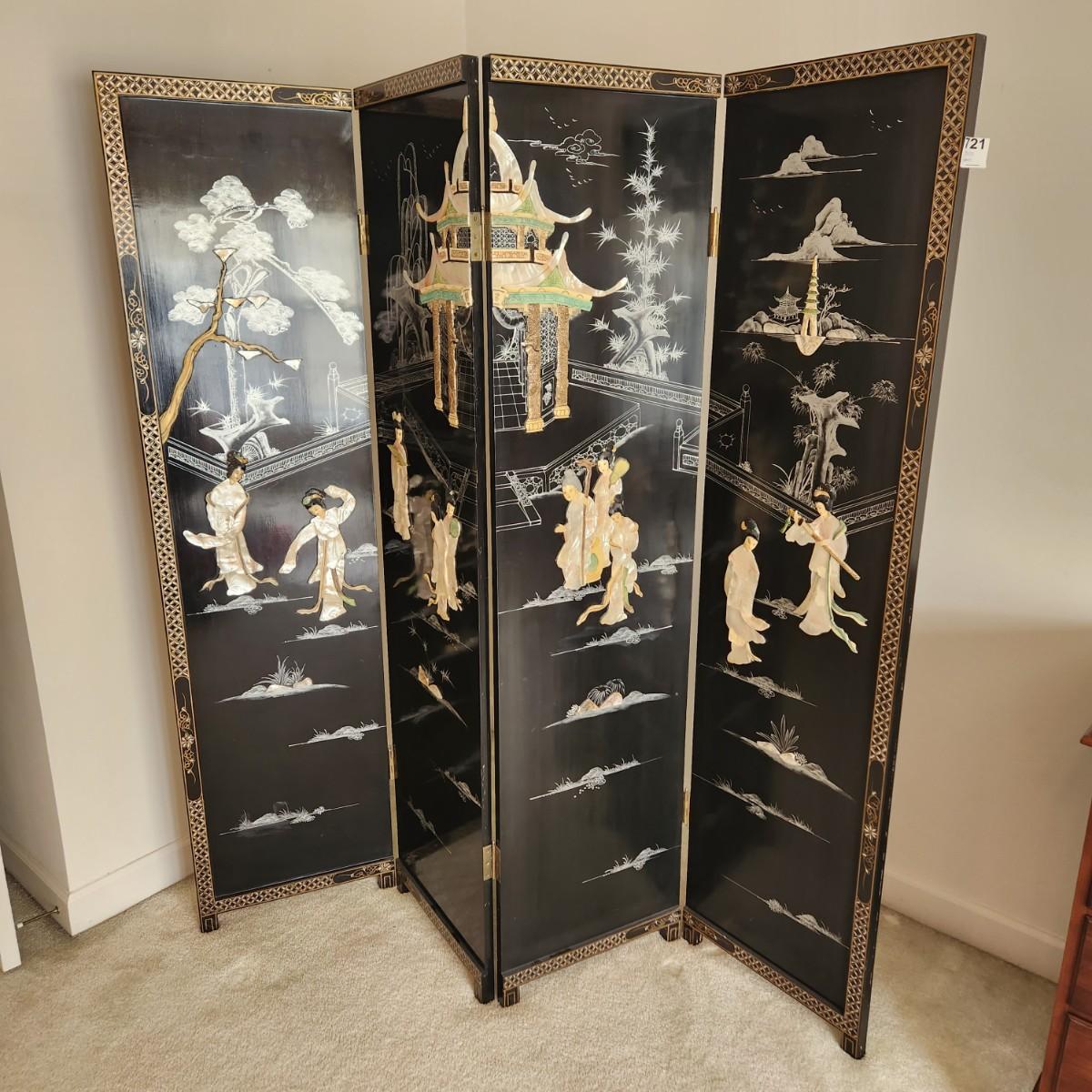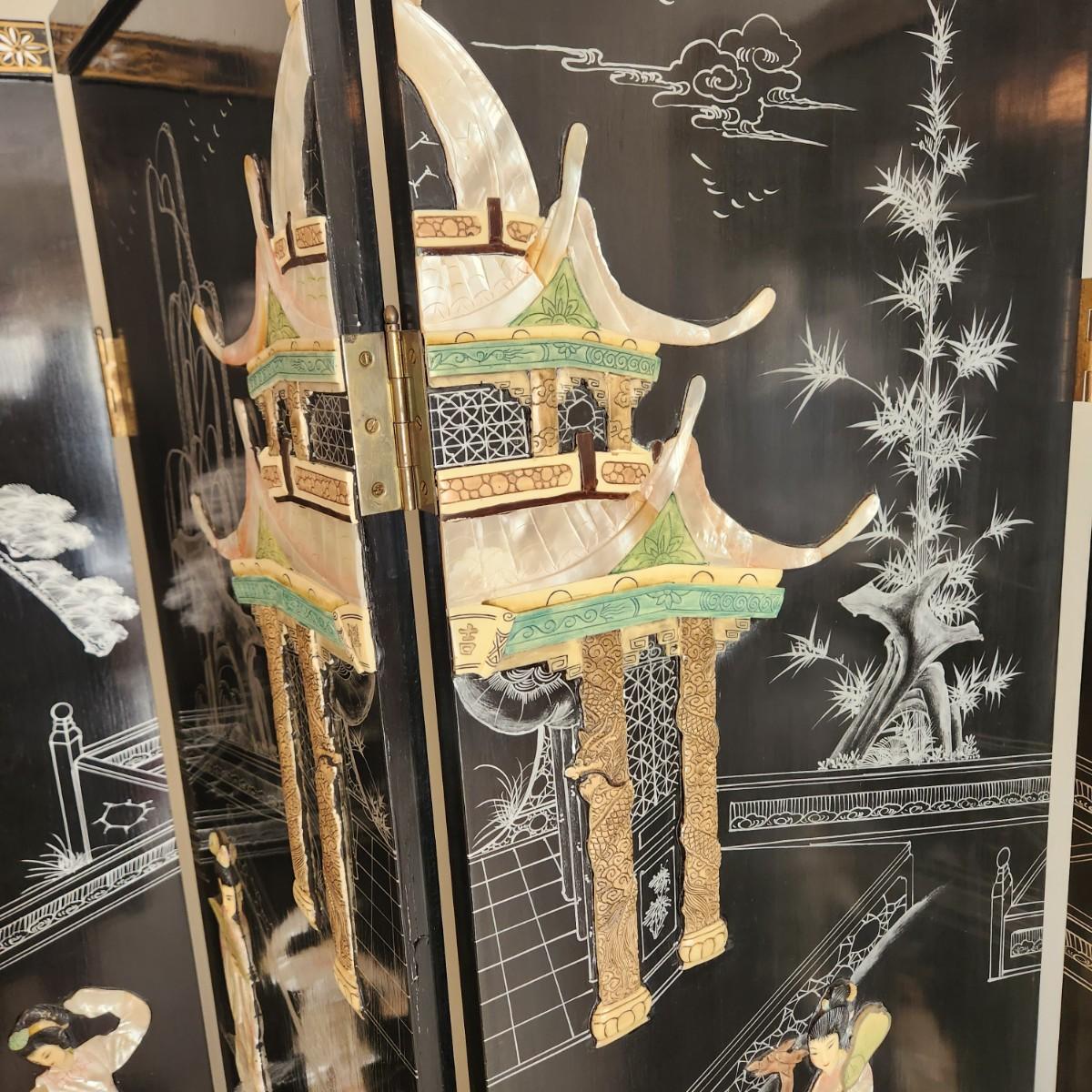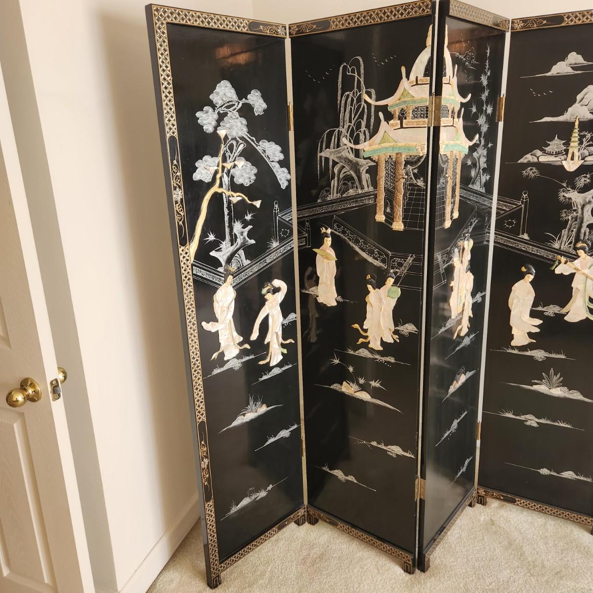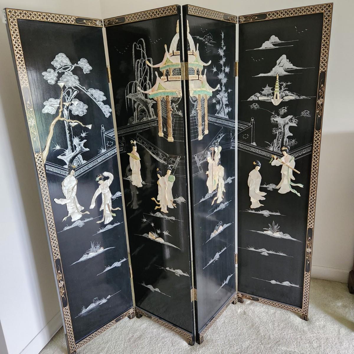 Vintage Asian Chinoiserie Mother of Pearl Hand Painted 4 Panel Screen