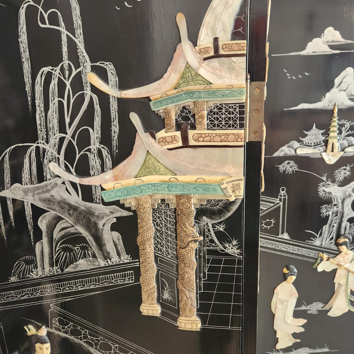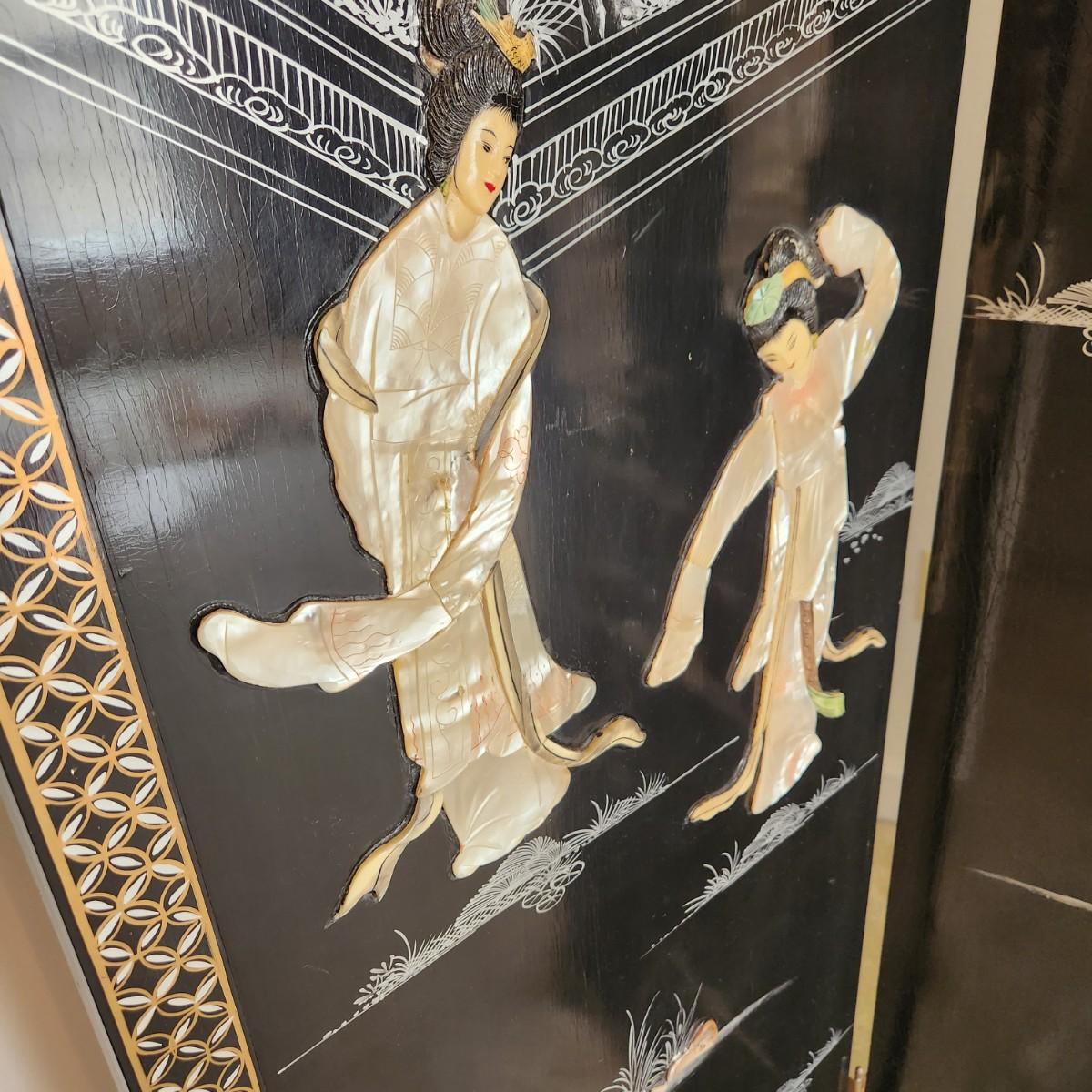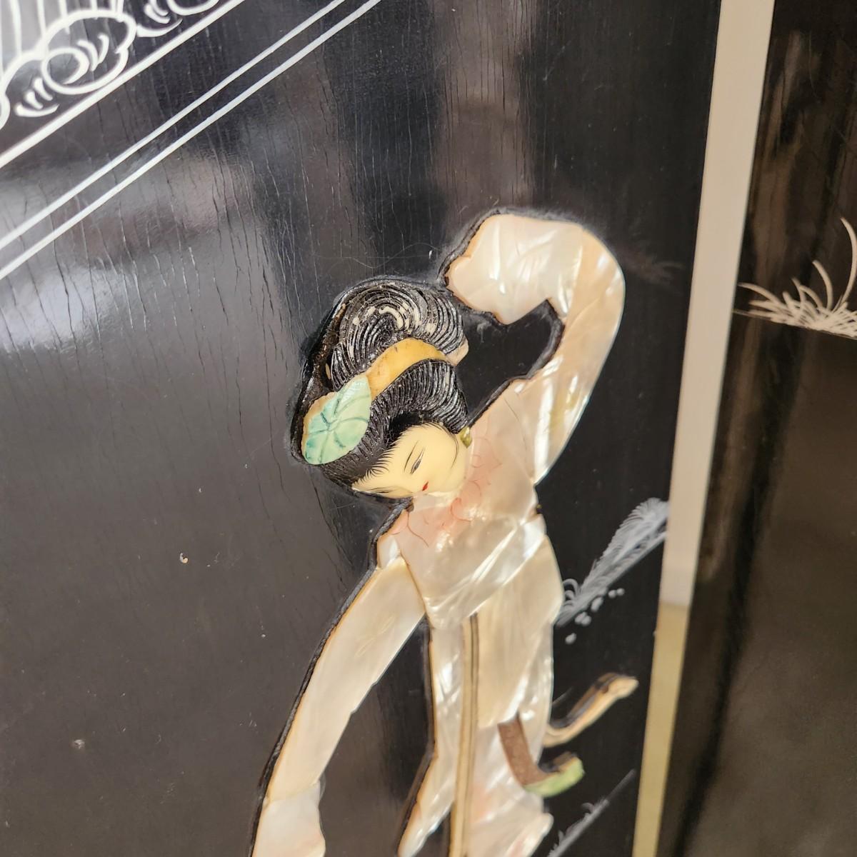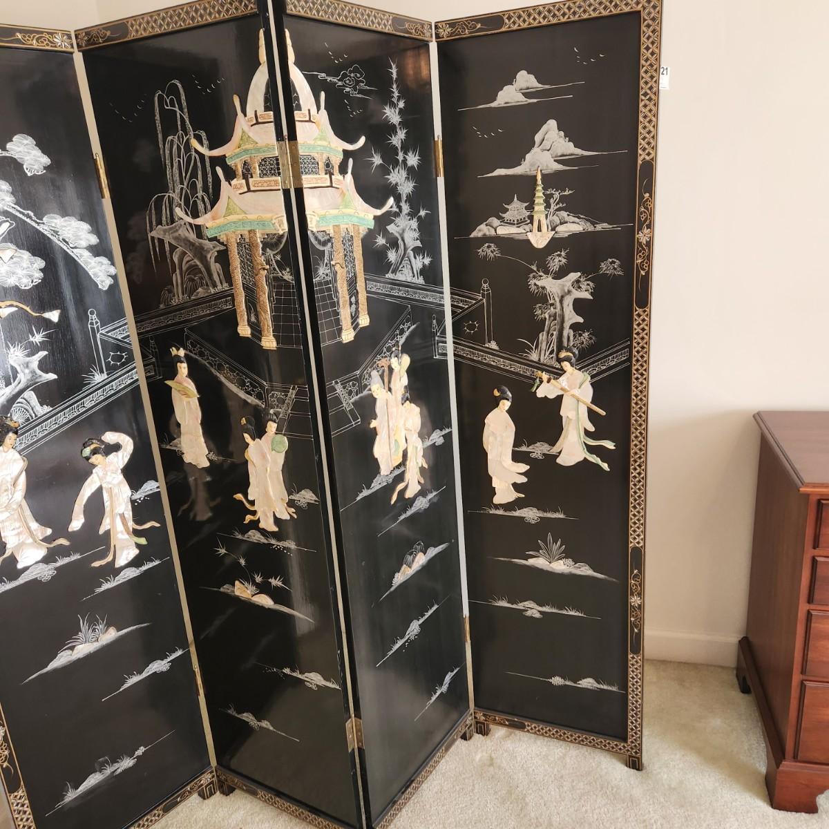 Vintage Asian Chinoiserie Mother of Pearl Hand Painted 4 Panel Screen