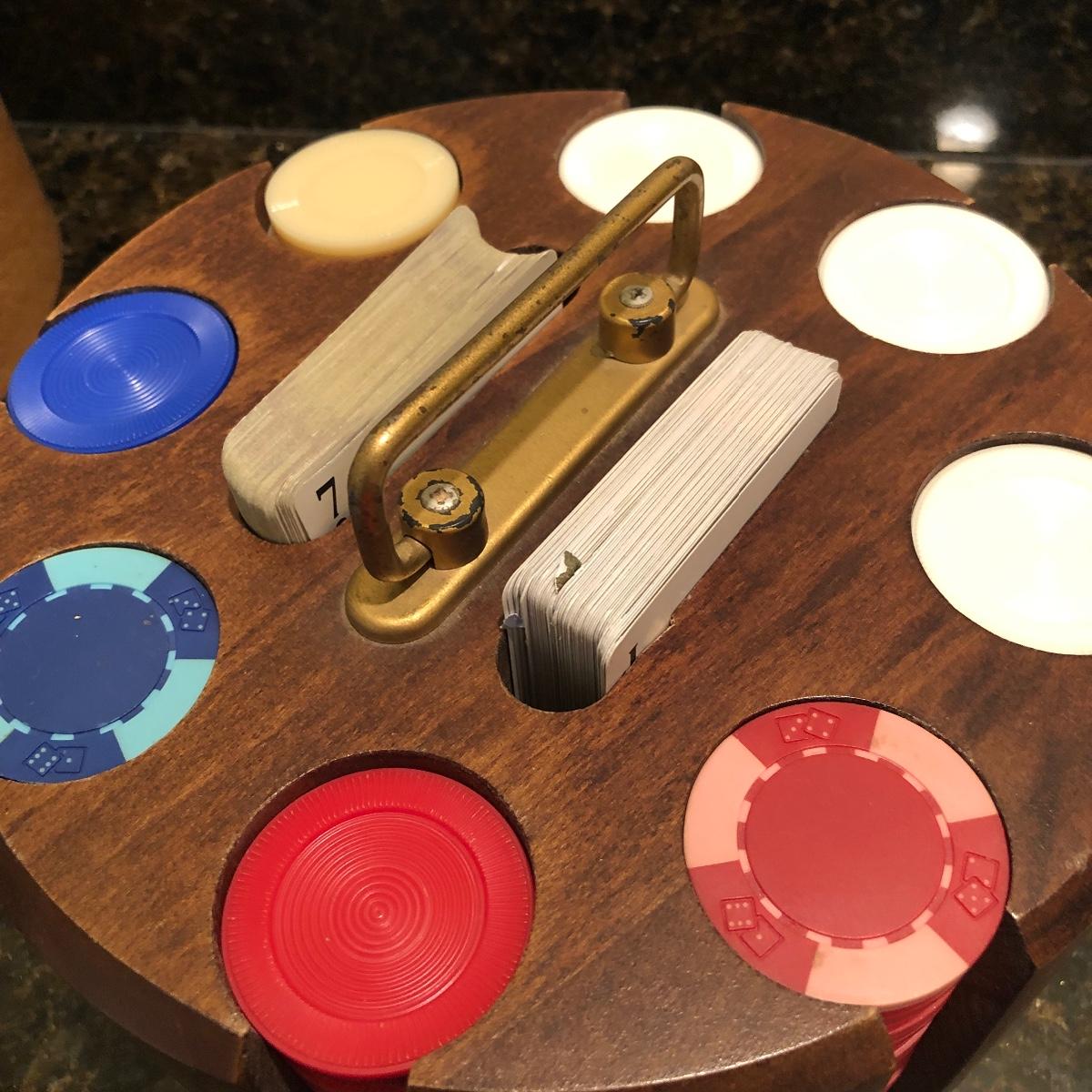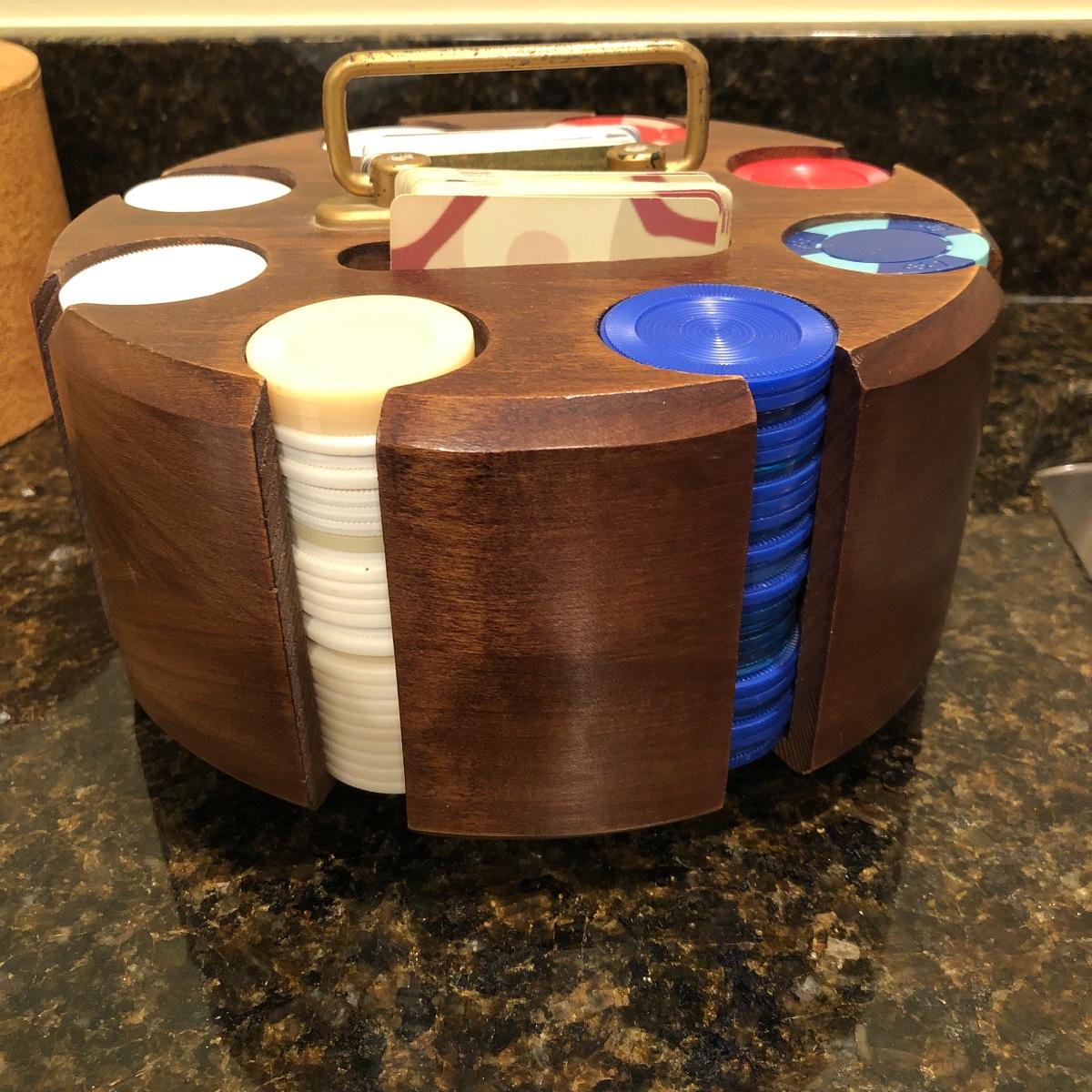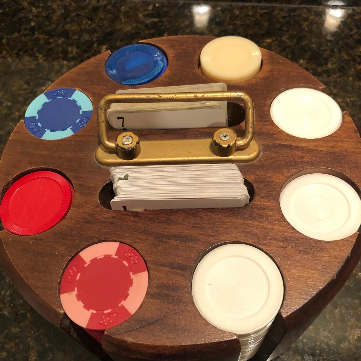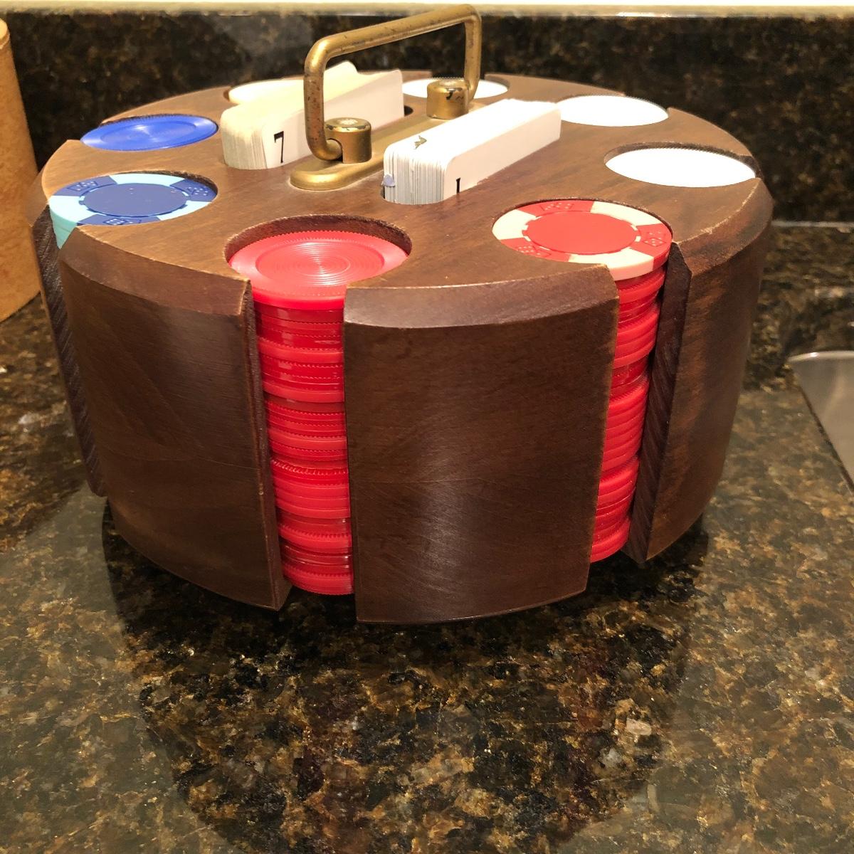 This lot contains one spinning vintage chip and card holder which has a cover, two deck of cards (one is unopened), a fun plastic spilled glass centerpiece and sixteen unopened chips rolls- still in their original wrapping. Chips are nice and heavy. Shipping Available.