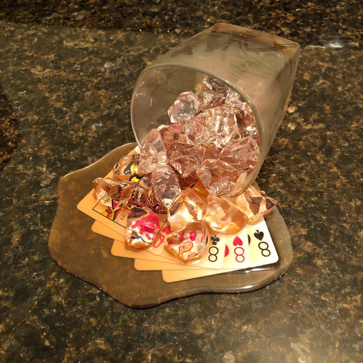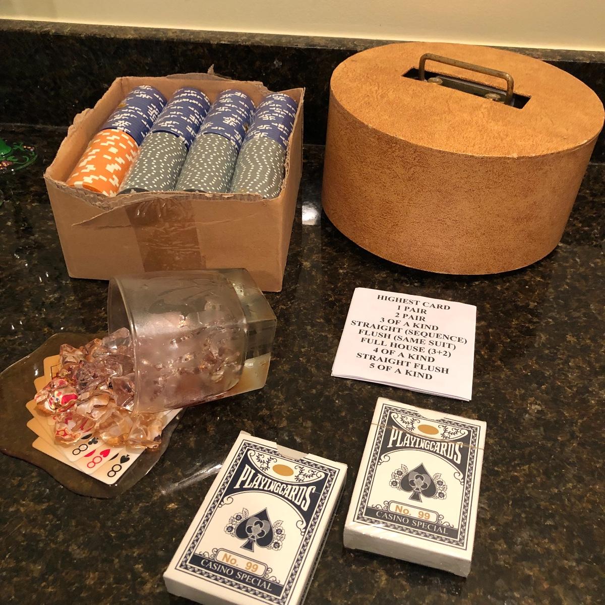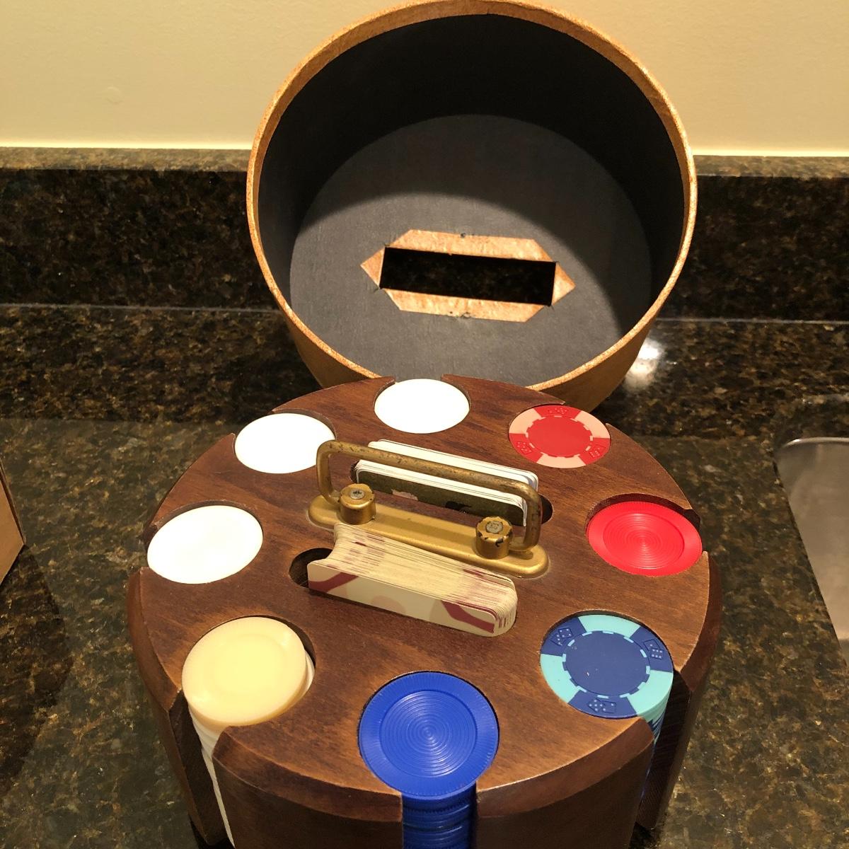 This lot contains one spinning vintage chip and card holder which has a cover, two deck of cards (one is unopened), a fun plastic spilled glass centerpiece and sixteen unopened chips rolls- still in their original wrapping. Chips are nice and heavy. Shipping Available.