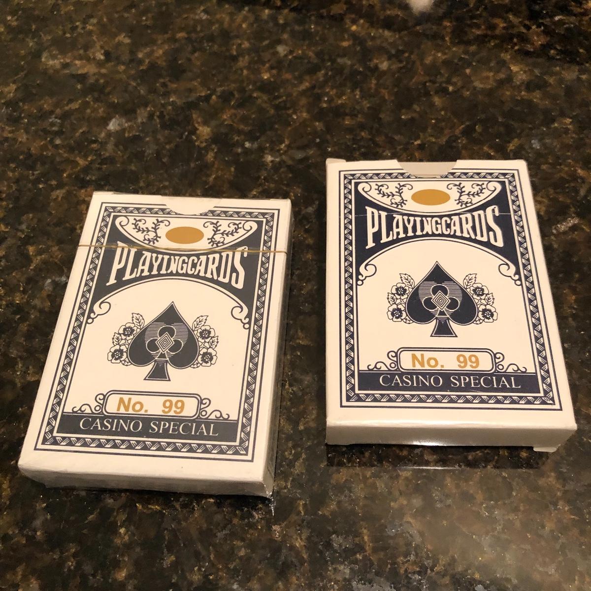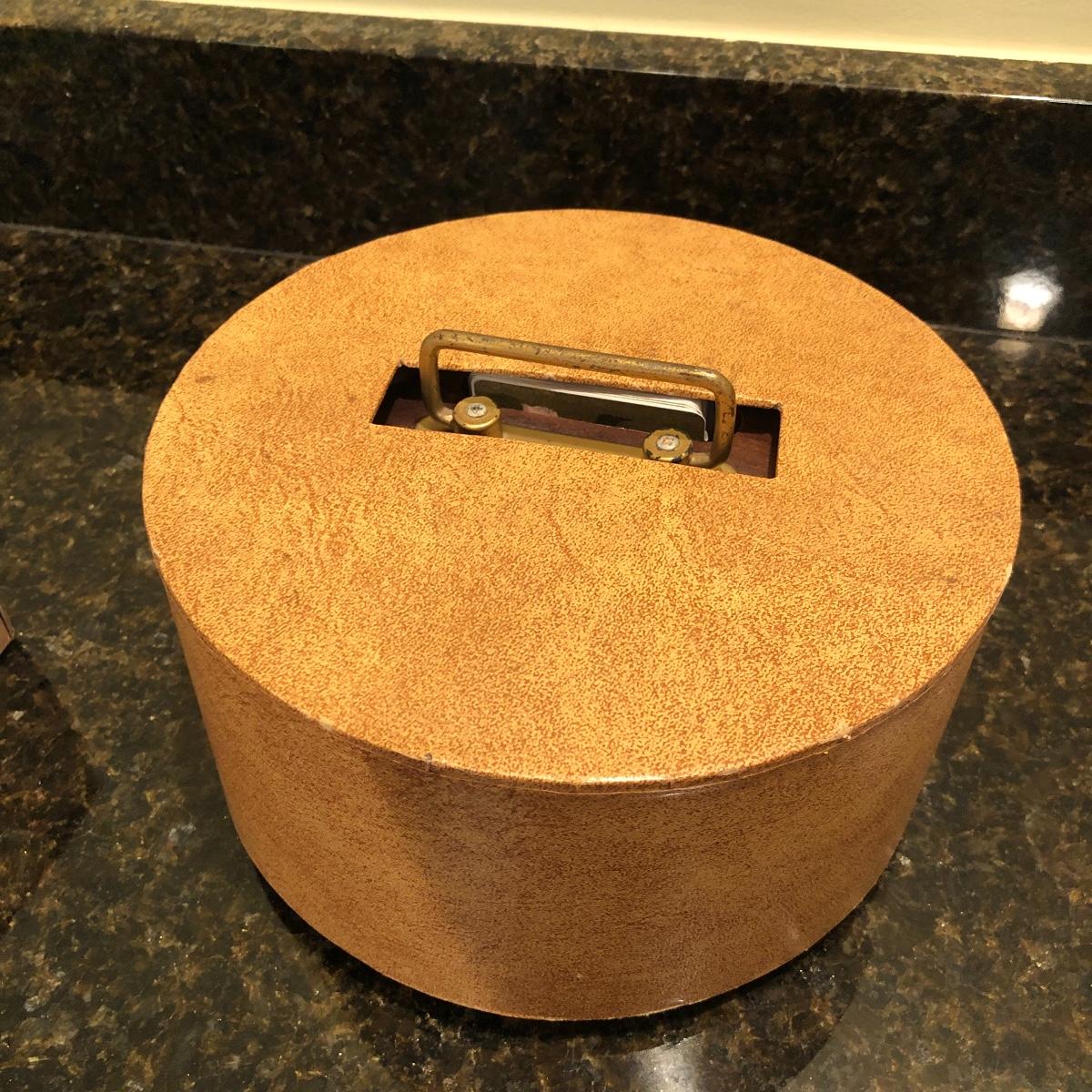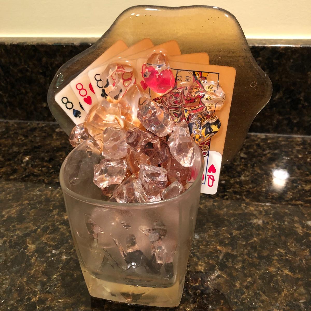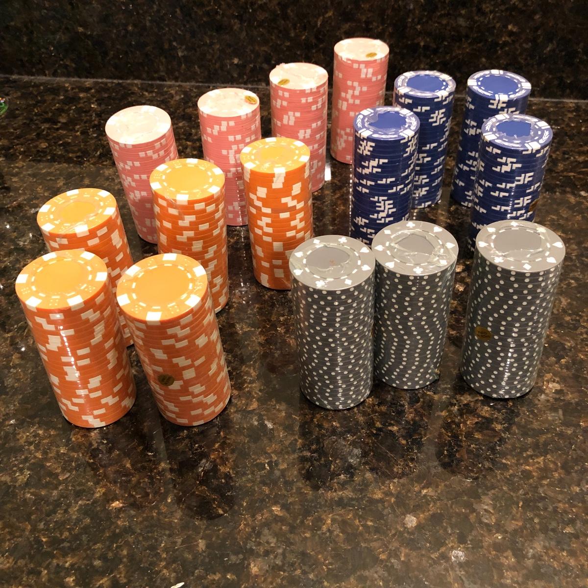 This lot contains one spinning vintage chip and card holder which has a cover, two deck of cards (one is unopened), a fun plastic spilled glass centerpiece and sixteen unopened chips rolls- still in their original wrapping. Chips are nice and heavy. Shipping Available.