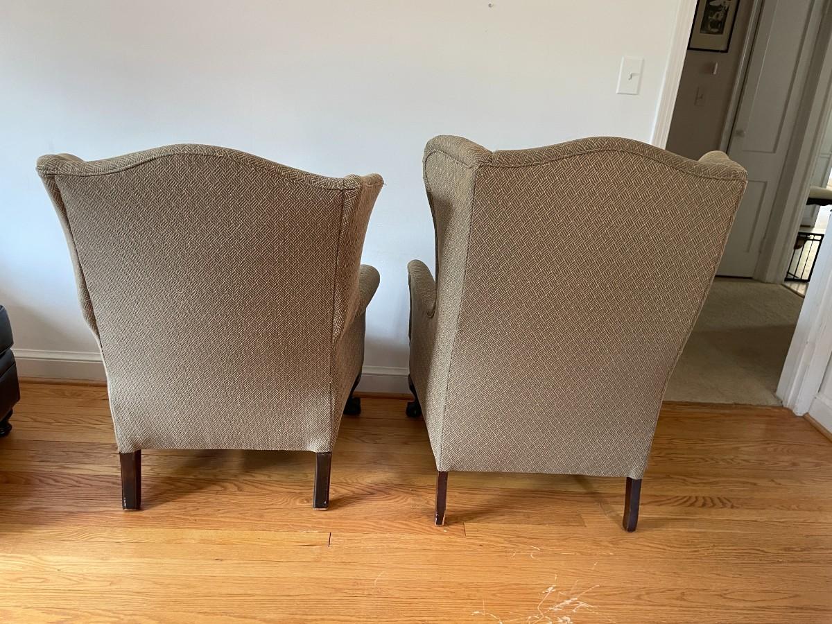 Vintage and sturdy. Really well kept his/hers chairs. Smaller chair ( 40H x 25W x 34L) Largest chair ( 42H x 28W x 31L).