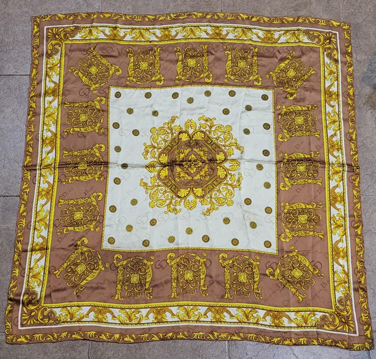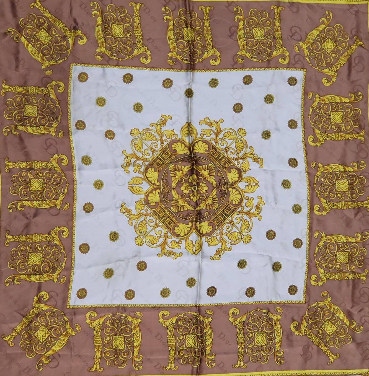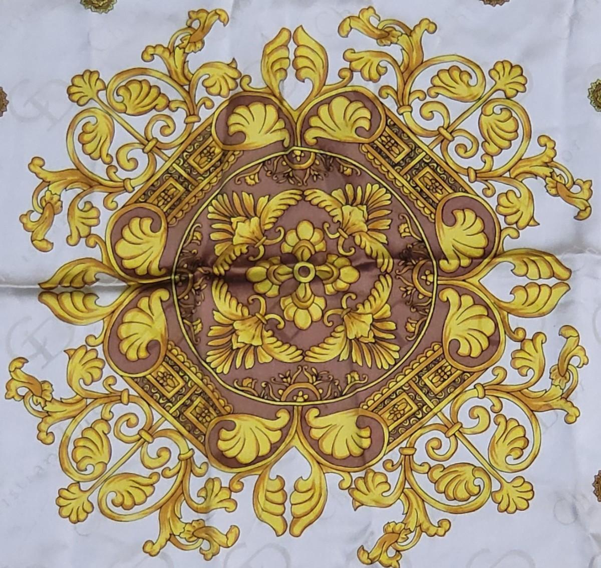 Vintage Christian Dior silk scarf. Measures 35" squared. Rolled stitched edges. Gold, yellow & light brown leaf scroll patterns and CD signature throughout the scarf.
