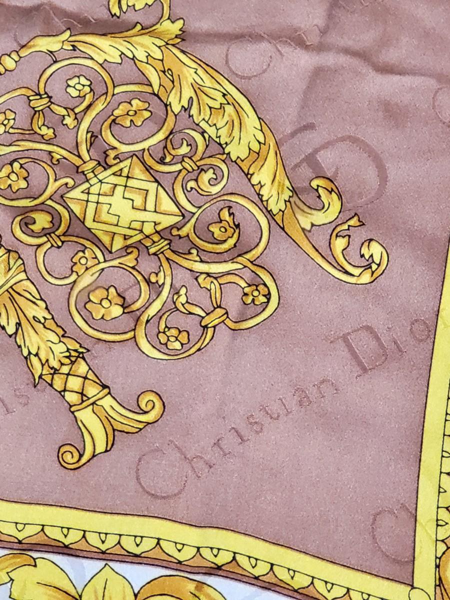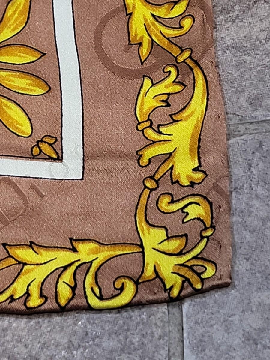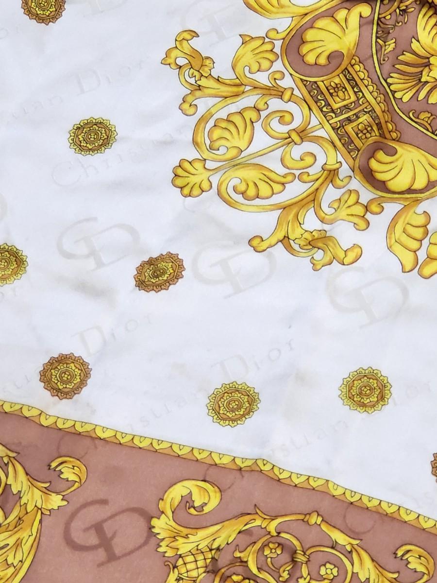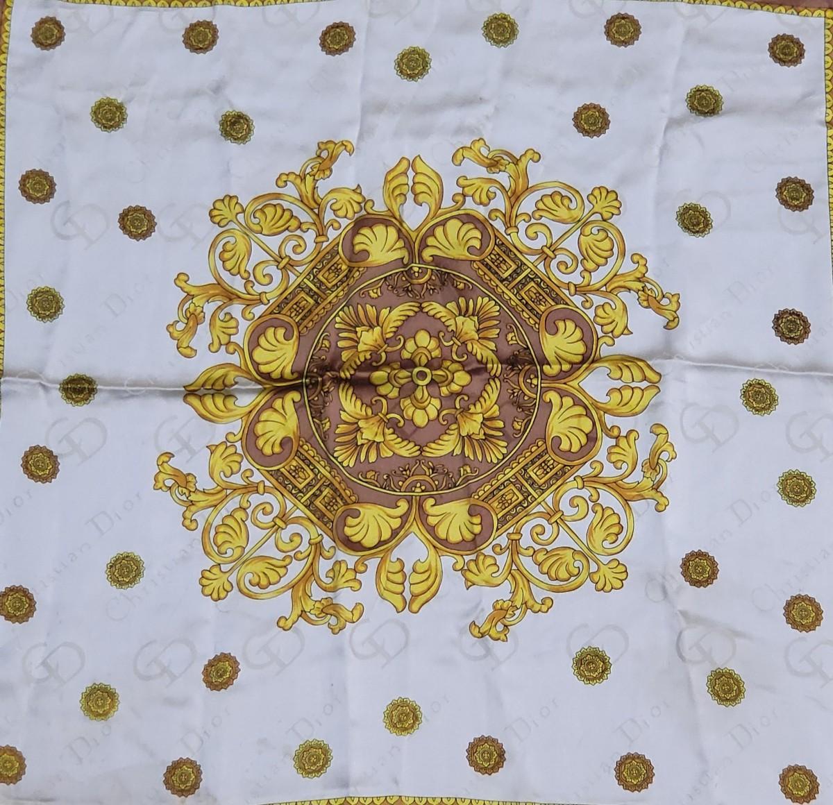 Vintage Christian Dior silk scarf. Measures 35" squared. Rolled stitched edges. Gold, yellow & light brown leaf scroll patterns and CD signature throughout the scarf.