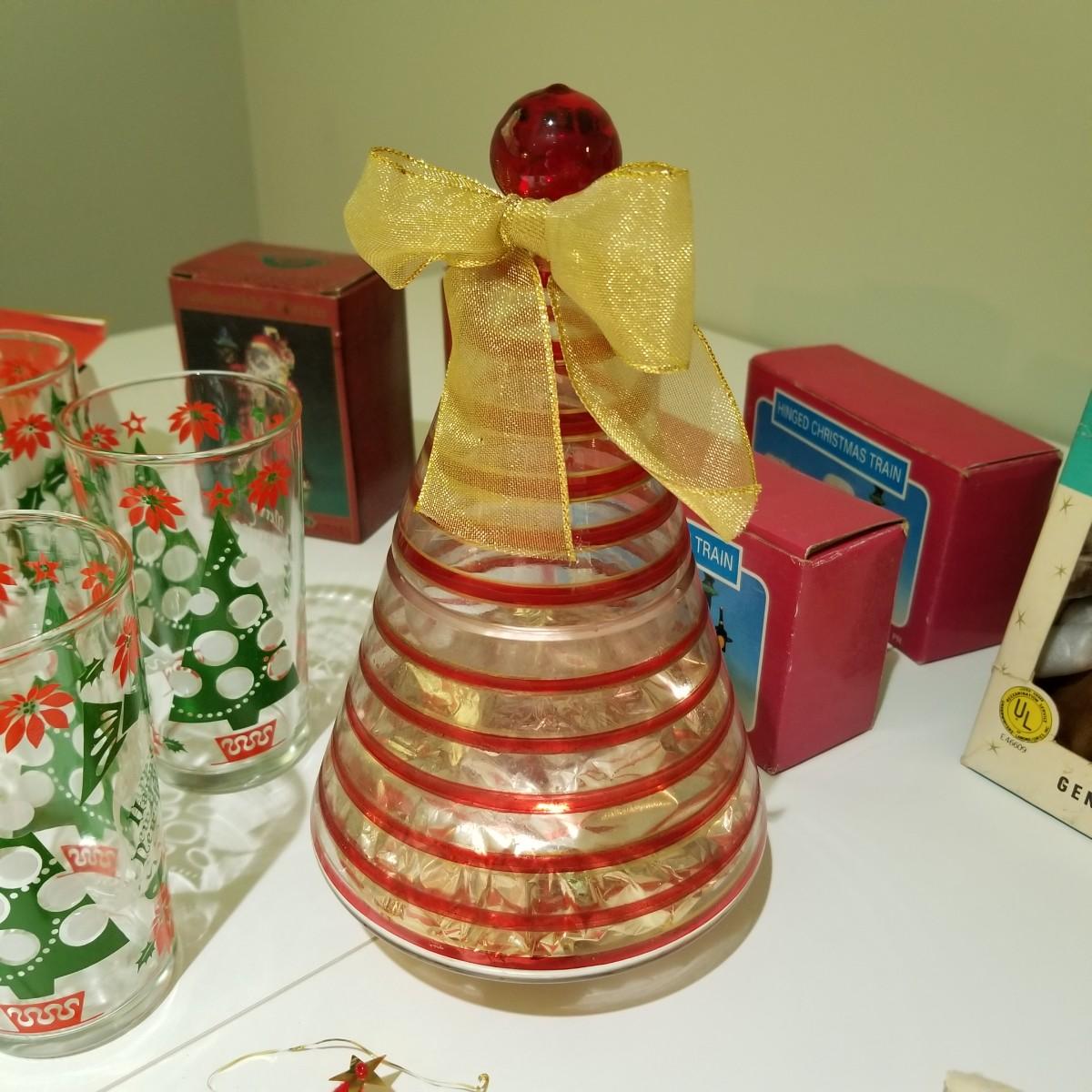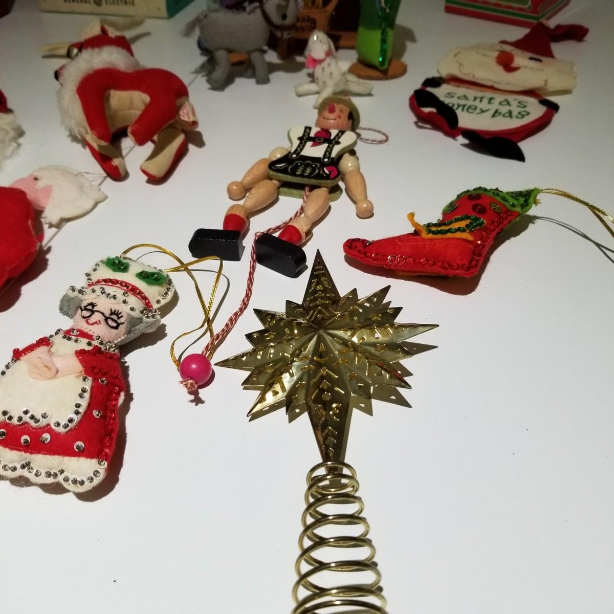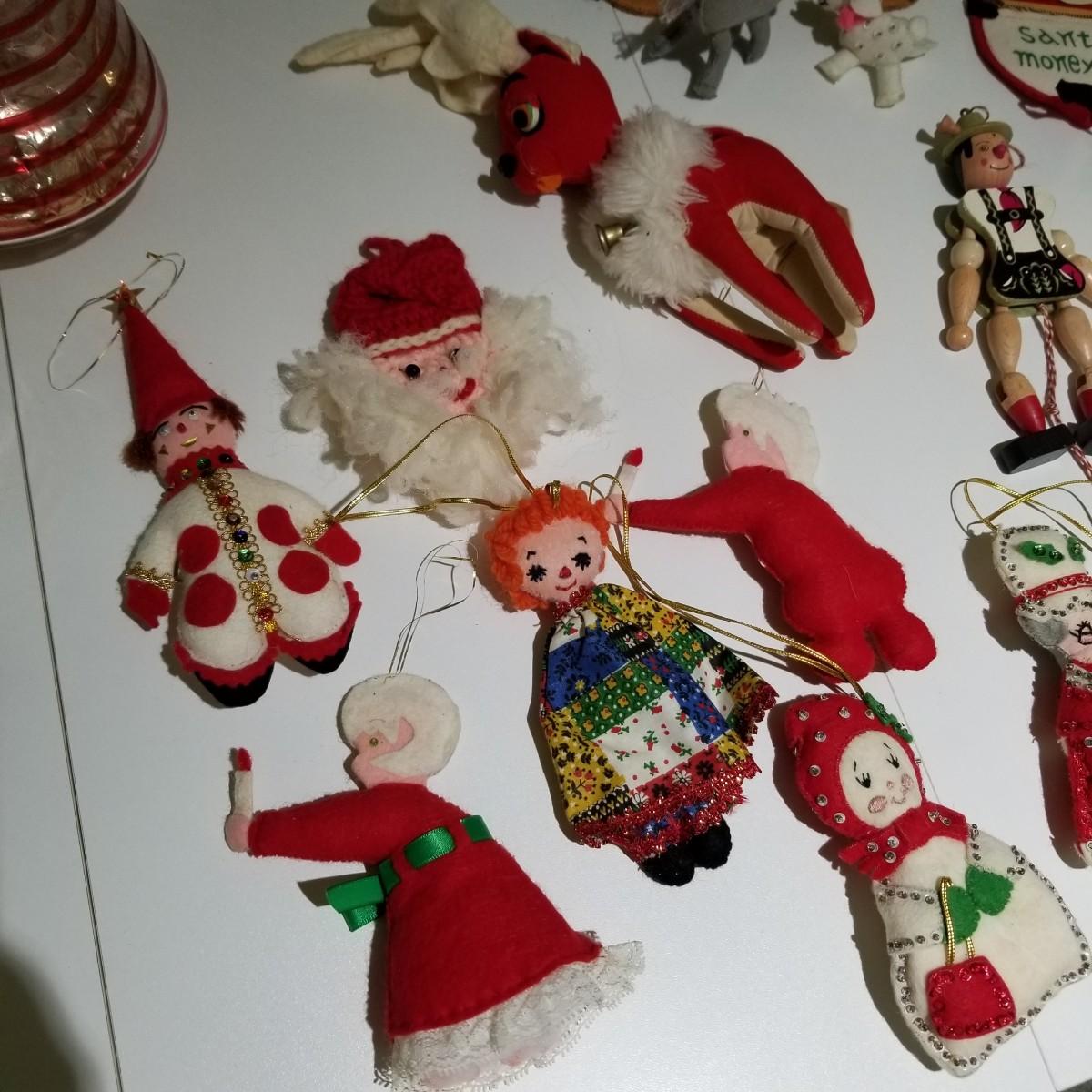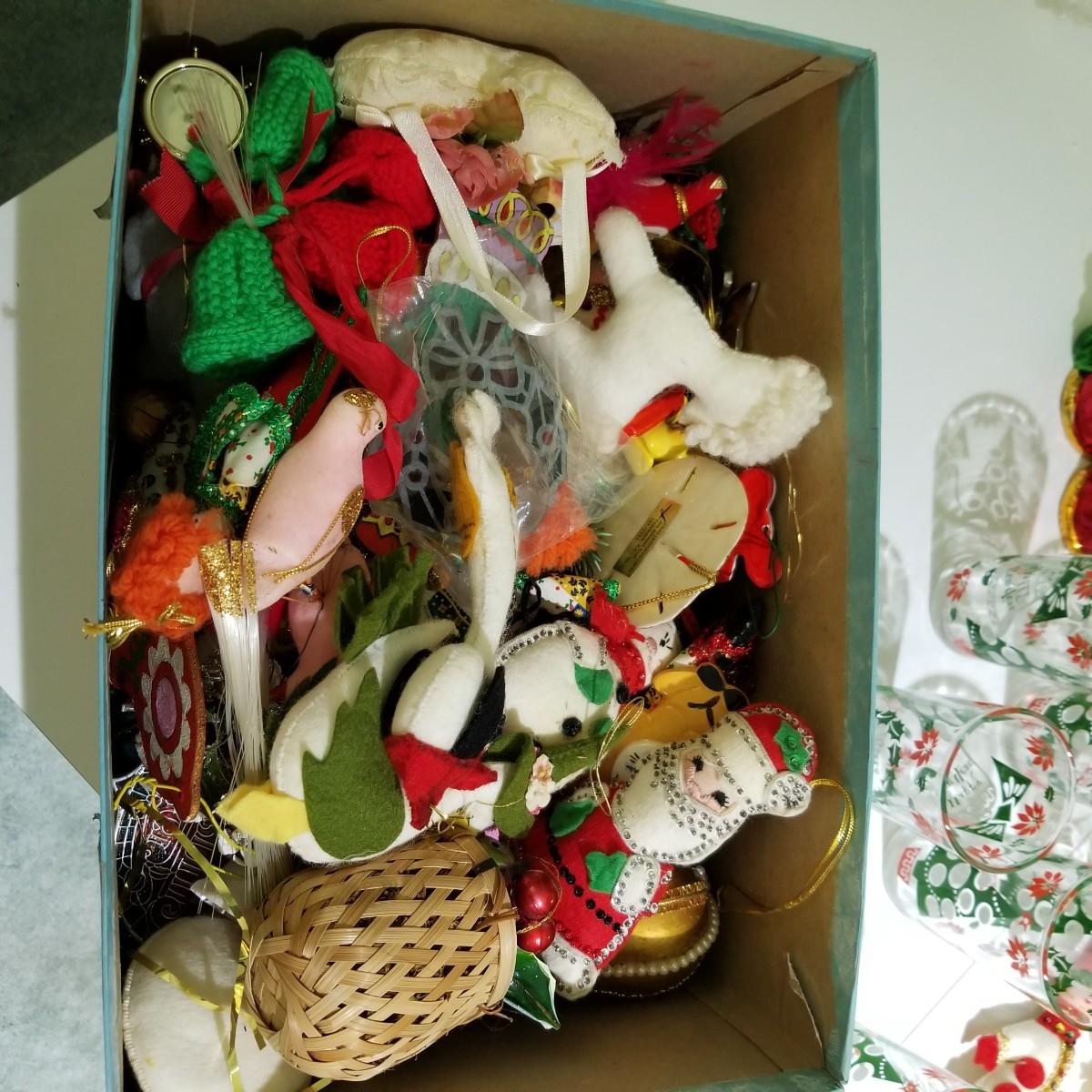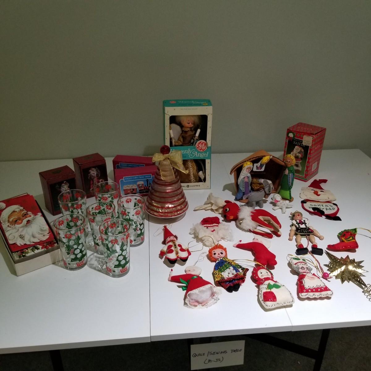 A collection of vintage holiday items. Glasses, figurines, ornaments of all types. Lighted angel tree topper, handmade felt pieces and treasures. Also includes three pinecone items, one tree, 10"x26", and two wreaths, the largest is16"d. See photos for detail.  Shipping available.
