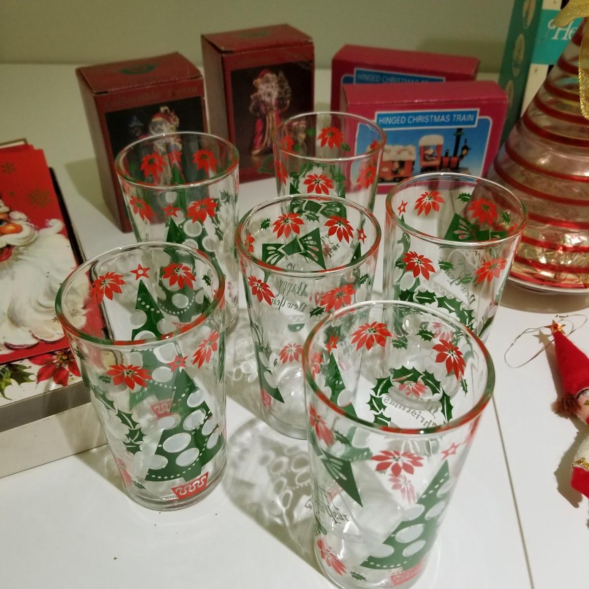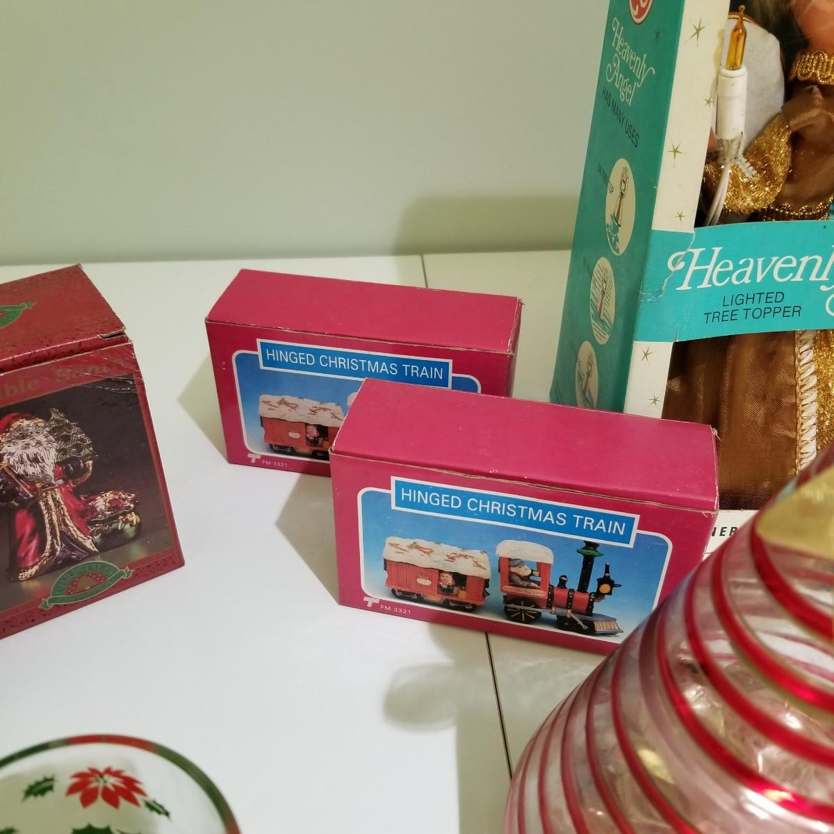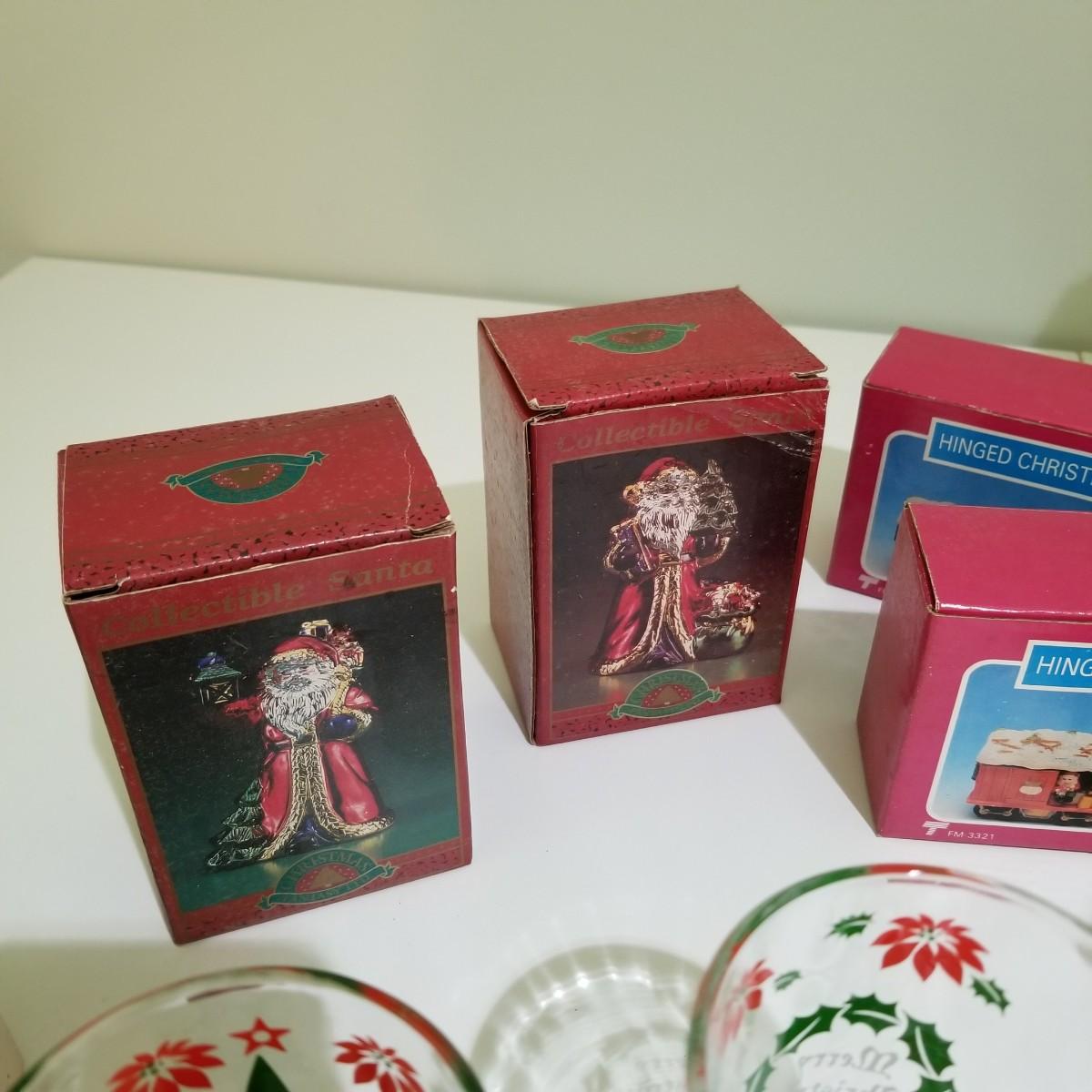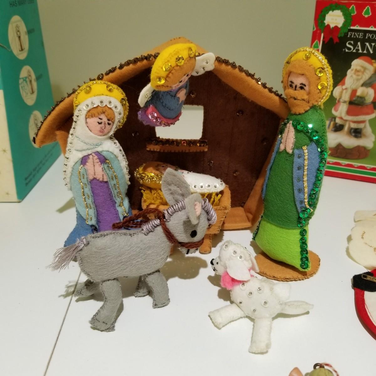 A collection of vintage holiday items. Glasses, figurines, ornaments of all types. Lighted angel tree topper, handmade felt pieces and treasures. Also includes three pinecone items, one tree, 10"x26", and two wreaths, the largest is16"d. See photos for detail.  Shipping available.