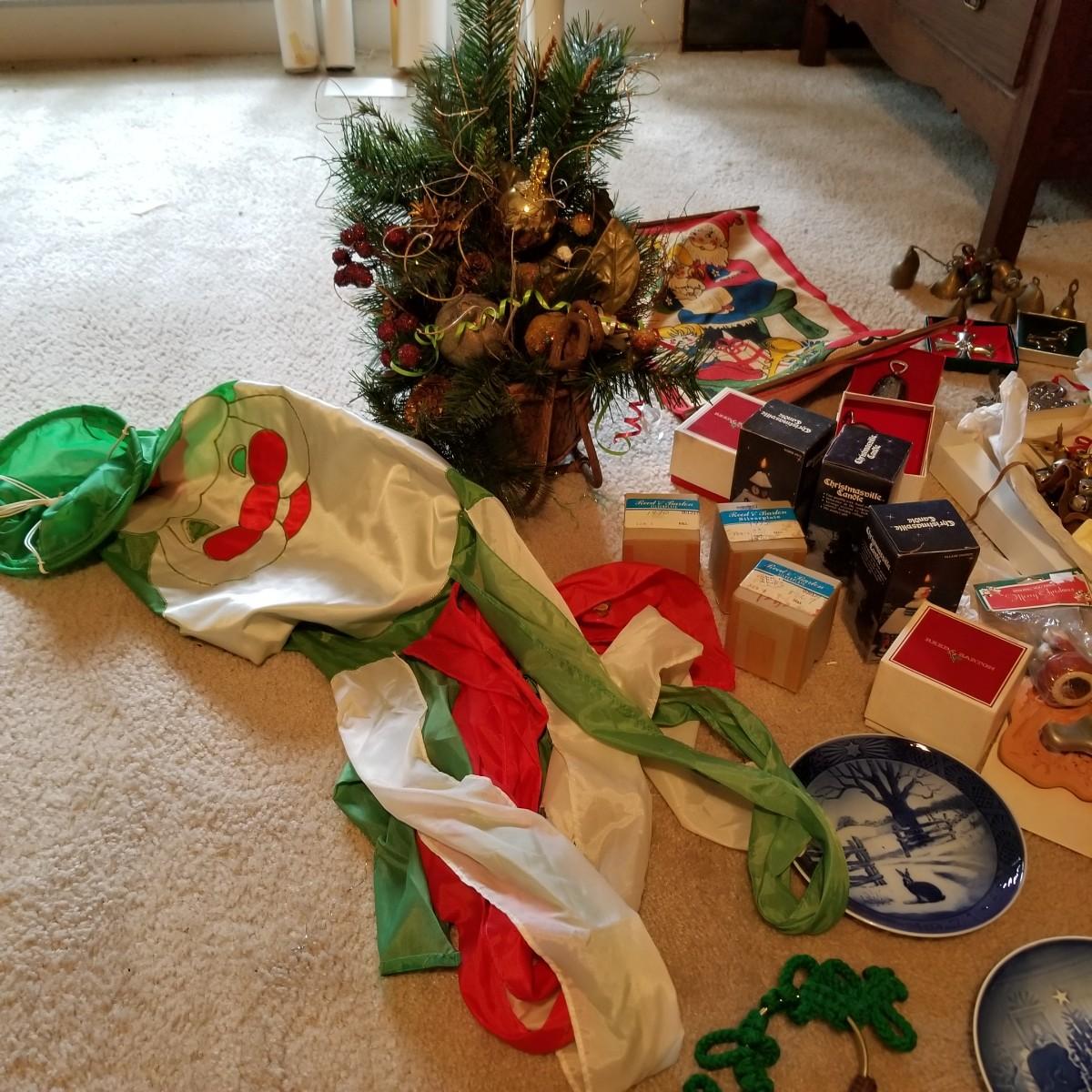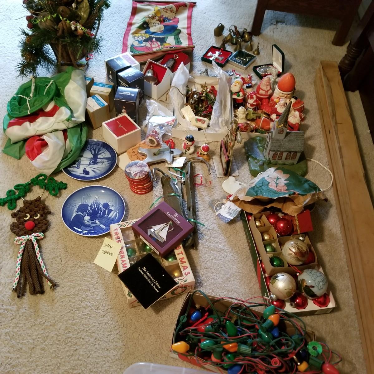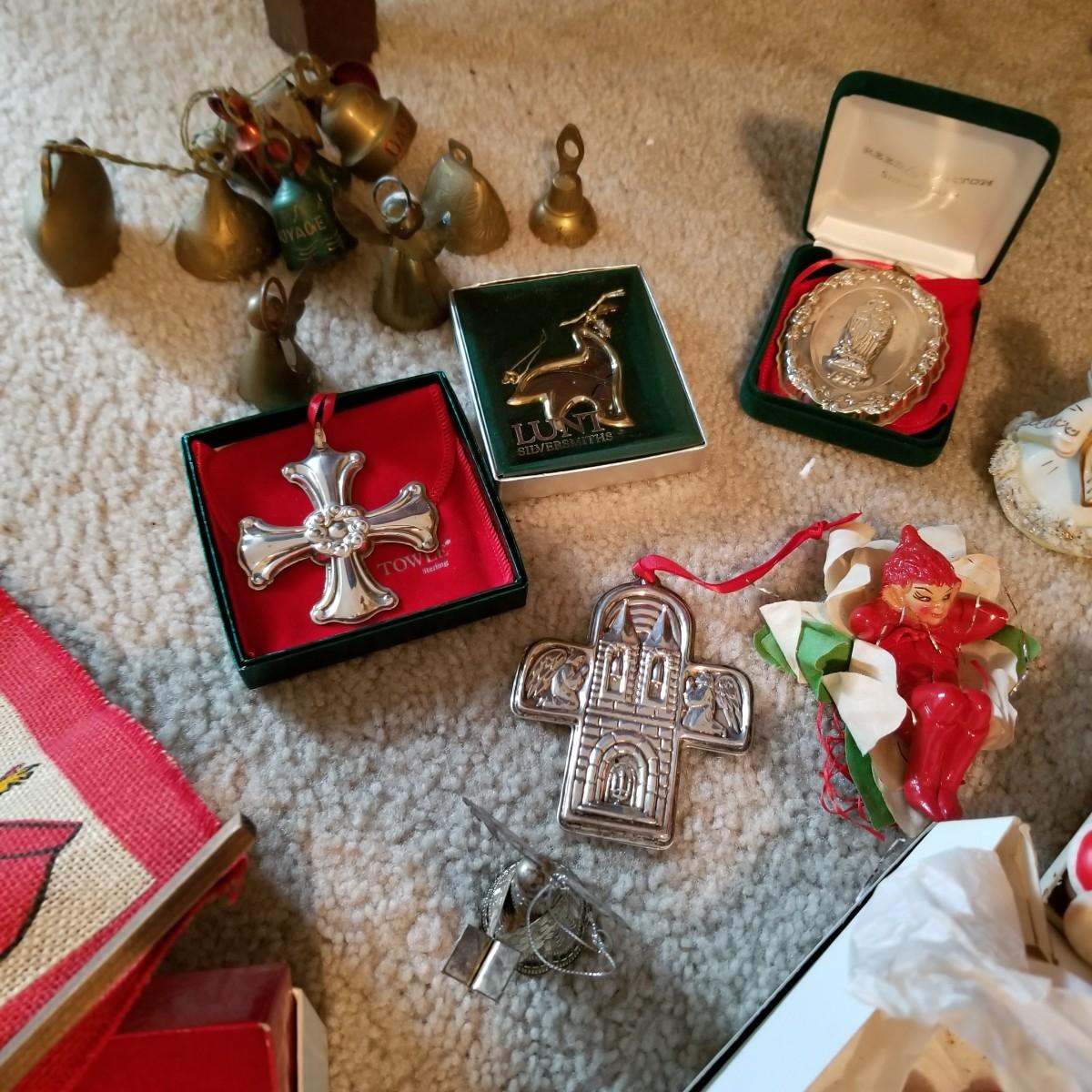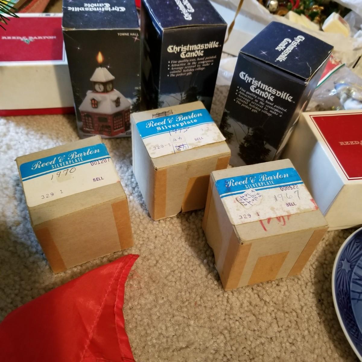 Santa figures, glass bulbs, Reed & Barton silverplate bells, ornaments and more. Two Royal Copenhagen plates, both 1971. A ceramic lighted church, a rustic wooden sleigh arrangement, and one pair of vintage wood and metal ice skates. See photos for detail. Most items in good condition. Shipping available.