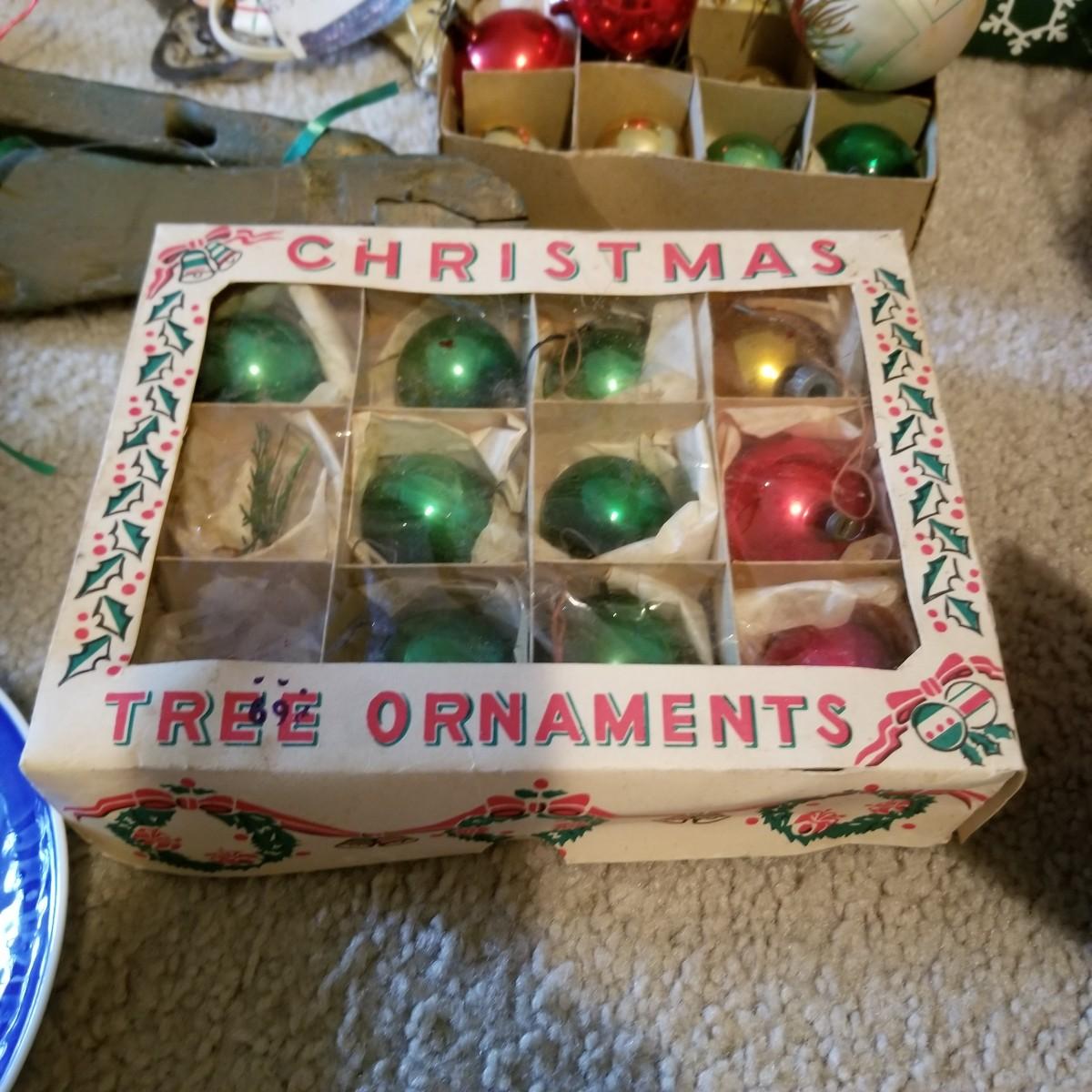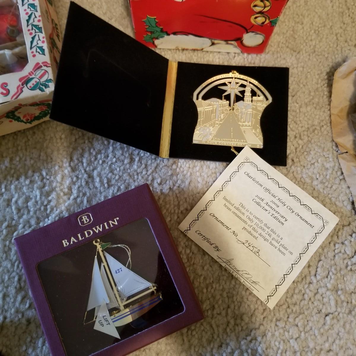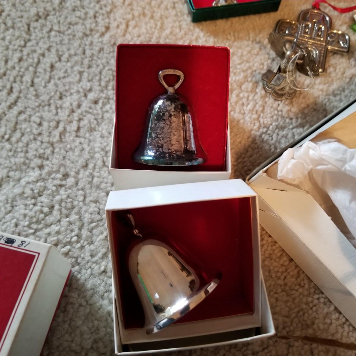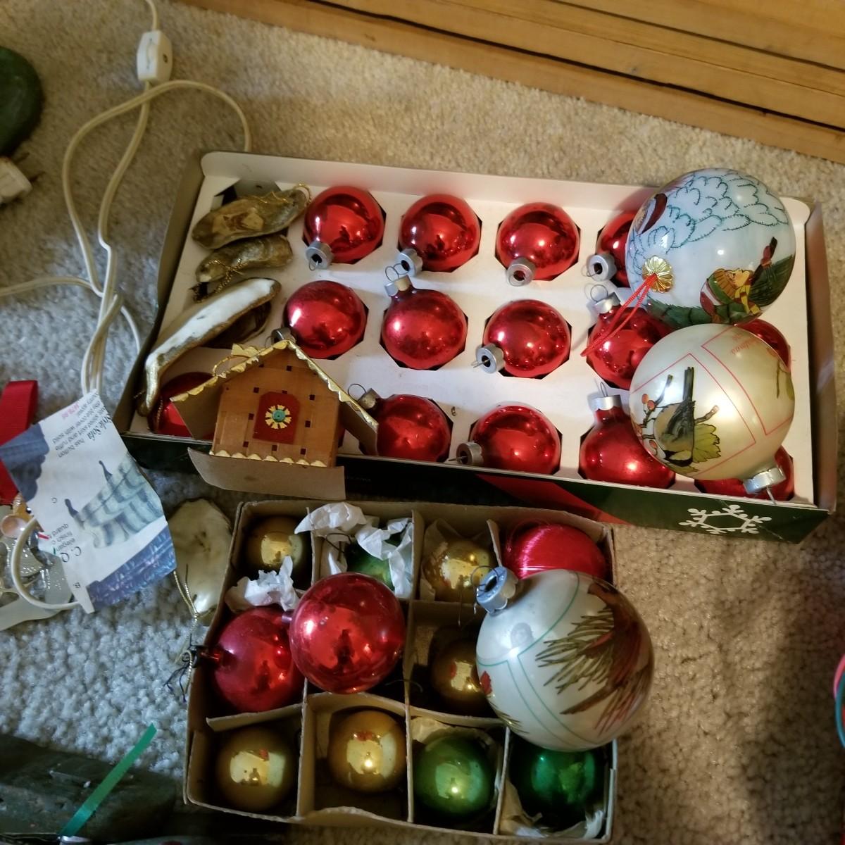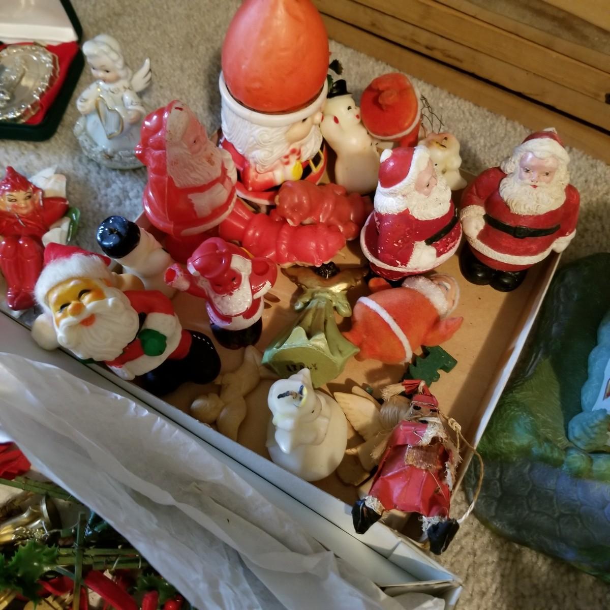 Santa figures, glass bulbs, Reed & Barton silverplate bells, ornaments and more. Two Royal Copenhagen plates, both 1971. A ceramic lighted church, a rustic wooden sleigh arrangement, and one pair of vintage wood and metal ice skates. See photos for detail. Most items in good condition. Shipping available.