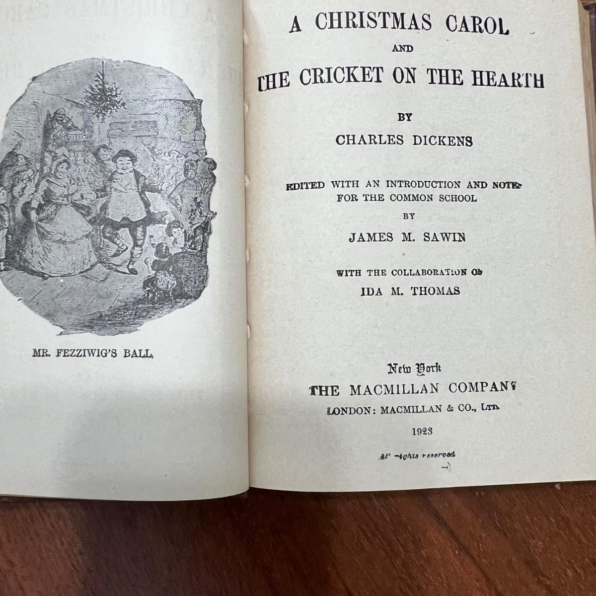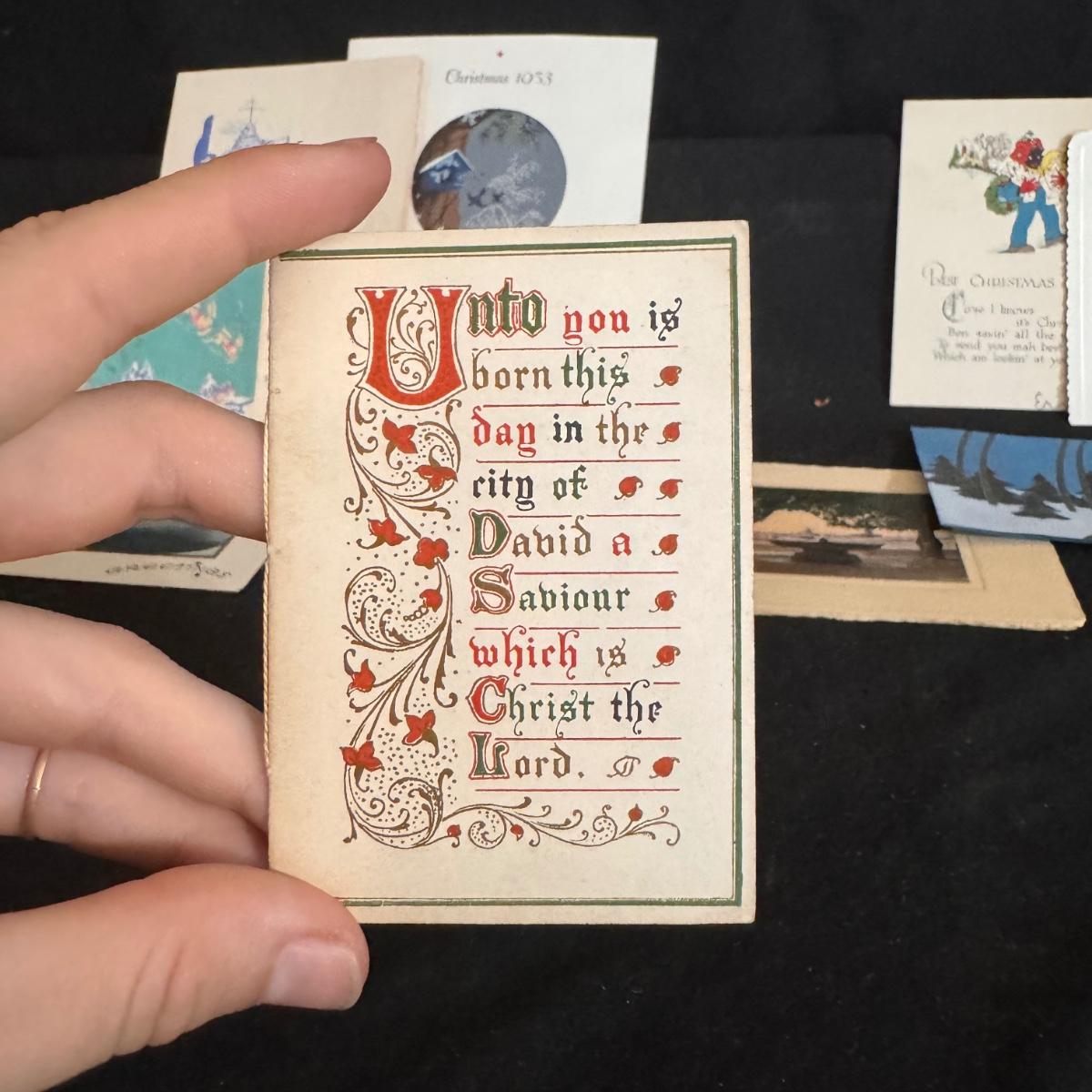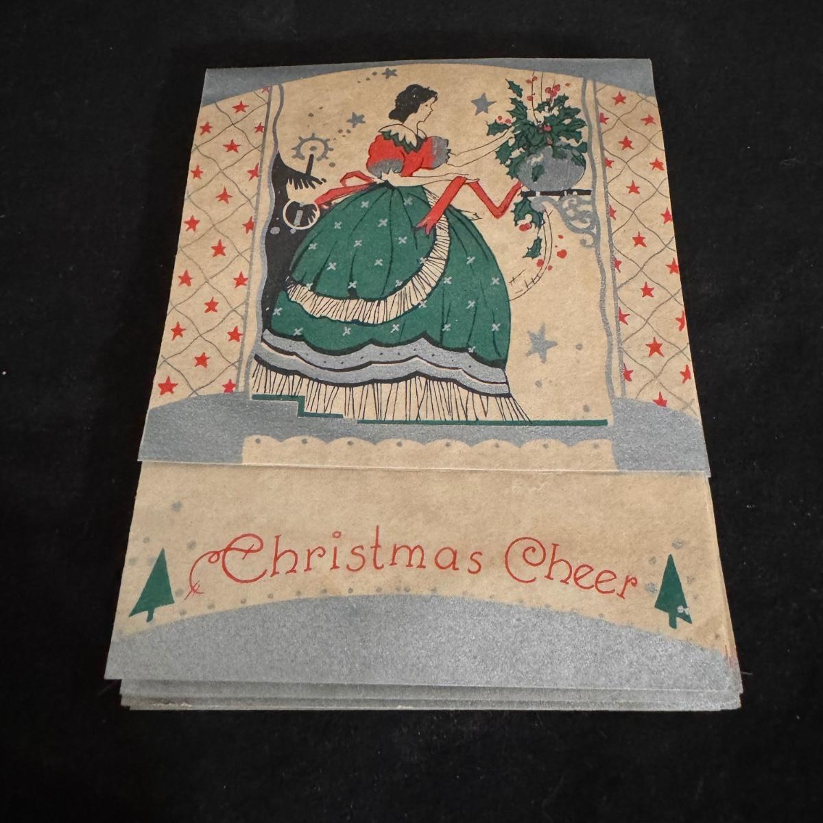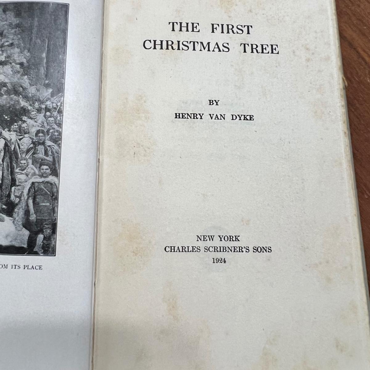 This lot includes three vintage books (The Signs in the Christmas Fire by William Allen Knight, The First Christmas Tree by Henry Van Dyke, and A Christmas Carol by Charles Dickens), one silver metal bell with red ribbon, one porcelain bowl by Villeroy & Boch, a set of 50 Christmas coasters in a circular tin, a tiny box of Christmas matches, a square tile with a reindeer painted, a snowman ornament, a small three kings display, and several vintage Christmas cards. The coaster tin measures 3.95” x 3”H. Shipping available.
