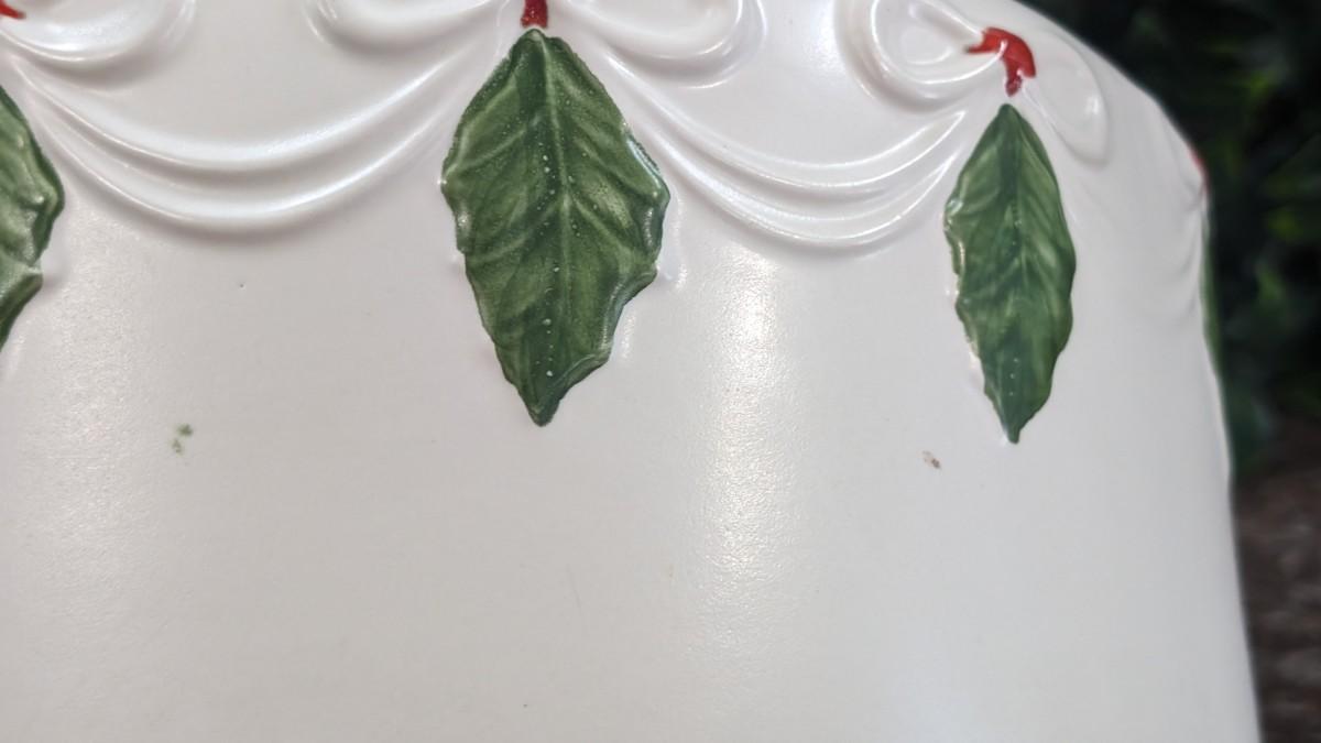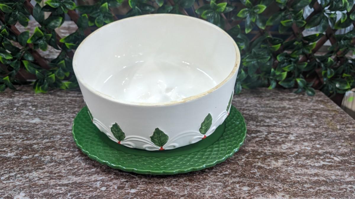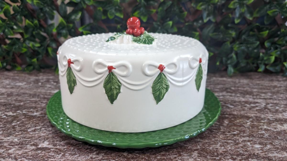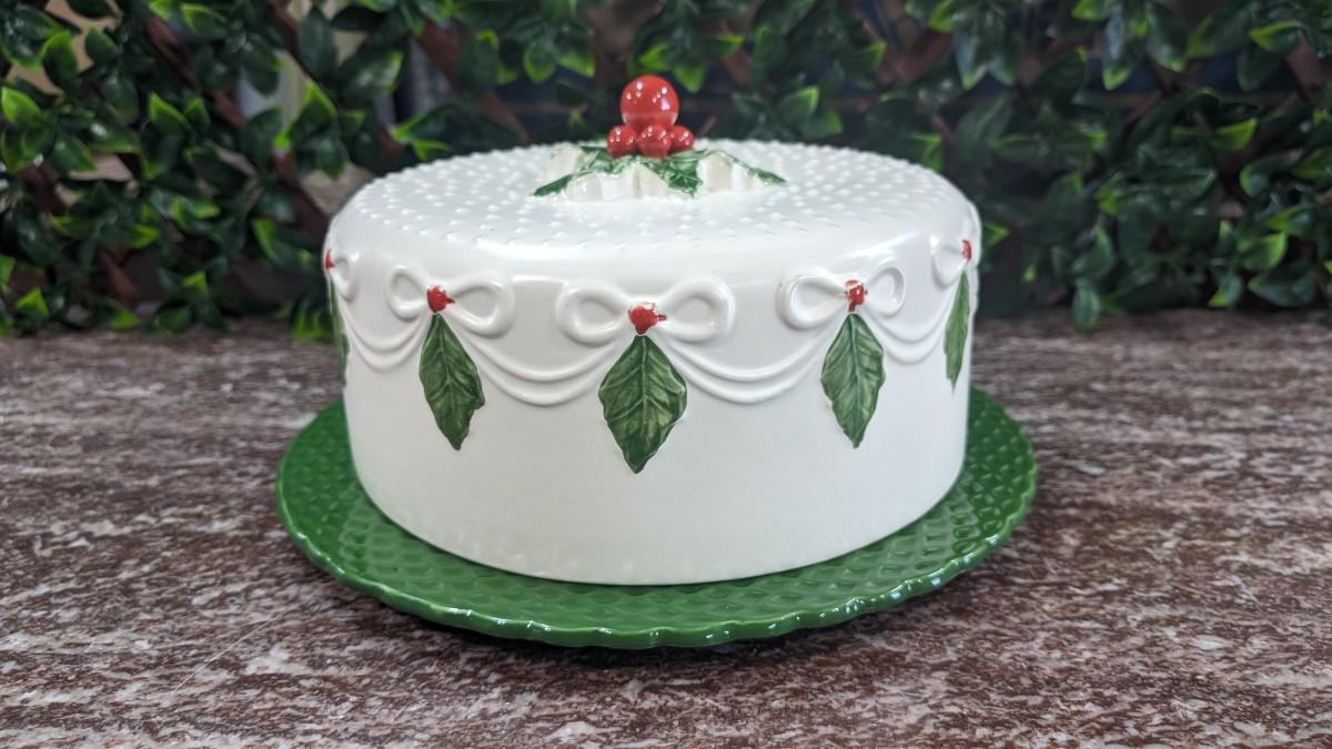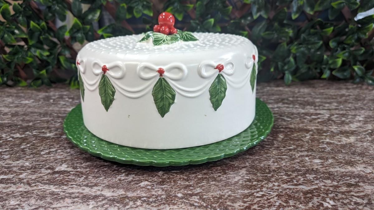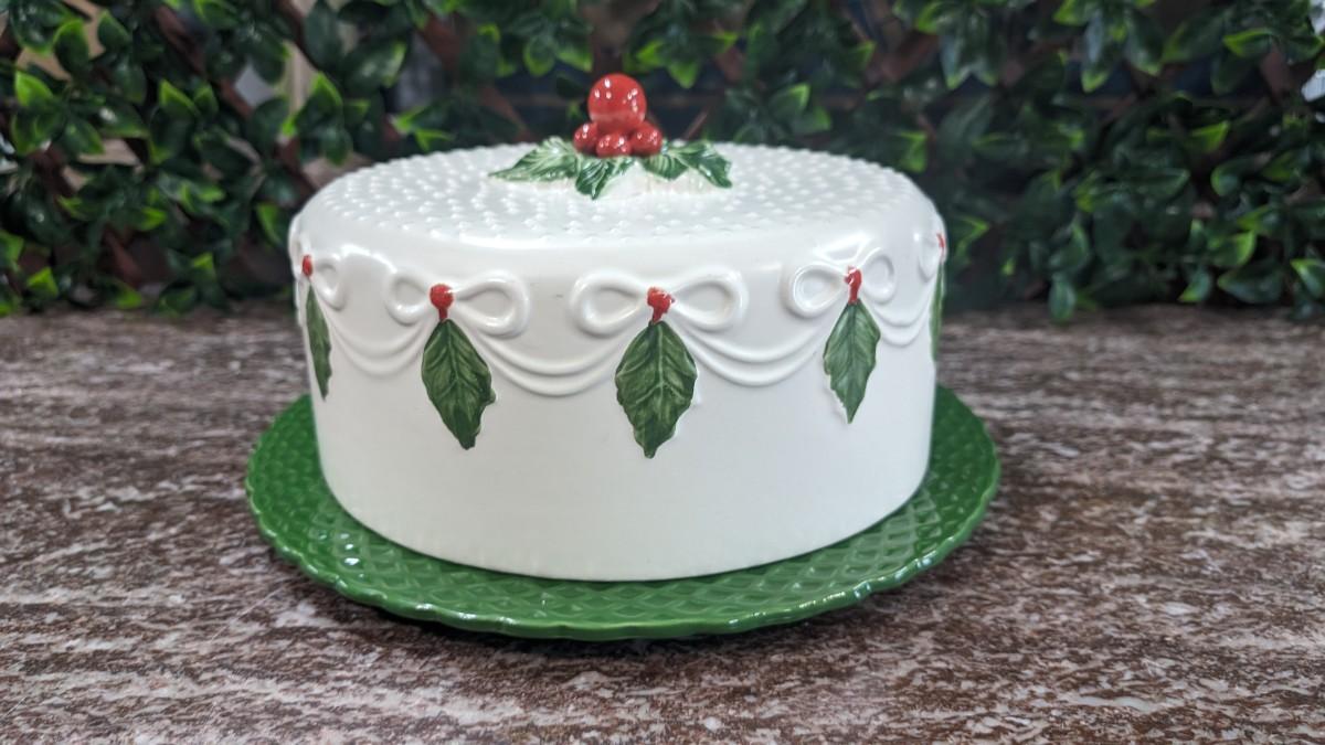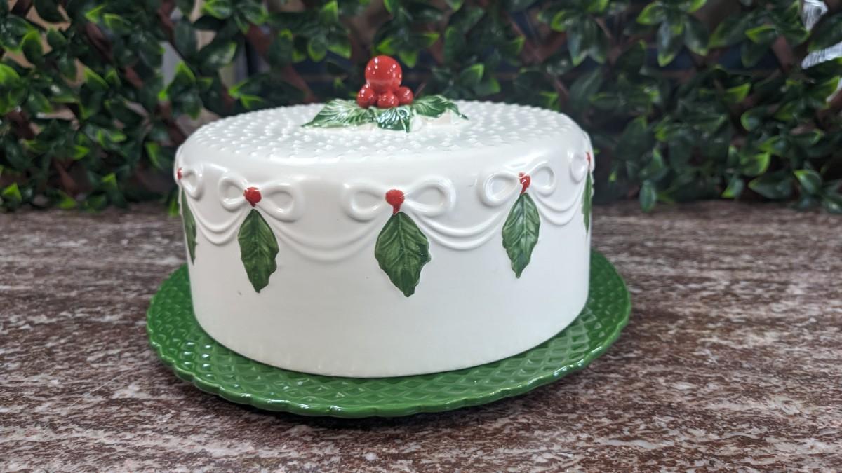 Vintage Christmas Cake Plate and Cover Porcelain Holly Berry Bows Portugal