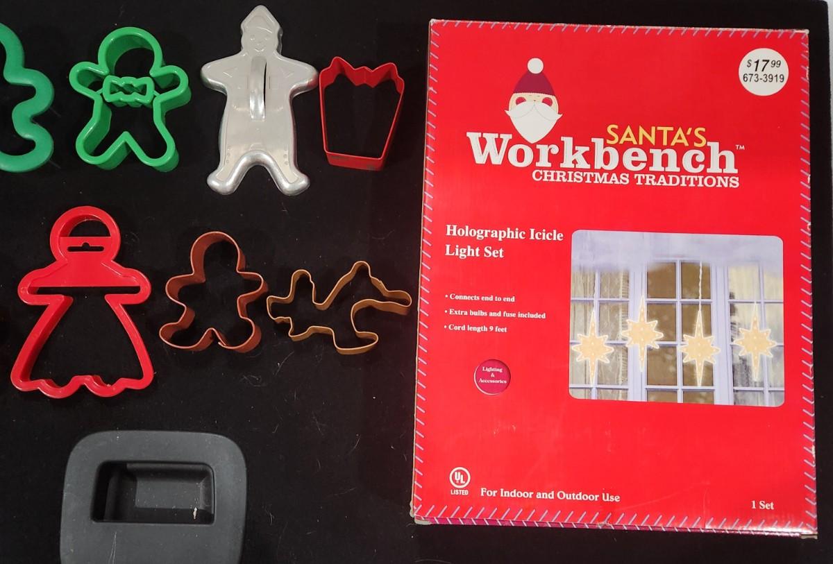 Vintage Christmas Cookie Cutter Gingerbread & Boston Warehouse Spreaders. Also Santa's Work bench Icicle Decorations
