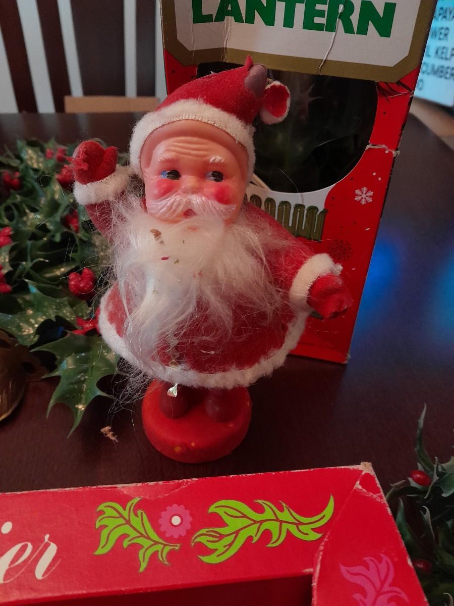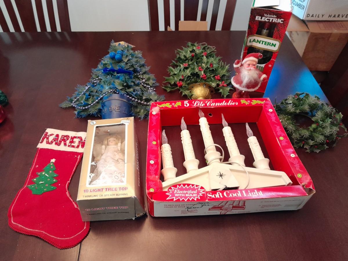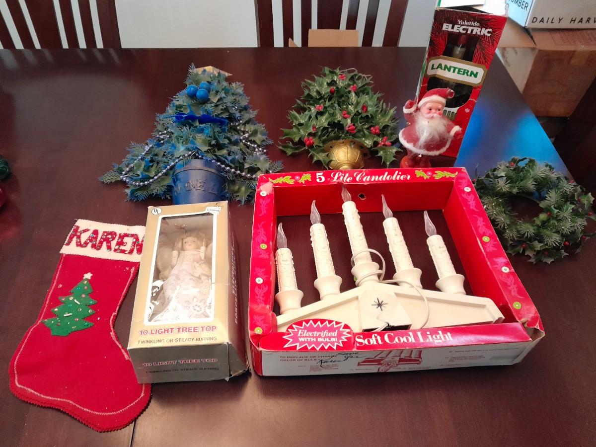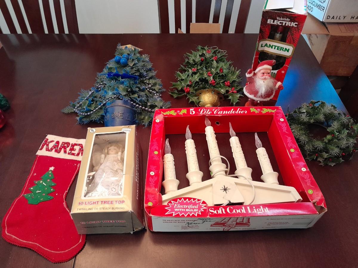 VINTAGE CHRISTMAS DECORATIONS, CANDLES, ELECTRIC LANTERN, SANTA FIGURE, FAUX WALLTREES AND MORE
