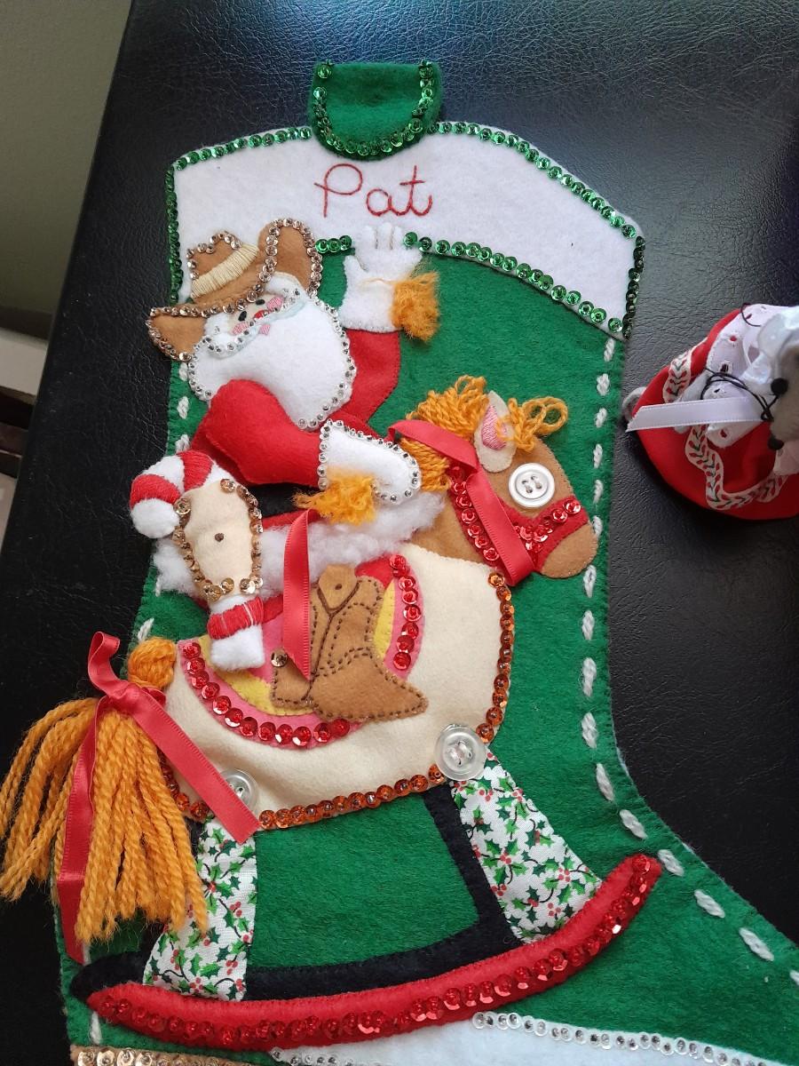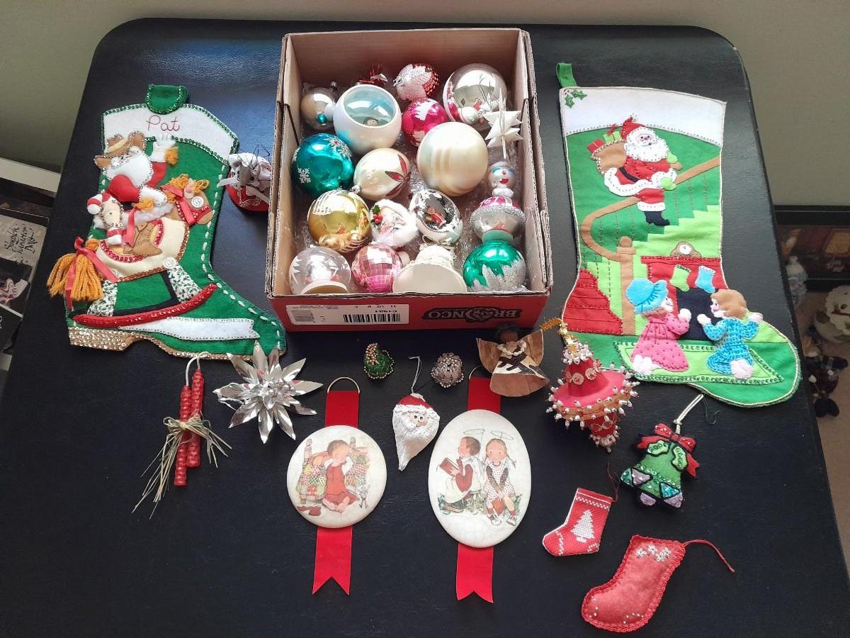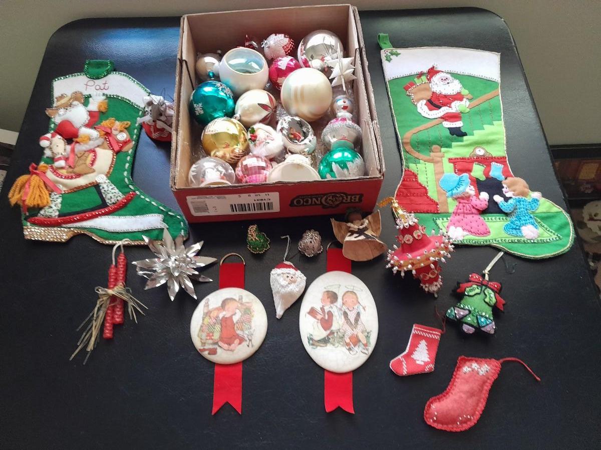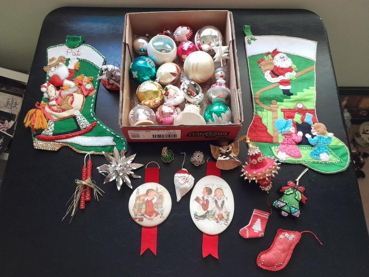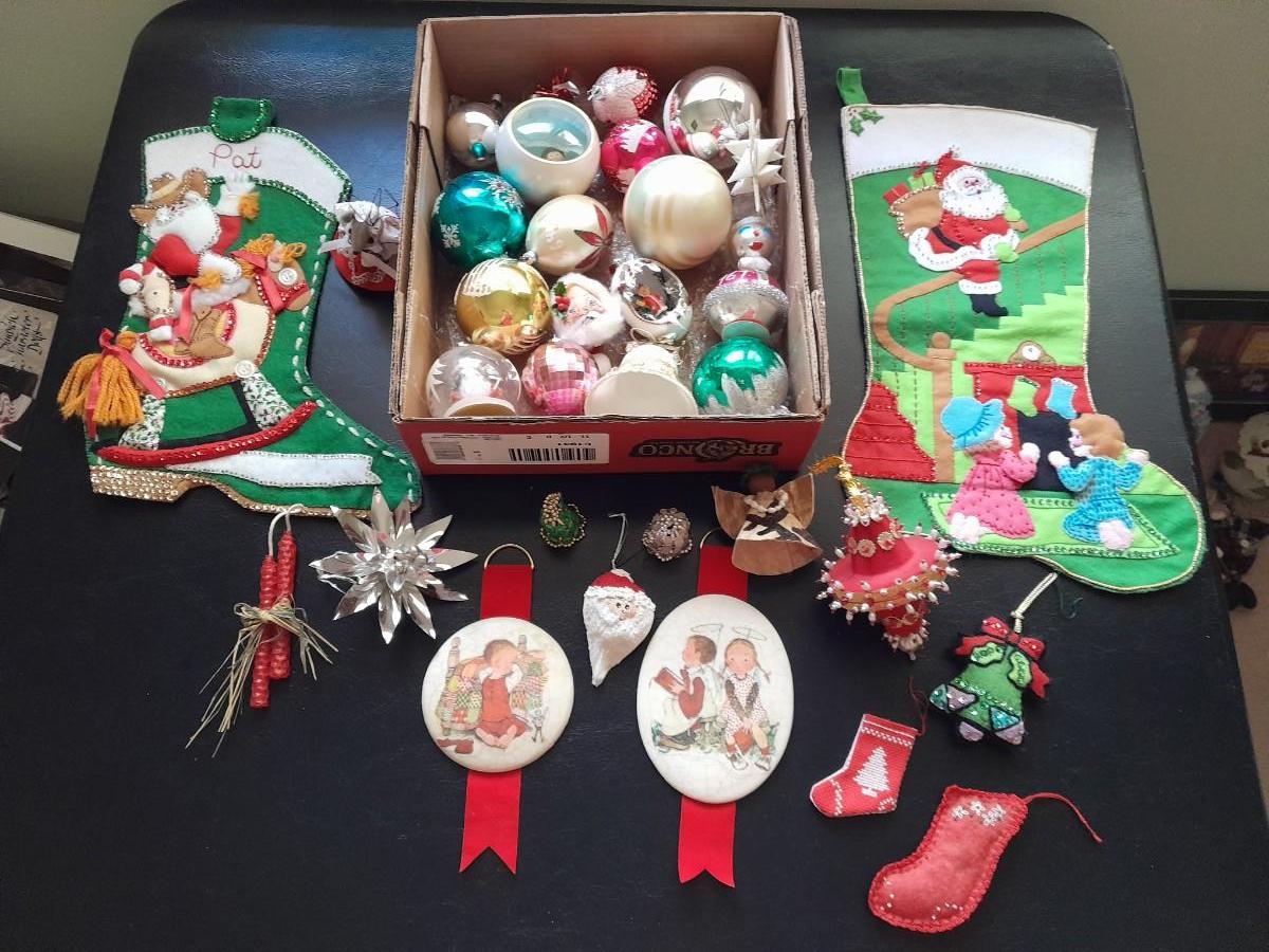 VINTAGE CHRISTMAS DECORATIONS AND ORNAMENTS AND TWO HANDMADE BUCELLIA STOCKINGS, ADORABLE PERSONALIZED PAT STOCKING