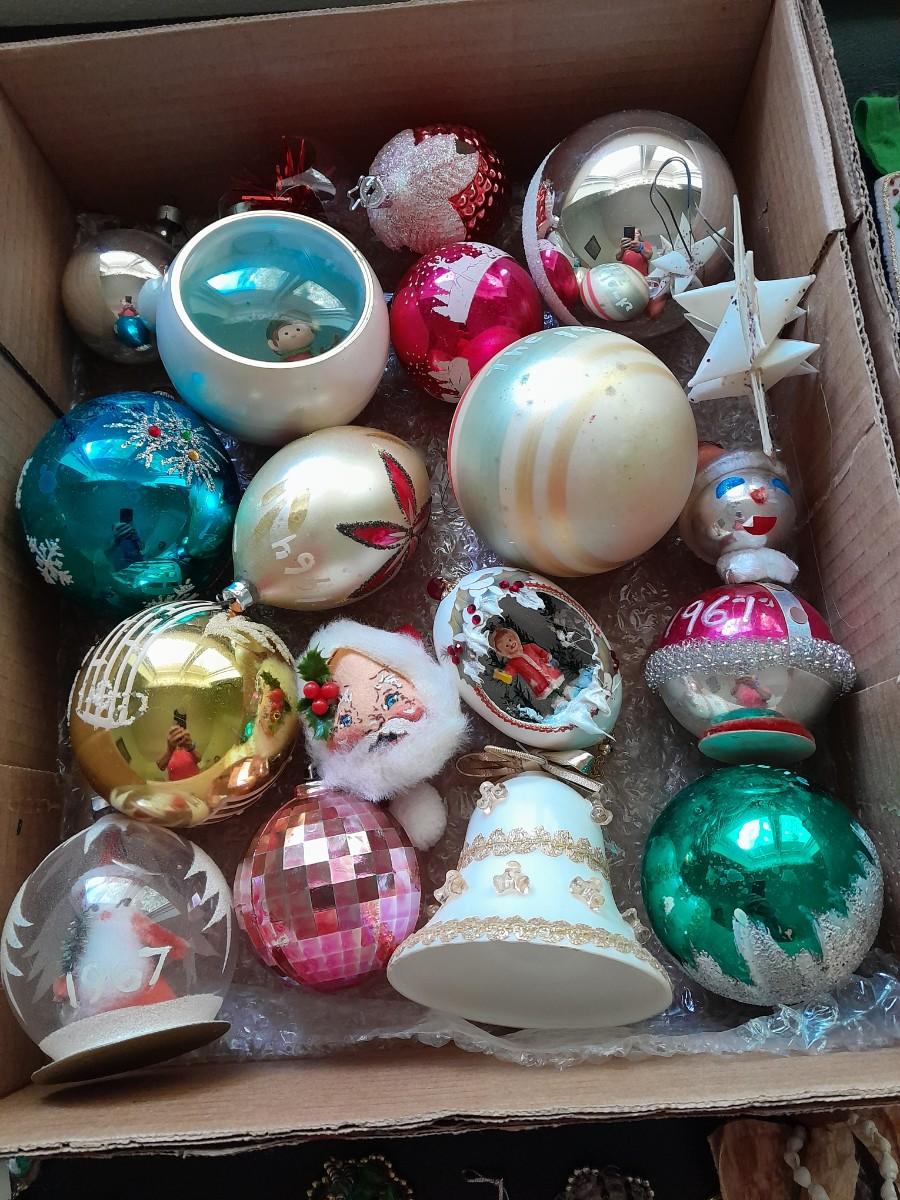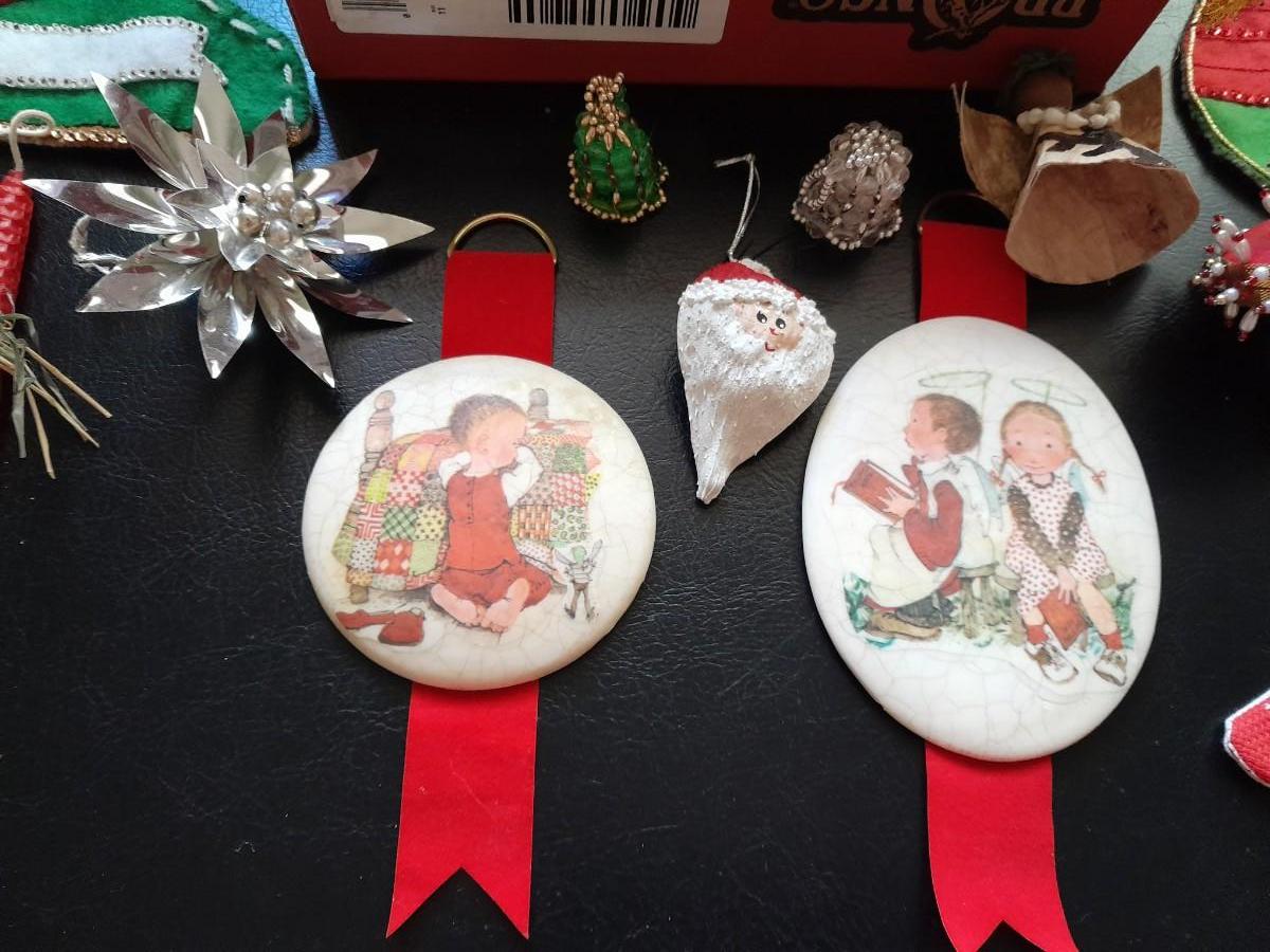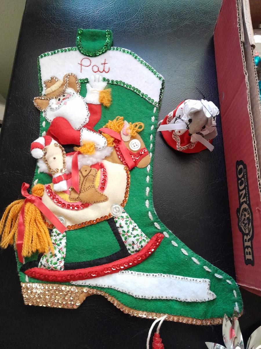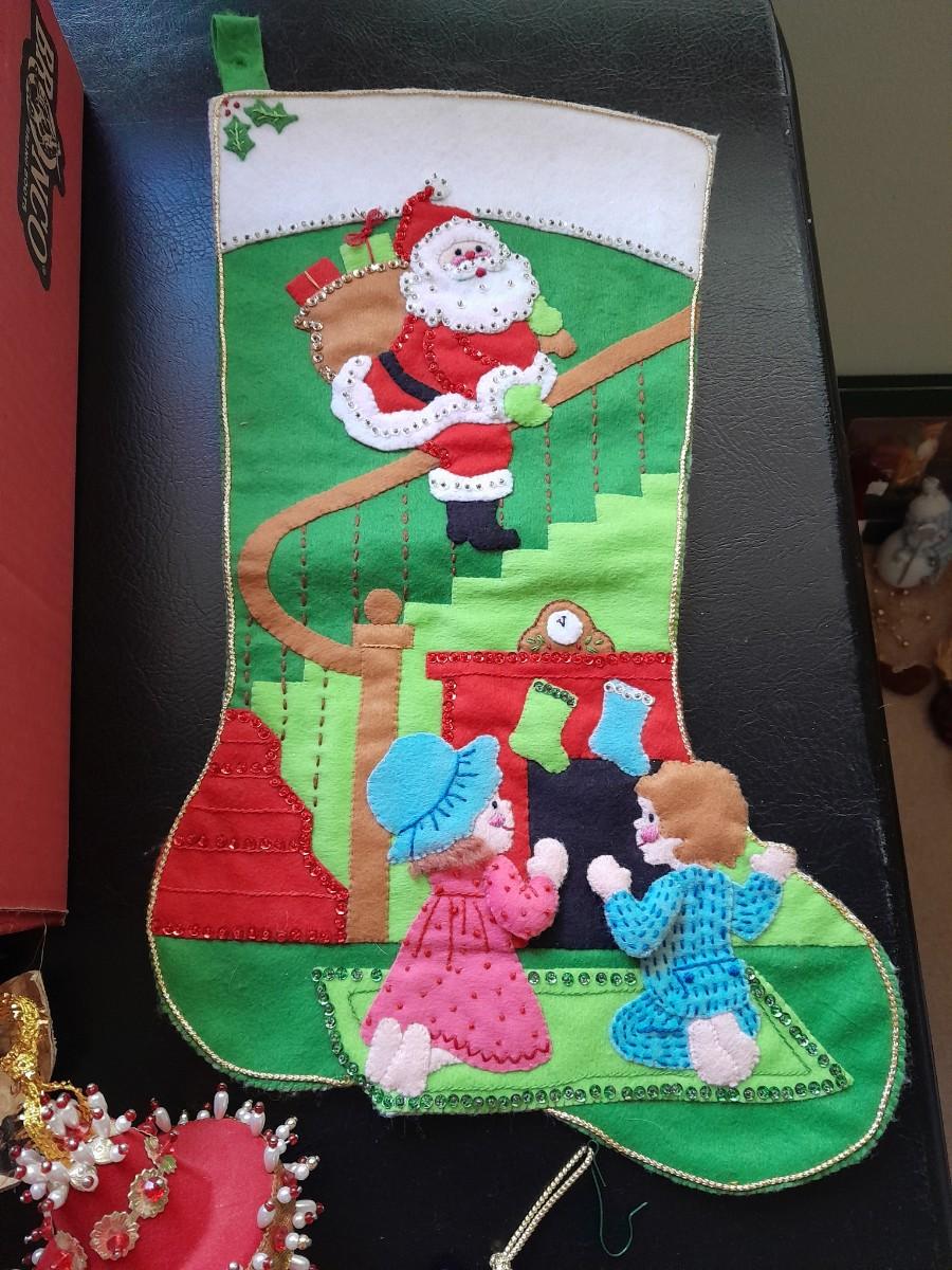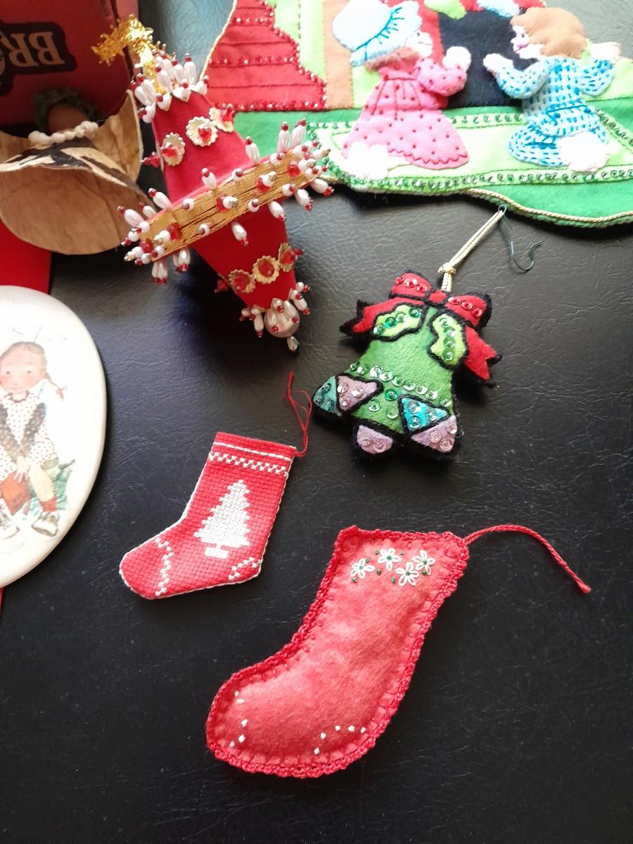 VINTAGE CHRISTMAS DECORATIONS AND ORNAMENTS AND TWO HANDMADE BUCELLIA STOCKINGS, ADORABLE PERSONALIZED PAT STOCKING