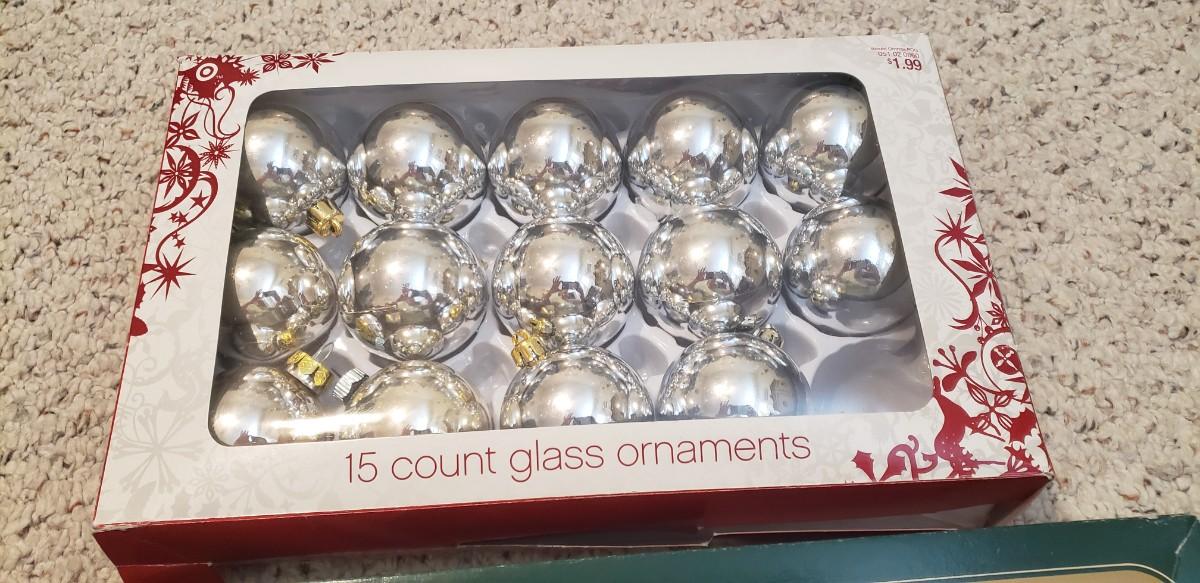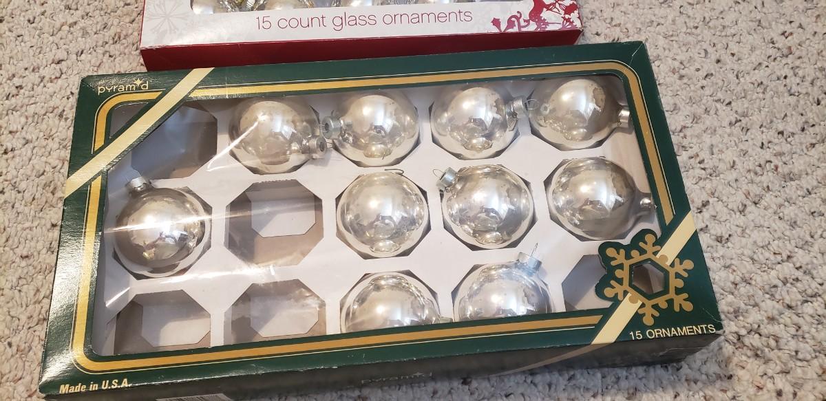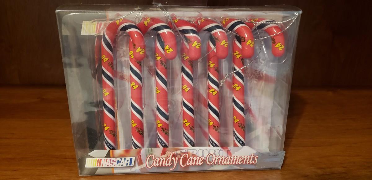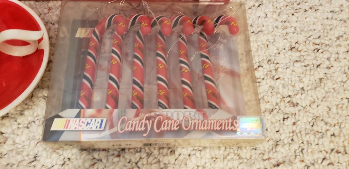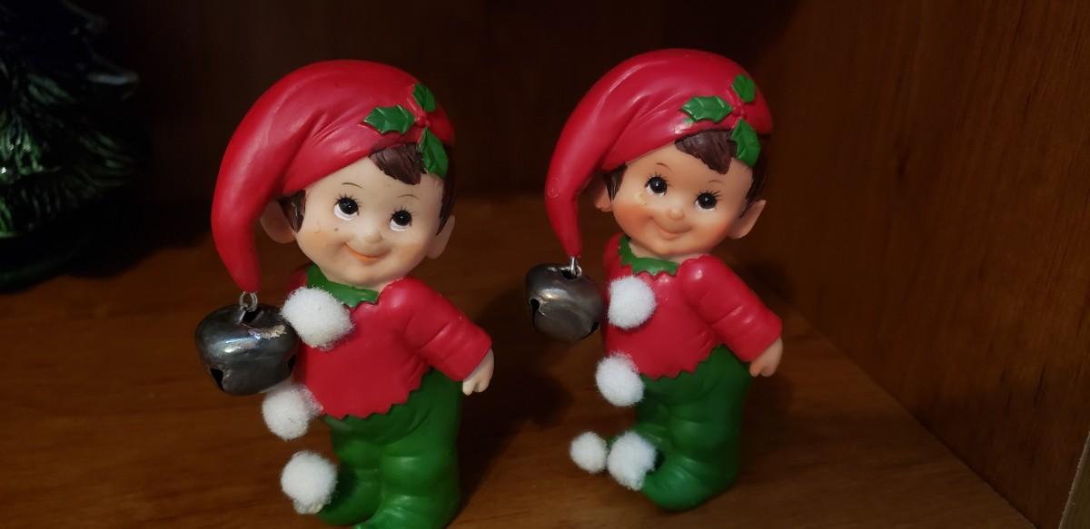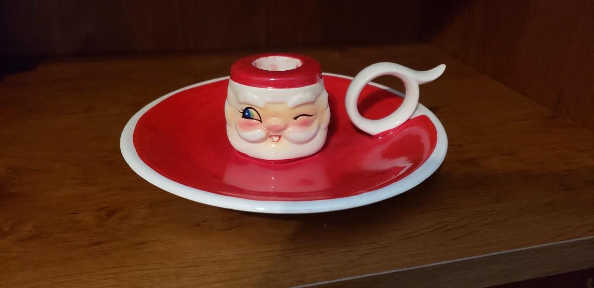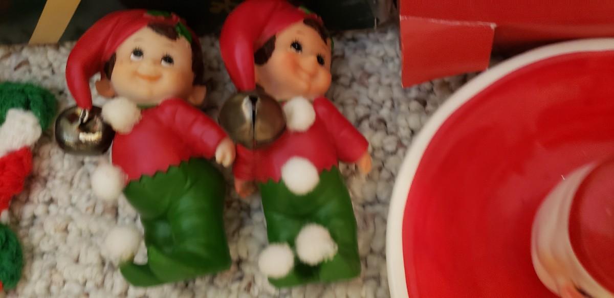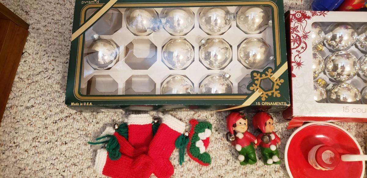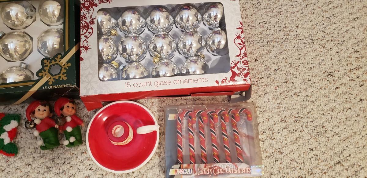 Vintage Christmas ornaments, elves, winking Santa candle holder, knit stockings & Nascar string lights