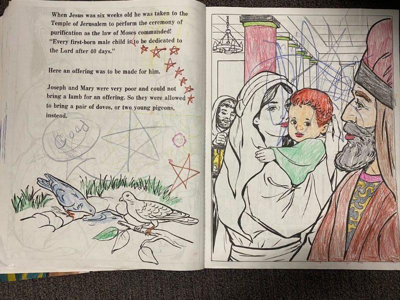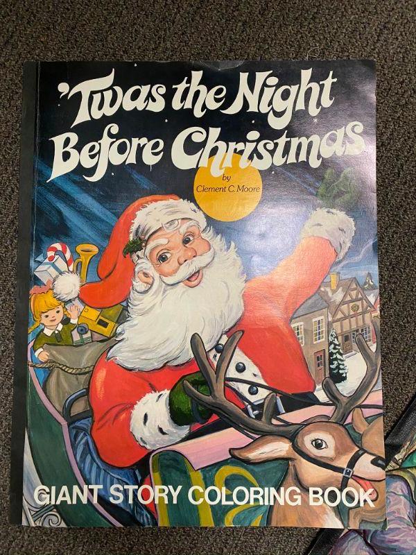 Pair of Christmas Giant Story Coloring Books. "The Christmas Story" & "Twas the Night Before Christmas". The Christmas Story has been colored in but there is a few uncolored pages. Twas the Night Before Christmas is uncolored.