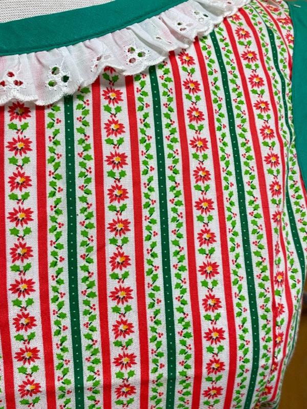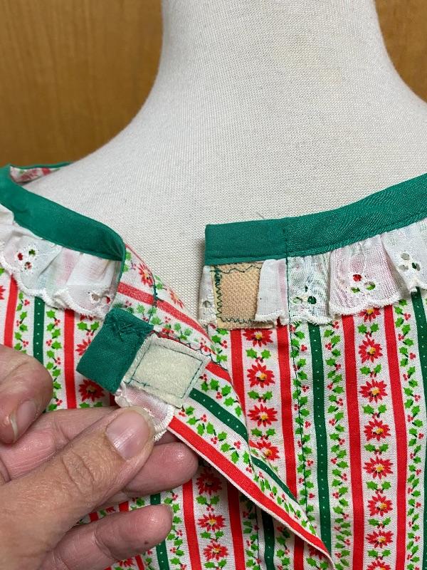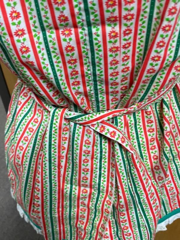 Vintage Christmas holiday smock style apron. Velcro at the neck, tie waist, front pockets. May be some slight yellowing from age, but did not notice any spots or stains.