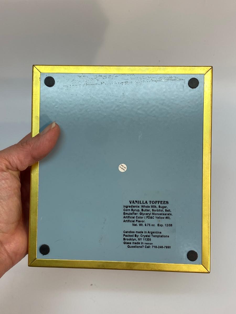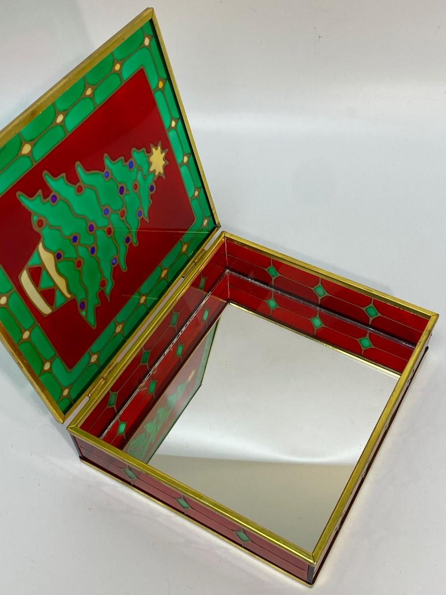 Vintage Christmas Holiday Stained Glass Jewelry Trinket Box. In good condition. Mirrored bottom. Was originally a holiday candy box. About 6x7 size.