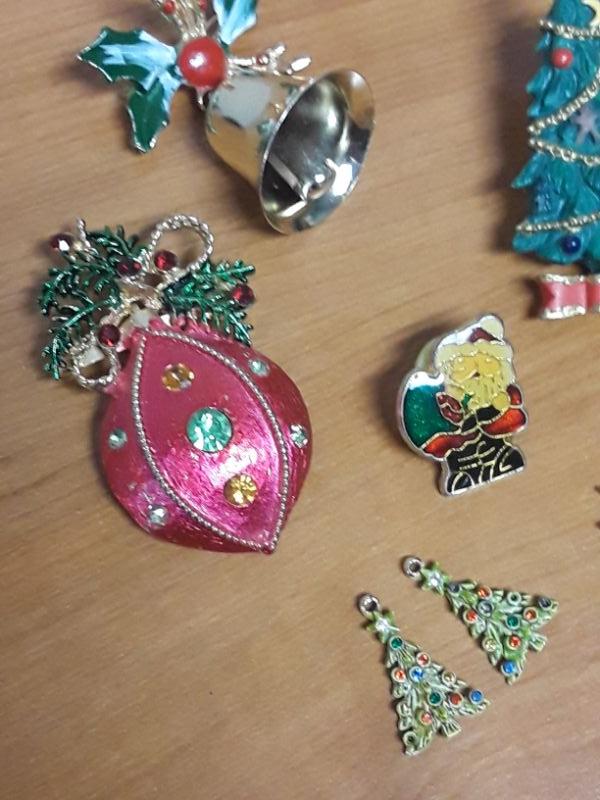 Vintage Christmas Jewelry Lot. 3 Brooches, 1 Pin, and 2 sets of matching charms. 8 pieces total.