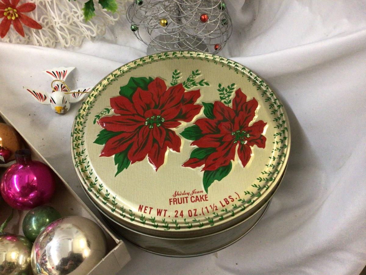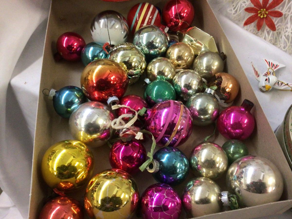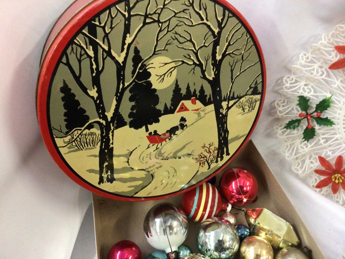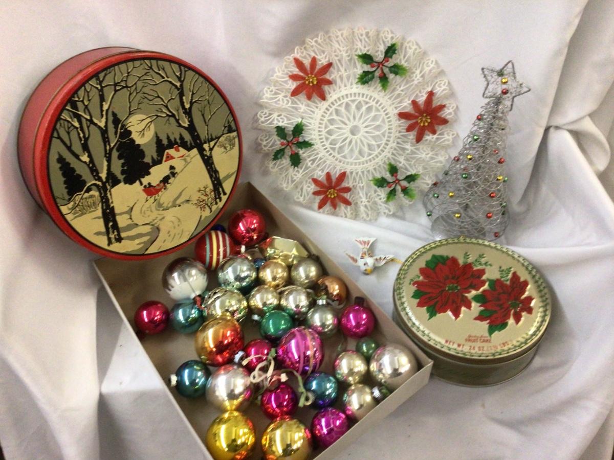 You get this great plastic wreath, a metal Christmas tree, two vintage tins, and a whole box of vintage Christmas bulbs
