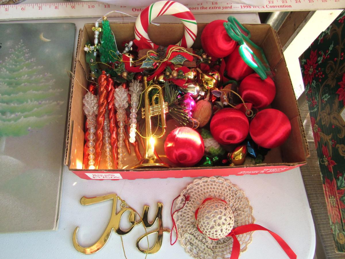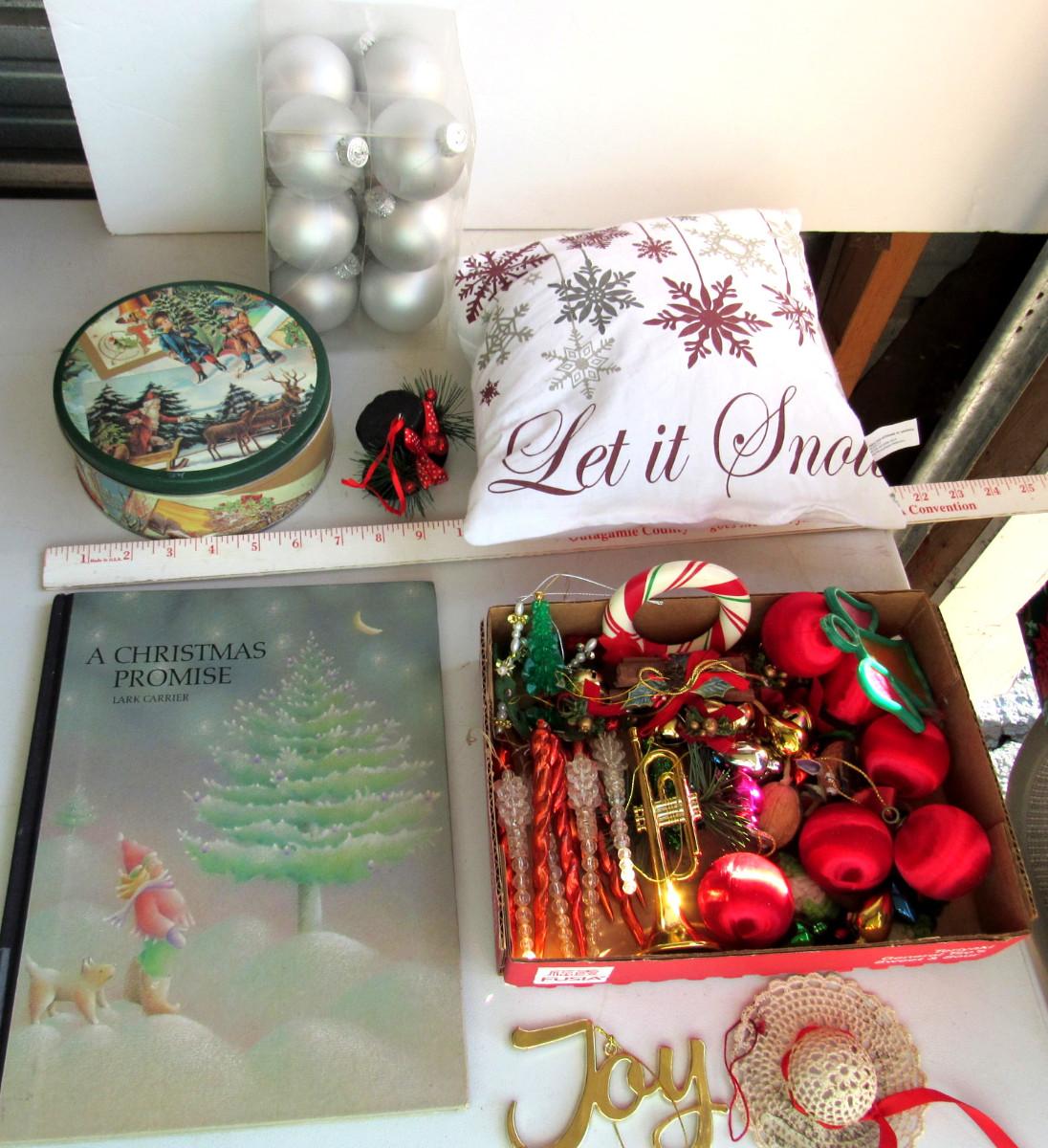 Nice book, tins, ornaments, plastic ball ornaments, pillow. Used but good. Shipping is available at actual shipping cost plus $5.00 handling fee per box for supplies/labor. See our terms for details. All sales are final. Condition notes may not be all inclusive, we may miss some issues as most vintage items are not in mint condition and have some degree of wear, paint loss, etc, but we always try to note obvious damage.