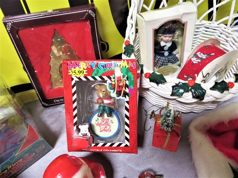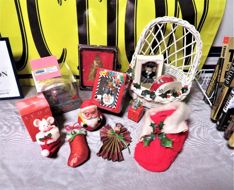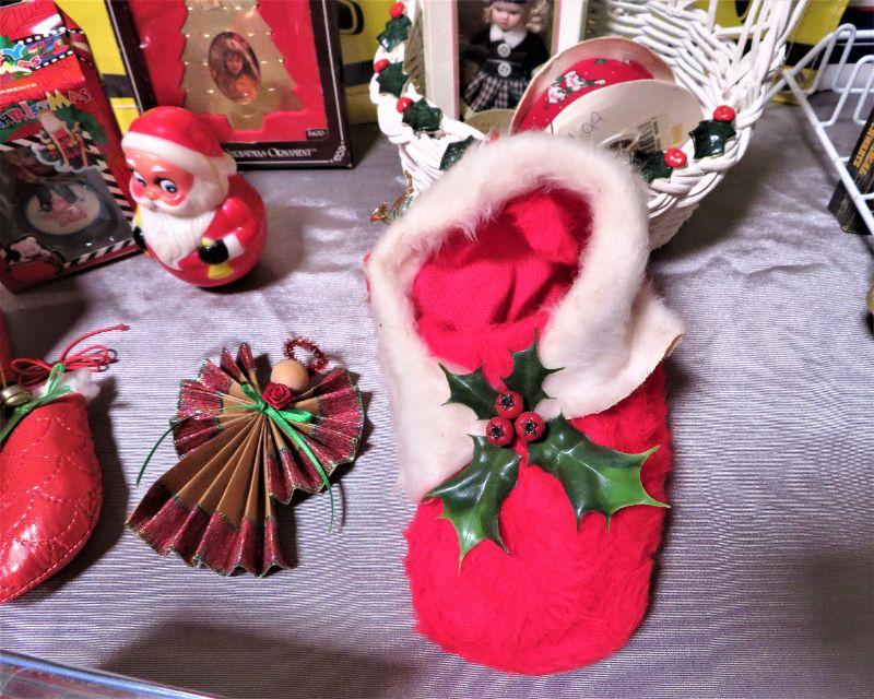 Vintage Roly Poly Santa Avon MA, Dad Christmas Ornament & Decorations LOT. Misc Home Decor with Angel, Santa Shoe boot stocking, White Basket. 3# Shipping.