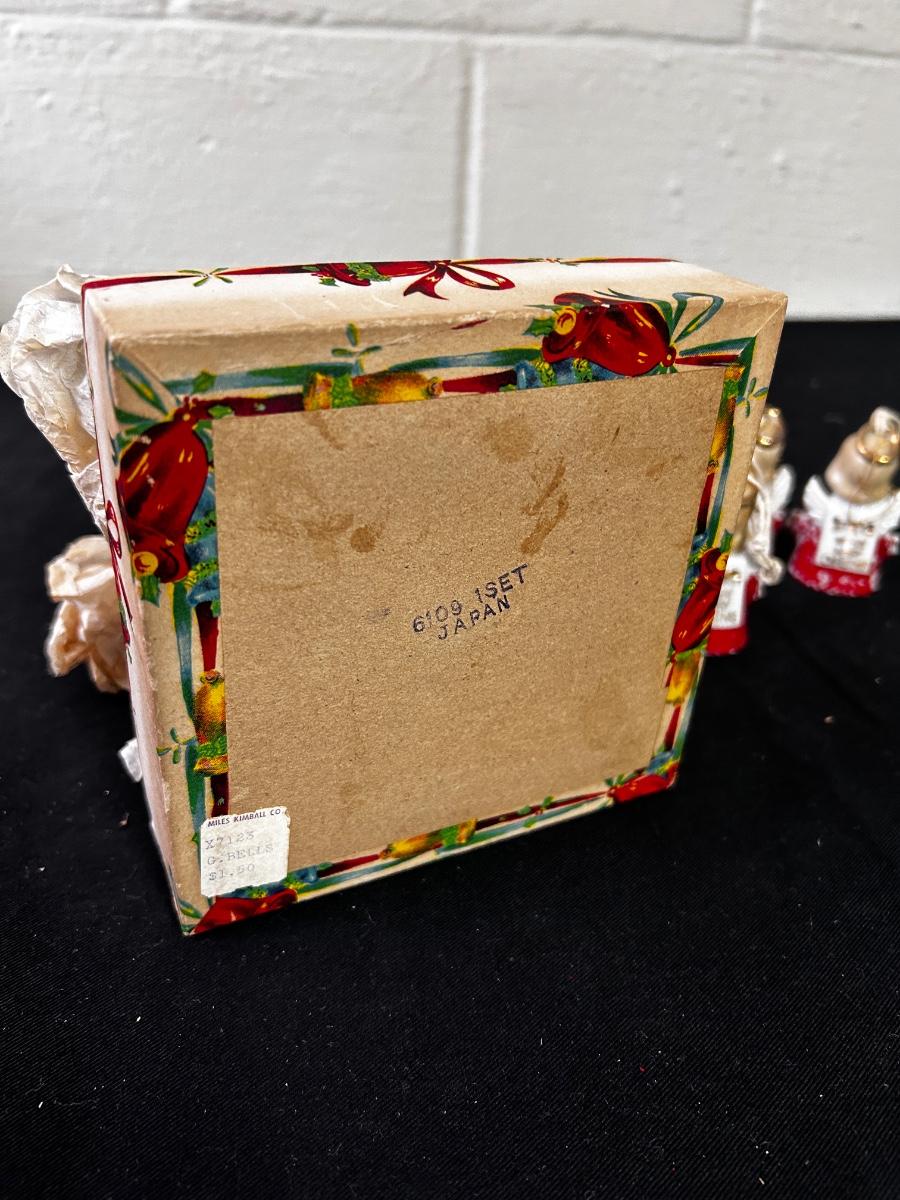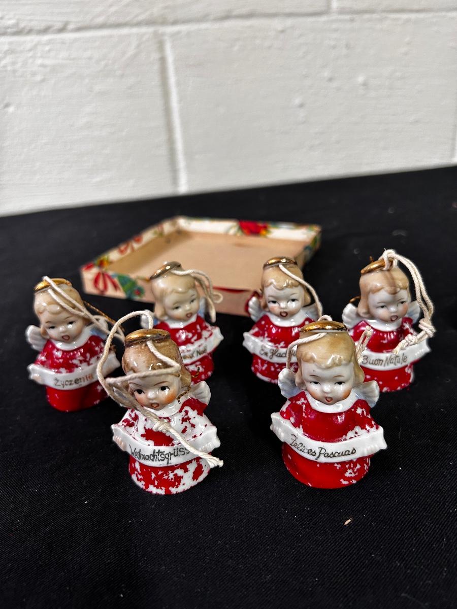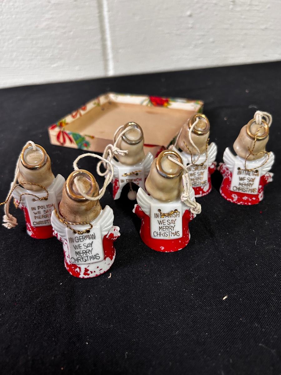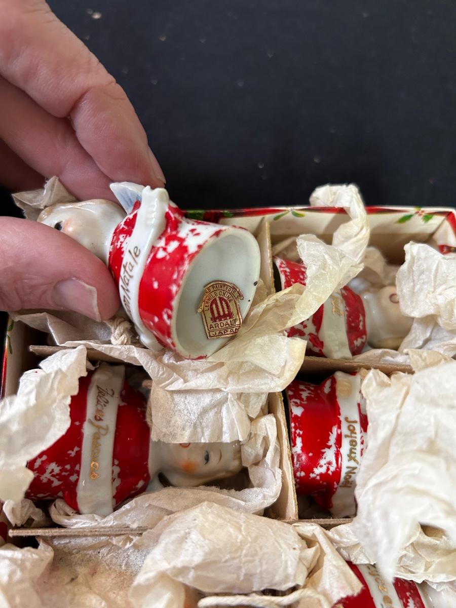 6 Vintage ceramic Christmas ornaments, in original box. Ardalt. Made in Japan. Original box.