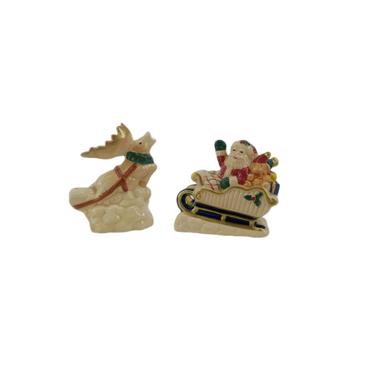 Vintage 1993 Reindeer and Santa ceramic salt and pepper shakers. Marked OCI, made in Sri Lanka. Great condition, but bottom caps are missing. Largest measures L 3" x H 3". Weighs 5 oz. (C121)