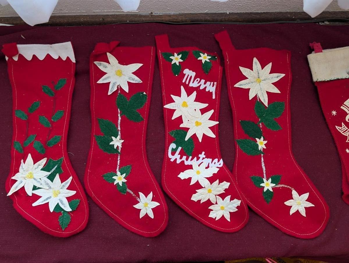 Four felt vintage stockings from the 1950's. with felt flowers on them. two felt stockings with Merry Christmas on them. crocheted little stockings, and a crocheted Christmas door knob cover.