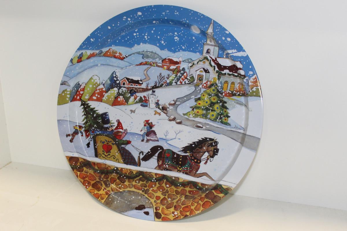 Vintage Christmas Tray Snow Scene Tin Round Serving Tray