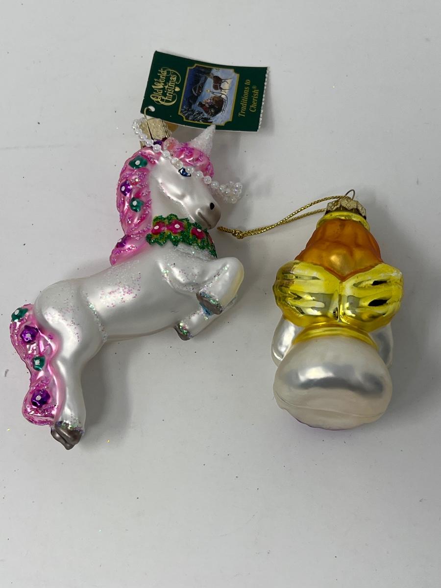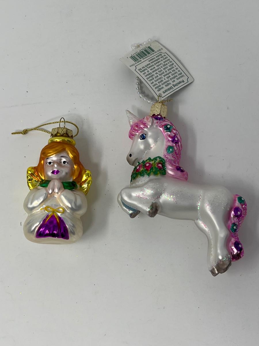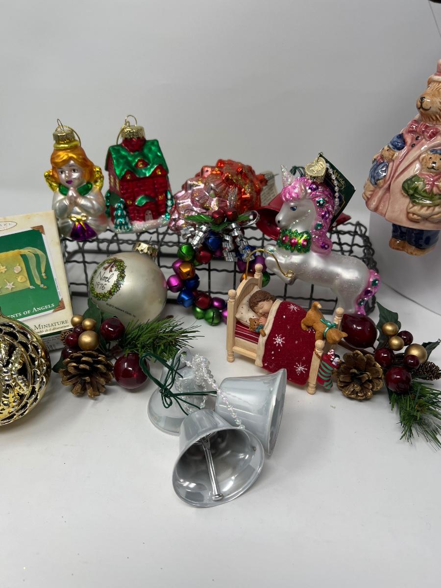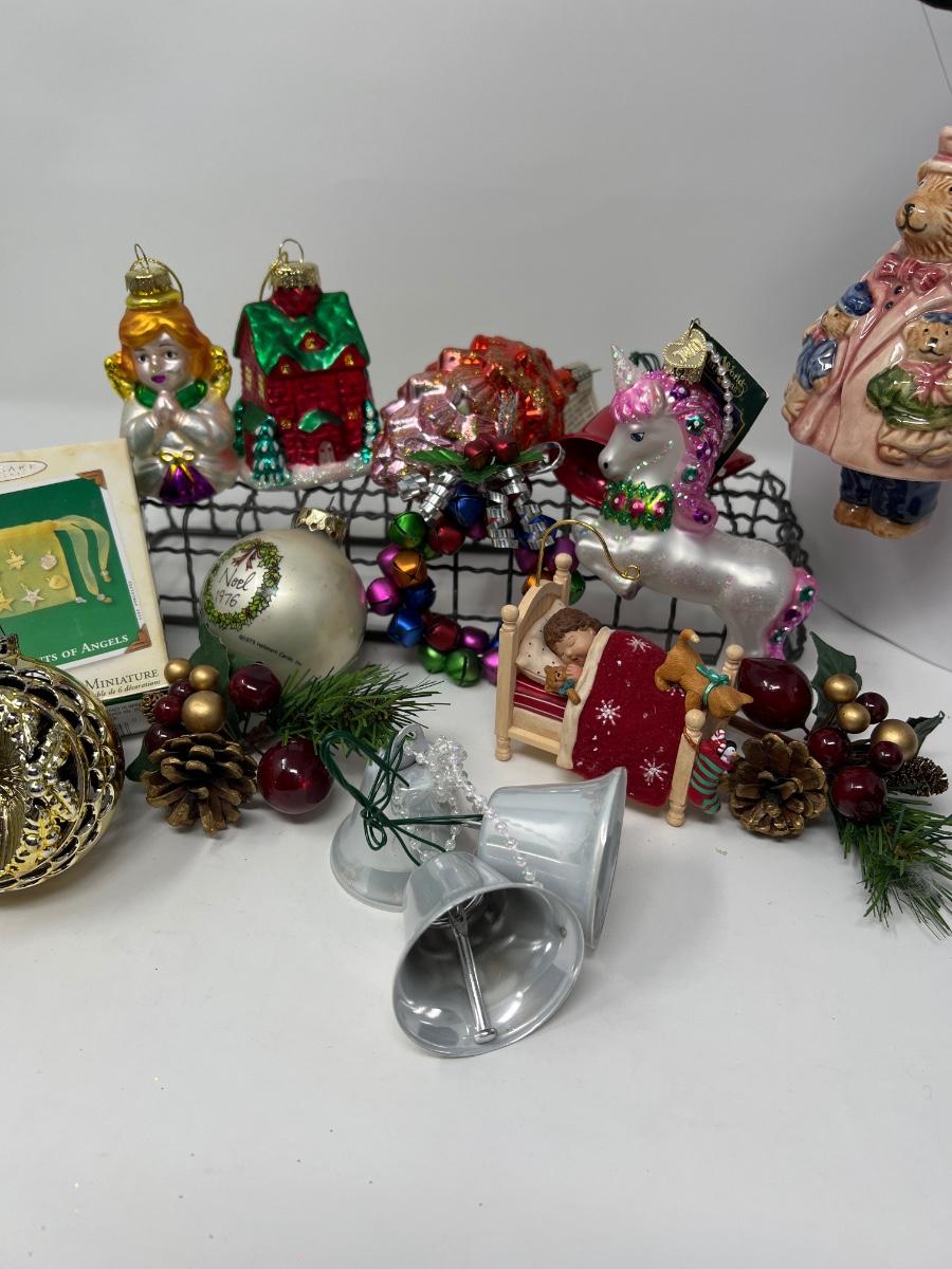 10 ornaments, 6 vintage metal red and white bells, and two gift picks made in Korea. 1973 -1976 ball ornament, Old World Market unicorn, angel, house, and pine cone. All metal bell wreath, vintage plastic cut through ball, Hallmark child in bed, Hallmark Angel’s gifts still in box. 3-4” tall or length..