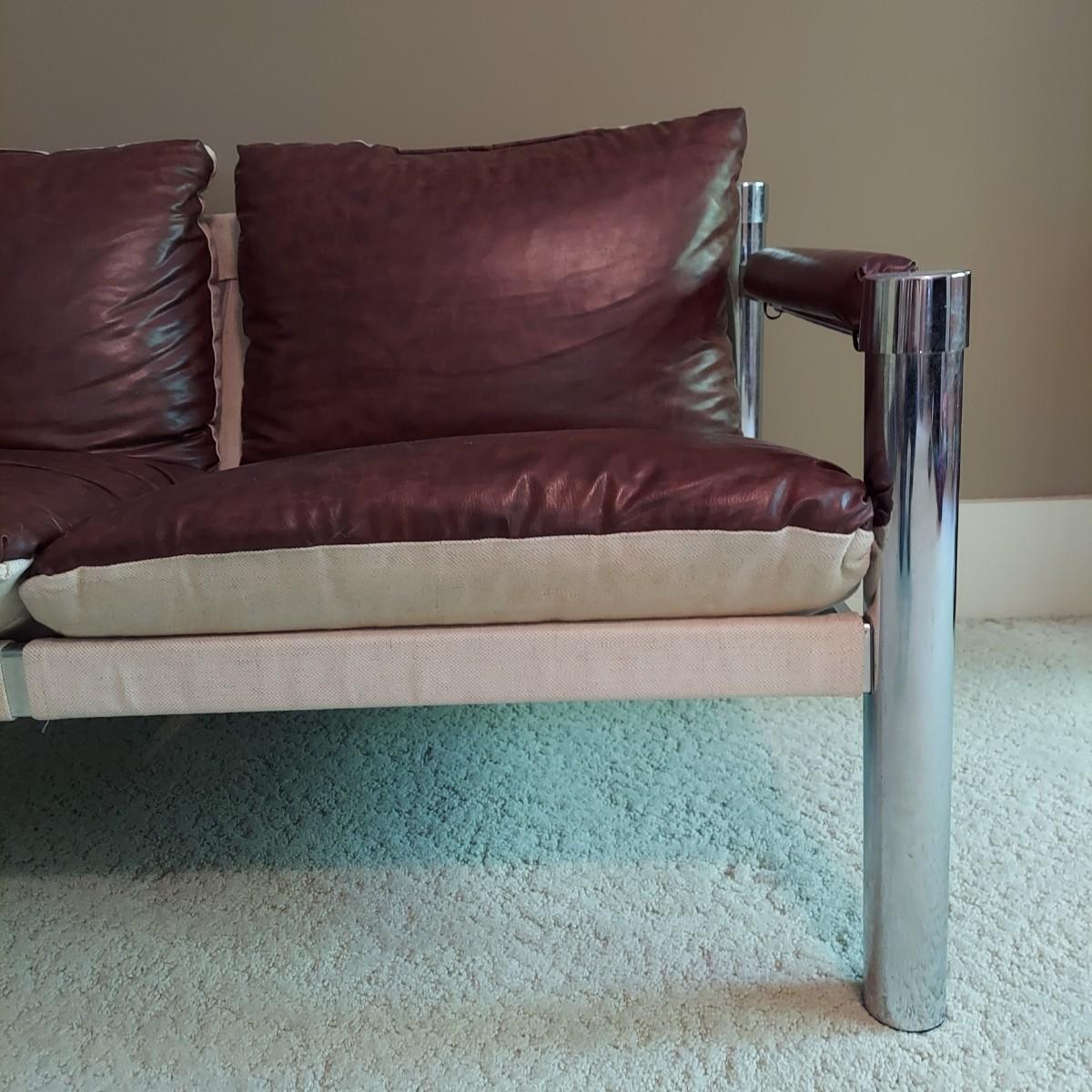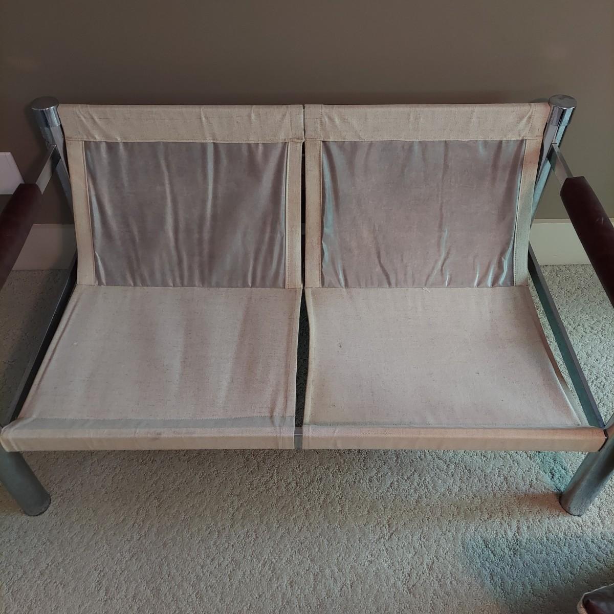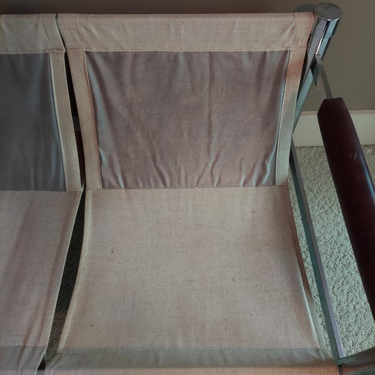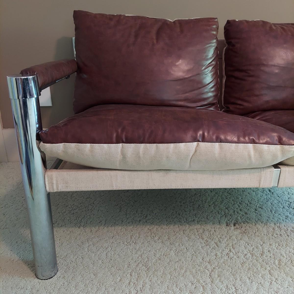 Modern style chrome and leather sling-style loveseat. No visible makers mark. Appears to be vintage based on the build and the wear to the piece. All four cushions are removable. Each has a leather side and a canvas cloth side. There are some spots on the backsides of the cushions. Some of the plastic leg caps are missing. There is some rust speckle on the chrome. Measures approximately 50" x 30" x 24"H with a seat height of 17". Local Pickup Only.